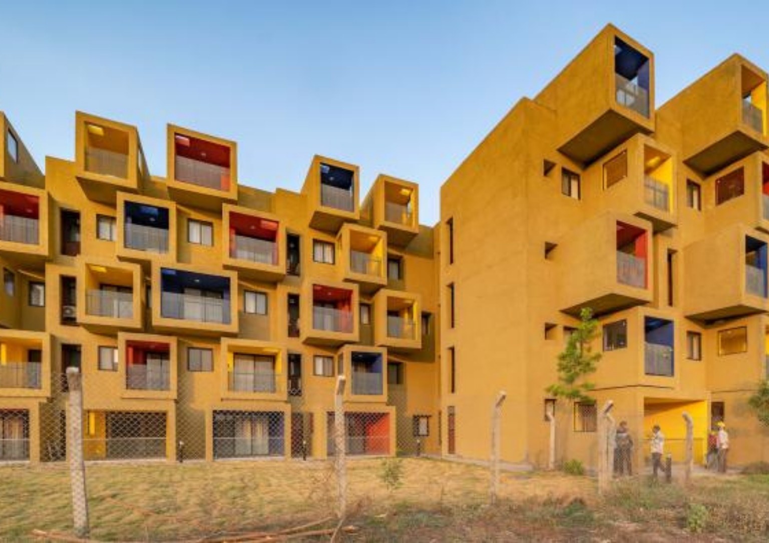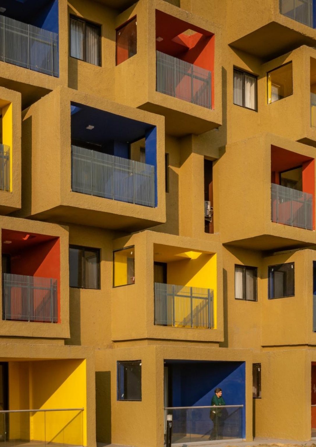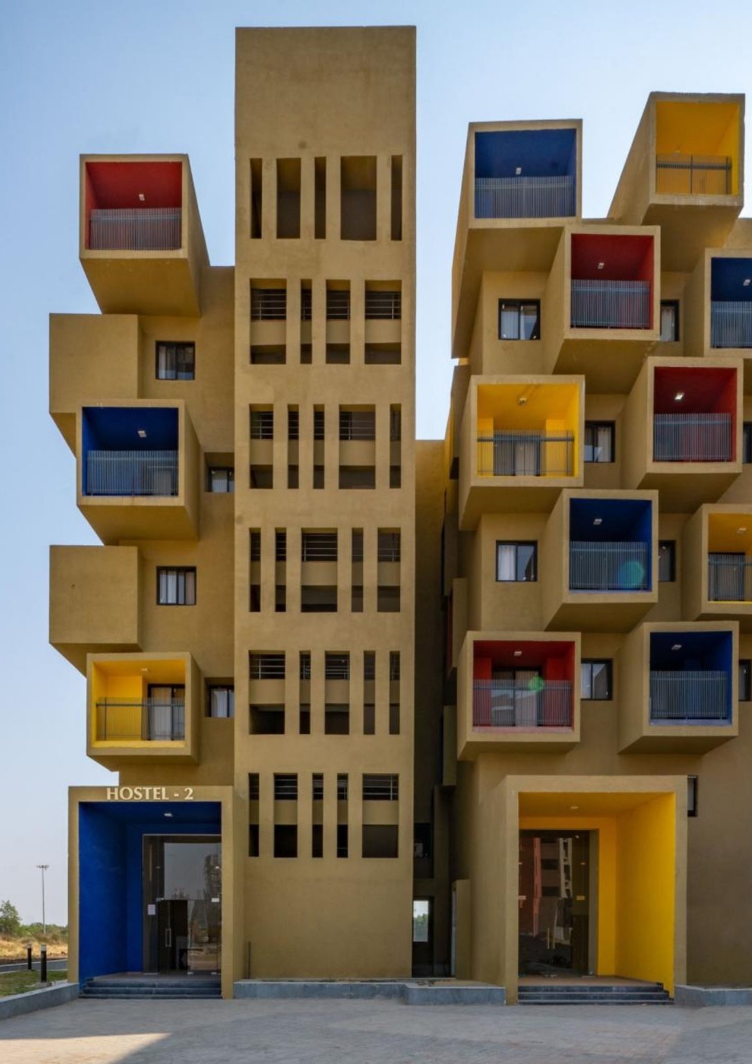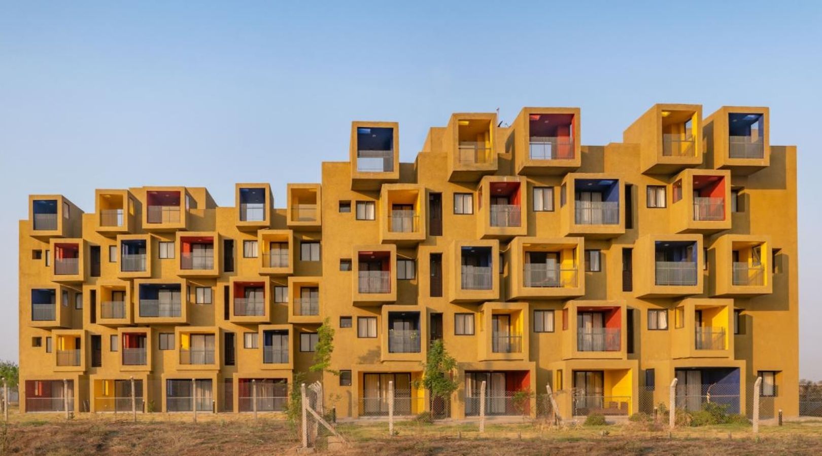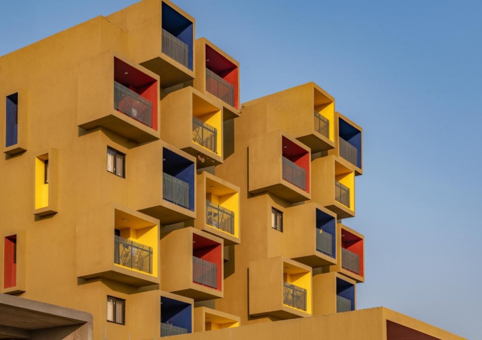 Holi, India’s annual festival to celebrate color shows the country’s love for pigments. Anchored on this idea, Sanjay Puri Architects creates Studios 90 in Kodla, Karnataka. The structure is a stack of colored cuboids representing Indian culture through the use of the richest primary colors. Red, blue, and yellow coat the cantilevered balconies of each apartment. Yellow-ochre is the structure’s most dominant shade hinting at the country’s most common food hue. The creative use of colors forms an exceptional identity for this residential project.