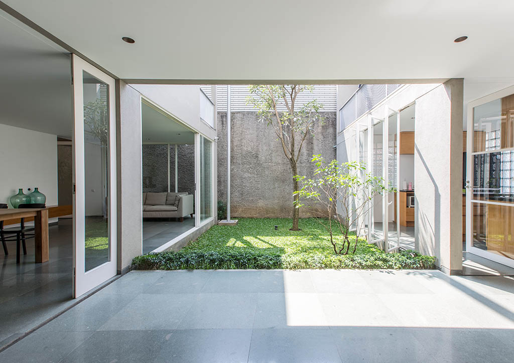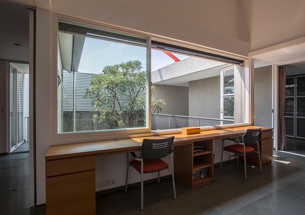 The layout is a simple C-shape around the green void, with transition spaces located on the longer west edge. The kitchen volume to the east and service block to the west and the corridor which leads to the main door. Walking through the foyer leads to a veranda parallel to the courtyard where the family can set up for al fresco gatherings. Further along is the volume containing the dining and living areas as well as access to the stairs. On the second door, the master bedroom and son’s bedroom are in the rear and front volumes, respectively. A study room that doubles as a family room and library occupies the space in between. Small terraces for each bedroom provide overhangs for the windows that open to the green space at the core of the house.