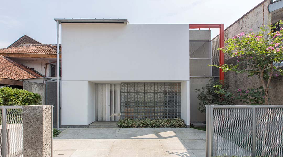 The road to the house can only accommodate one small car at a time, indicative of how modest the lots are in the neighborhood near downtown Bandung, Indonesia, a city planned by the Dutch who once ruled the country. In the alley populated with clay-roofed houses with pokey gates, street food vendors, and motorcycles, Tan Tik Lam’s composition on a 186-square-meter lot hails attention with its boxy façade and red silhouette detail. Even more striking is the compactness of its layout, which still manages to incorporate setbacks, sneaky openings, and a courtyard for passive cooling.