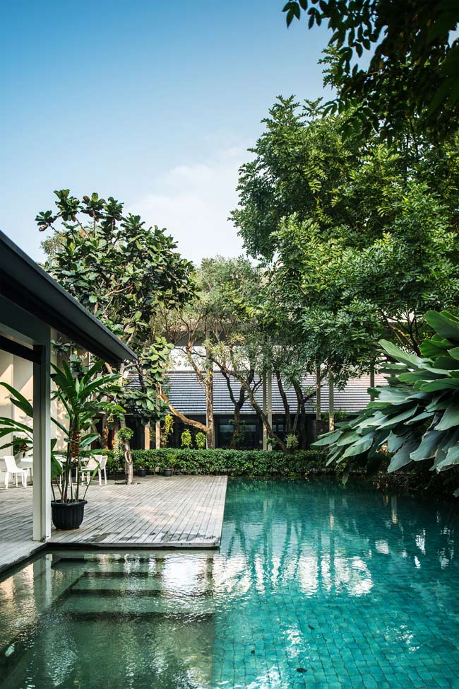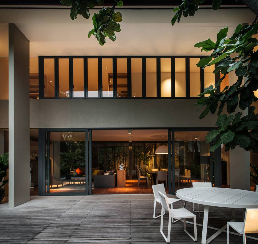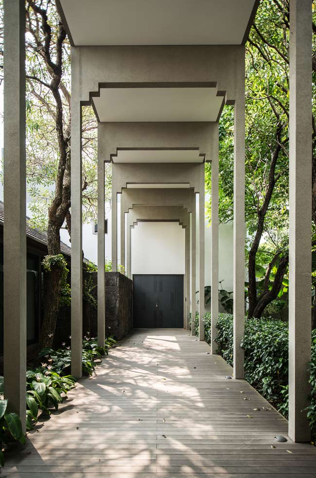 “The owner wanted a forest-like entrance, which is why we decided on this tall corridor,” said architect Tan Tik Lam. Slender columns echo the svelte trunks of nearby trees. The rhythmic arrangement of the organic and the rectilinear is also impressed on the decking as shadows are cast throughout the day.