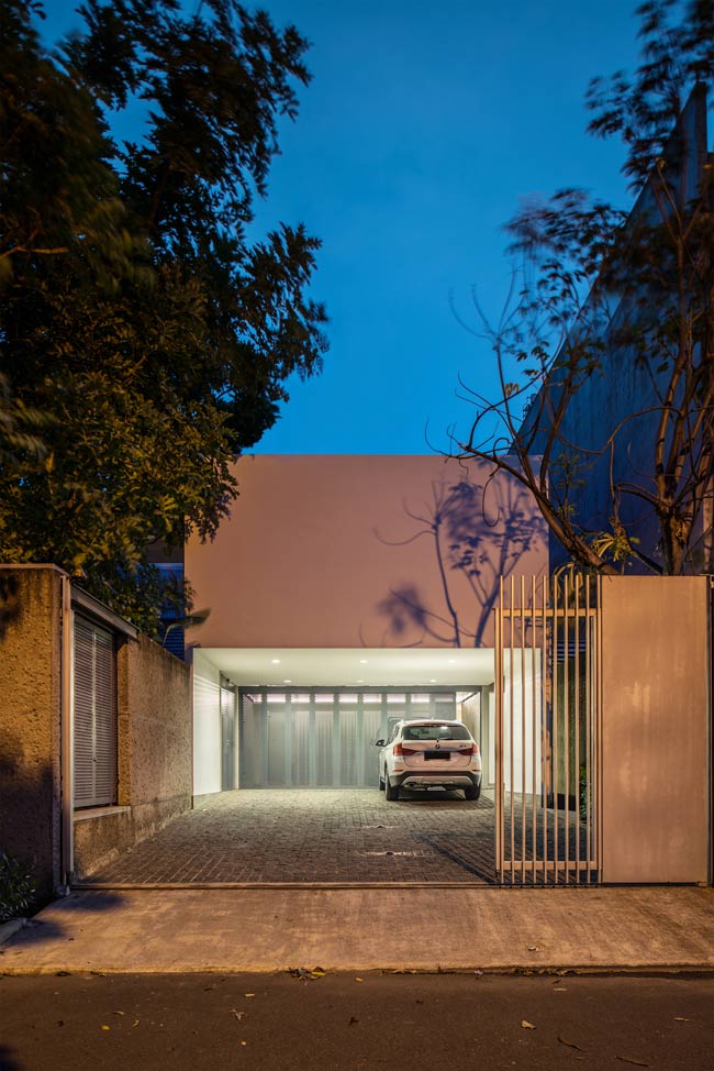 Tucked in a corner of a small residential development in Jakarta, the house is set back generously by at least 12 meters from the street and shrouded by wild banana plants lining the perimeter wall. It stands on a 1000-square-meter L-shaped site, a composite of two lots. One enters the premises through gray laser-cut steel doors on the left side of a white boxy garage separate from the main house structure.