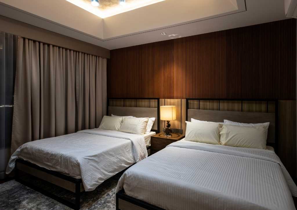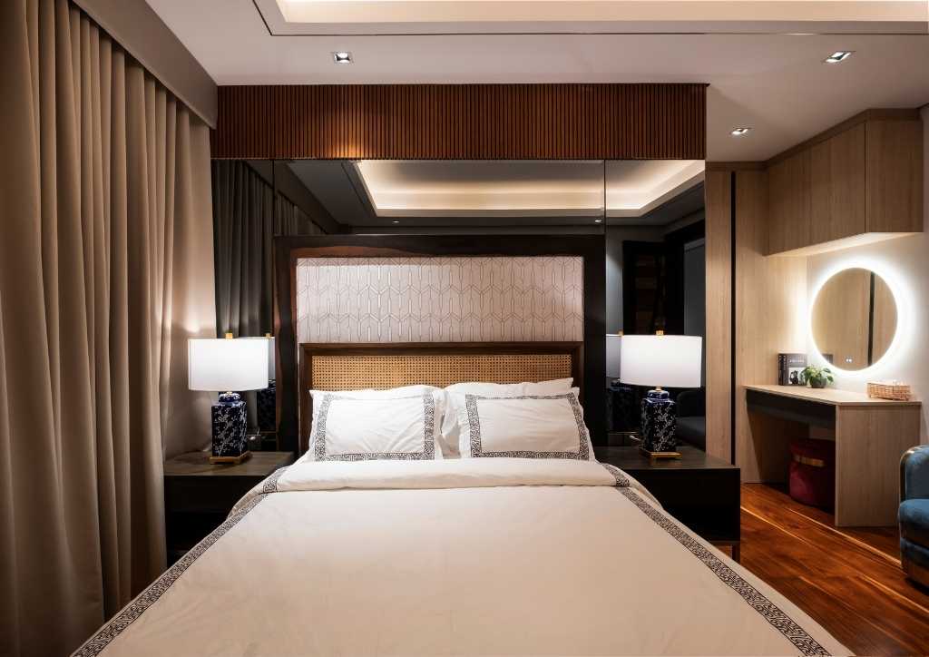 Each bedroom has a different design. The clients are hands-on in choosing materials, colors and furniture. Some furniture and most of the accessories are bought and shipped from China. The Master Suite has a lounge and wide balcony overlooking the pool.