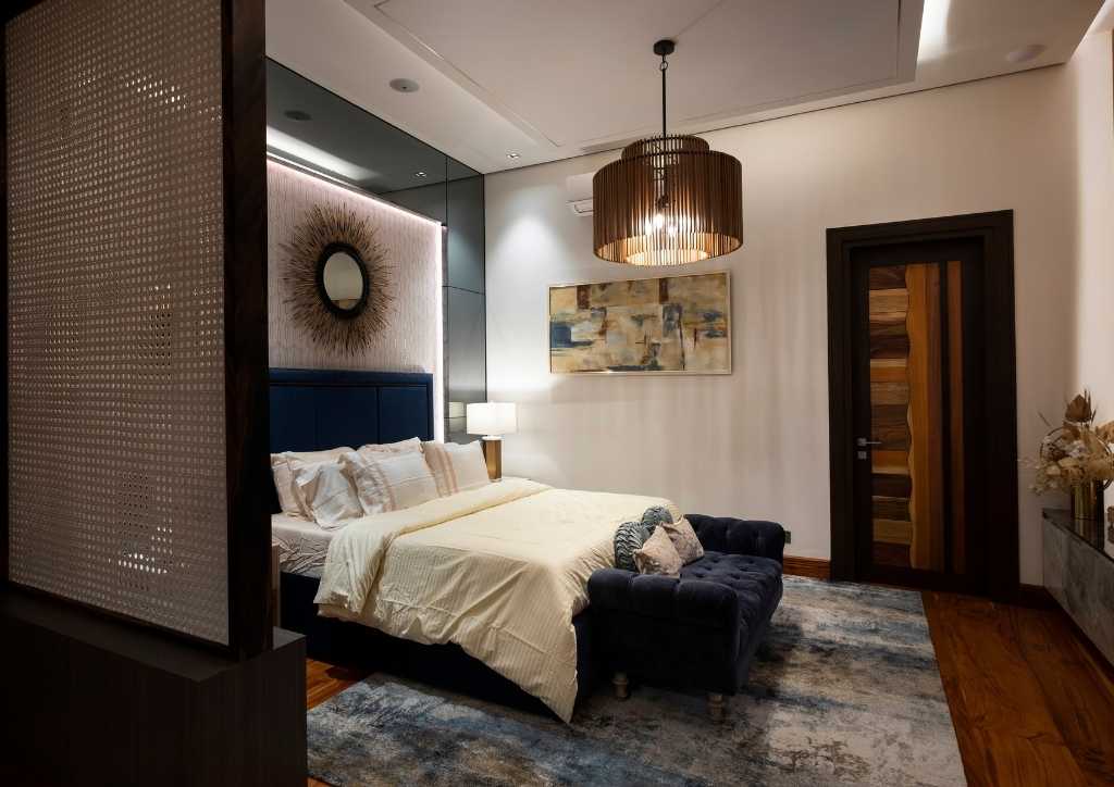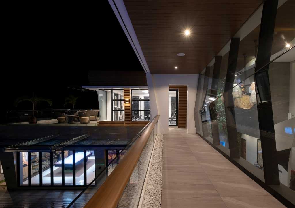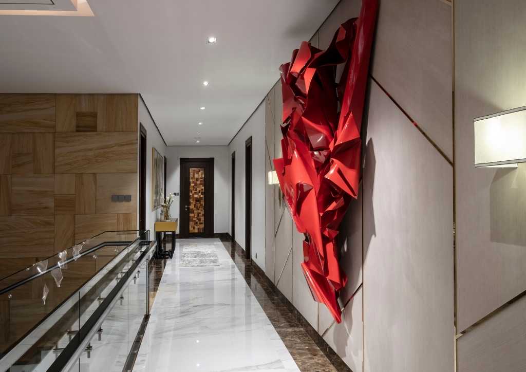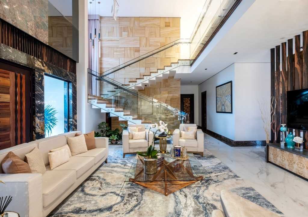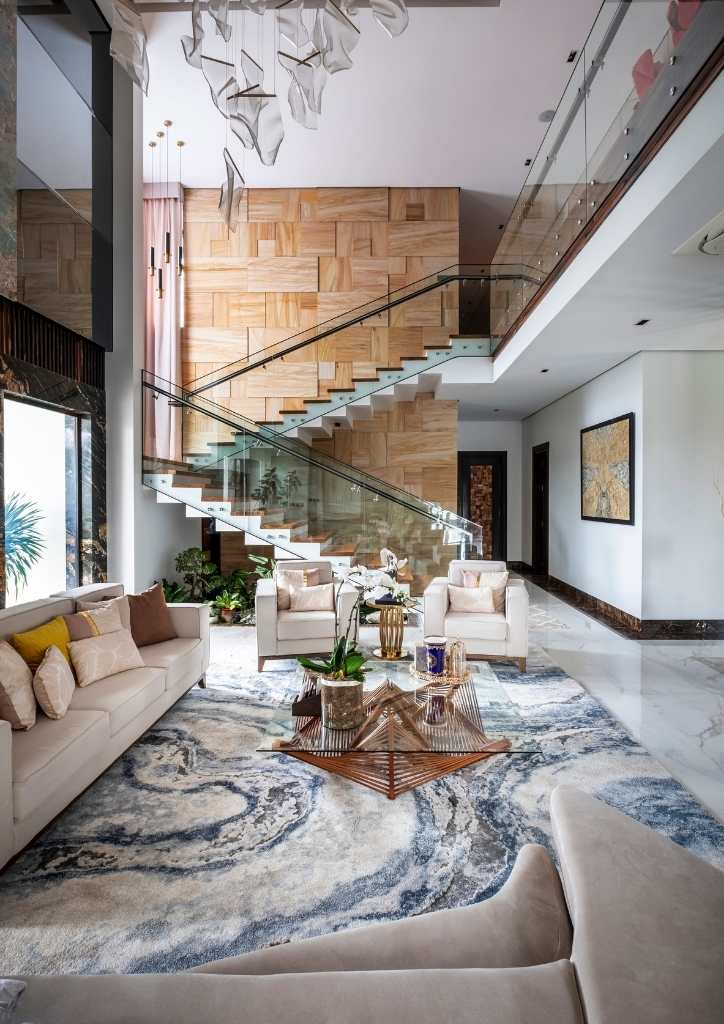 The client preferred an open plan and spacious areas. From the drop-off, a portal finished with Ma-Gurgin, an exotic stone from China, with a double swing panel door made of different natural wood that would welcome any guest.