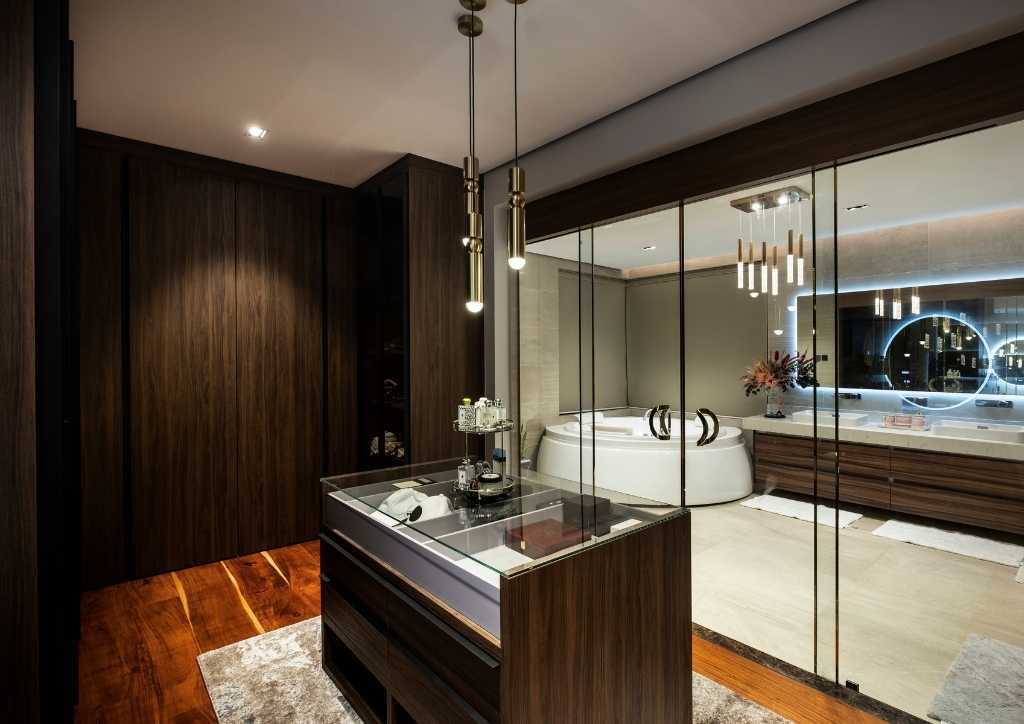 The scale of height of the living room will reveal the openness of the plan and how it seamlessly integrates the outdoors to the indoors. Solihiya accent is also present. Stone quartz mixed with a black mirror and Kamagong slats completes the backdrop of the space.