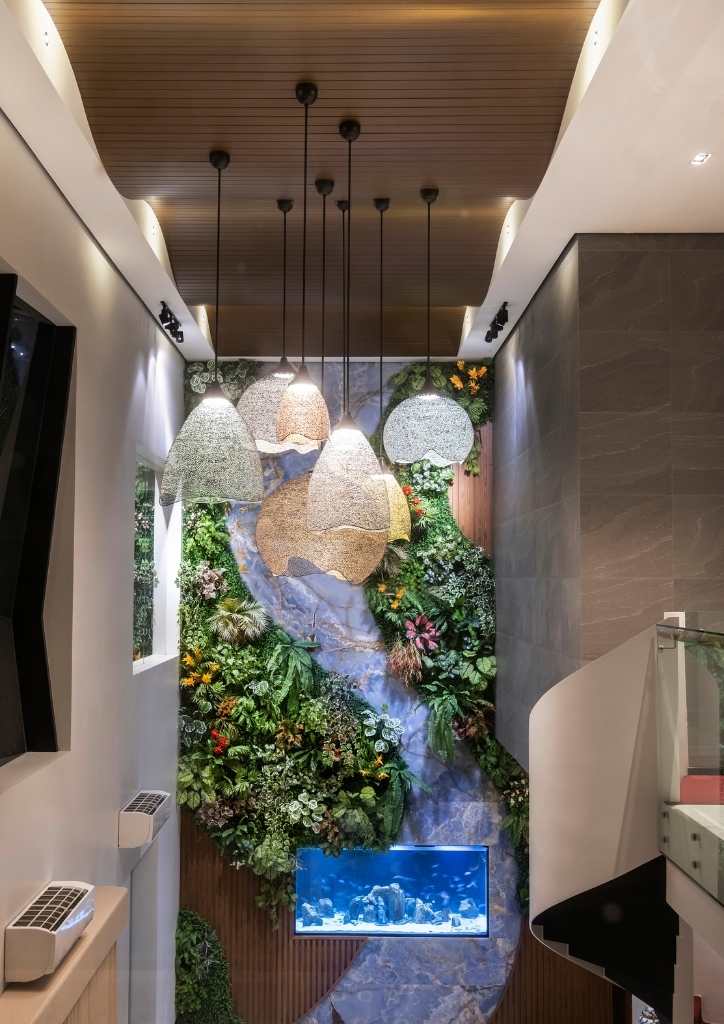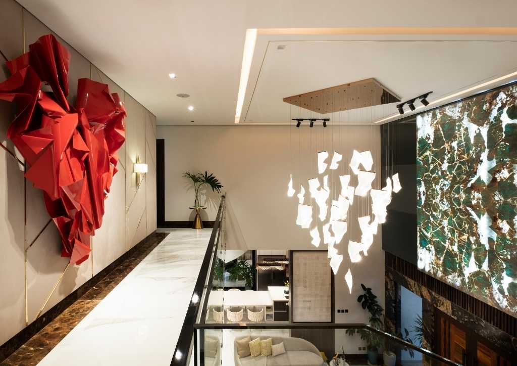 As you enter the foyer, tetrahedron wall art, Sage of Kenneth Cobonpue and an artisanal lamp will greet you upon entering the house. On the right side is an exotic stone from China.