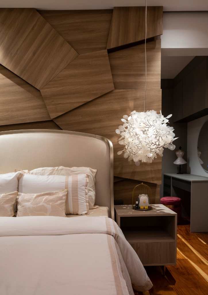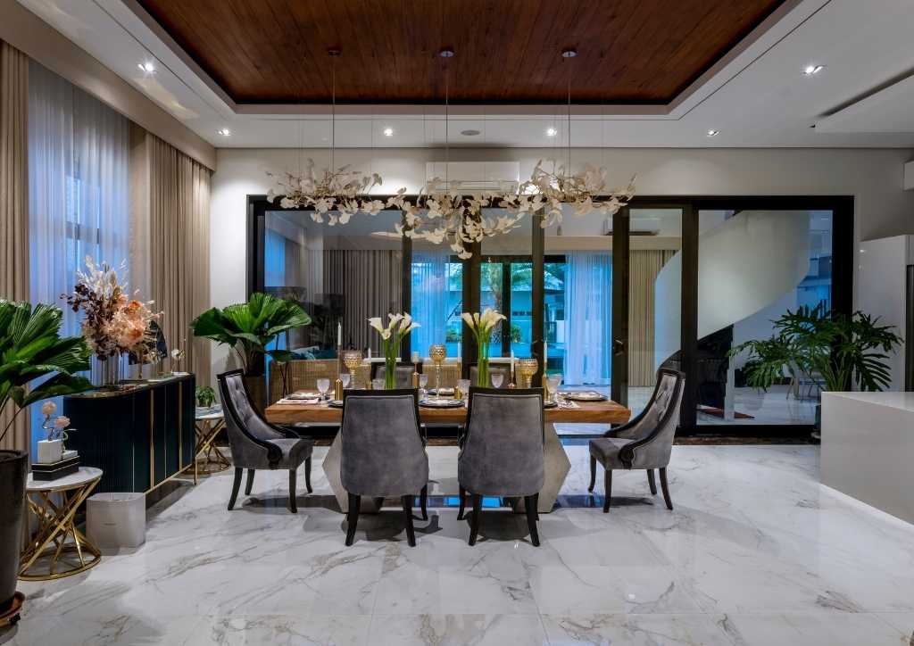 At the dining room, a four-inch-thick acacia wood with natural pen shell design running at the center can be found. A delicate and graceful piece light up the space.