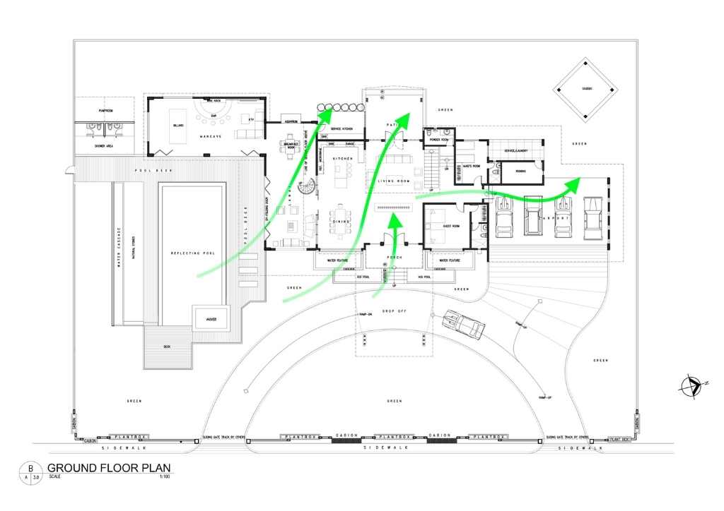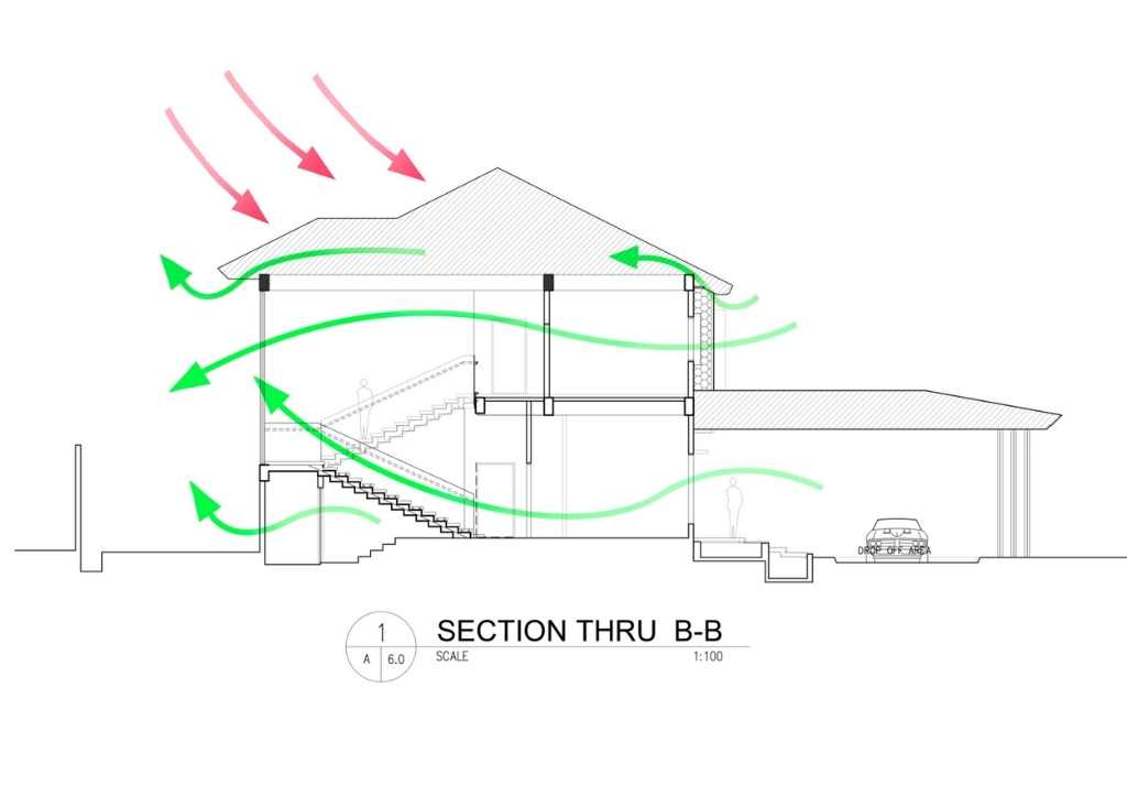 Awning type windows are also inspired from the backrest of the seat of the Butaka, which is made of solihiya weave to allow air to pass through. Awning windows work on tropical countries because of their angled design opening upward preventing water to come in even when it rains. The house is designed with cross ventilation, including the roof and has wrap-around eaves vent to allow air to come in and push the hot air out. On the ground, Landscape Architect Vince Lim took charge. The landscape, lush greens, trees and plants were designed and strategically placed to help filter the hot air and bring colors to the surrounding that pleases the eye.