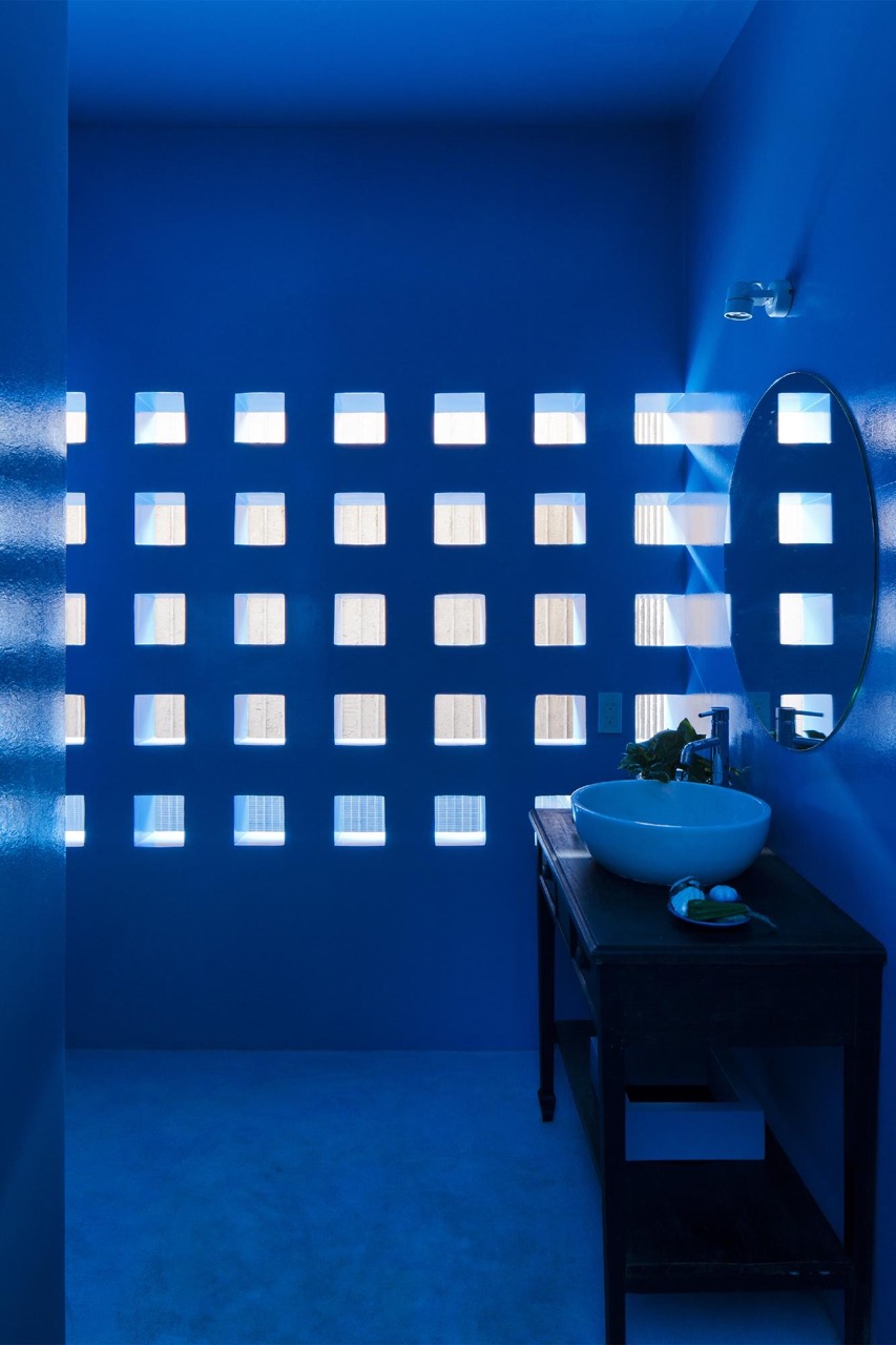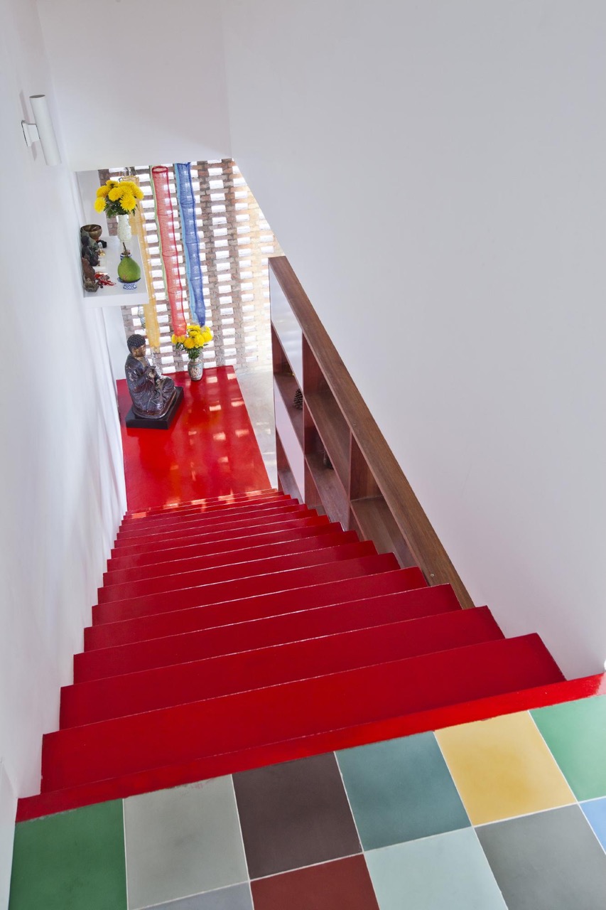 The perforations of the brick walls, specifically along the staircase and living room, form gaps that speeds up the incoming breeze. The unobstructed staircase allows air to easily circulate along the vertical axis of the home. Placing such devices along central areas allows ventilation to permeate throughout the rest of the home.