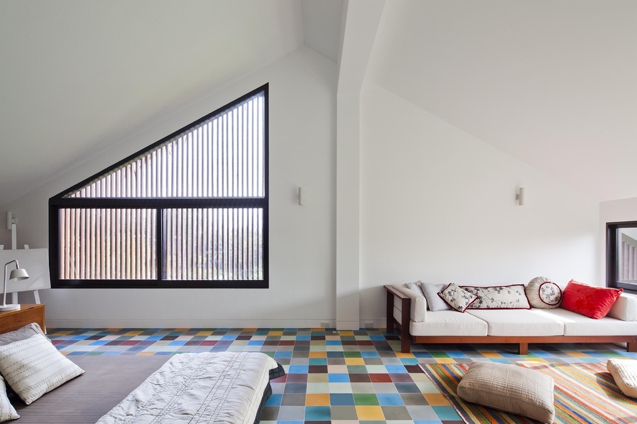 A dominant use of bare concrete is paired with cream-colored finishes. Brightly colored floor patterns accent this monotone shell as they feature a diverse set of colors on the third level. The stairs and bathrooms also display a knack for a strong use of singular colors as well that completely contrast the more natural features of the home.