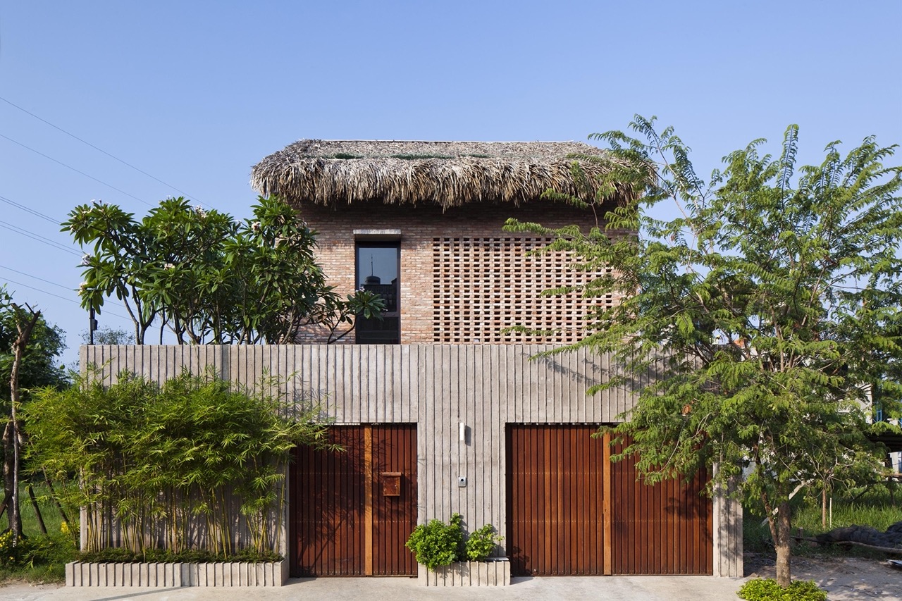 The house features a uniform rectangular form with a thatched roof with  deep overhangs. A mixture of solid ribbed-finished concrete walls and perforated brick makes up its materiality. The fence , considerably elevated and completely opaque, allows the inside to be completely open while still retaining privacy.