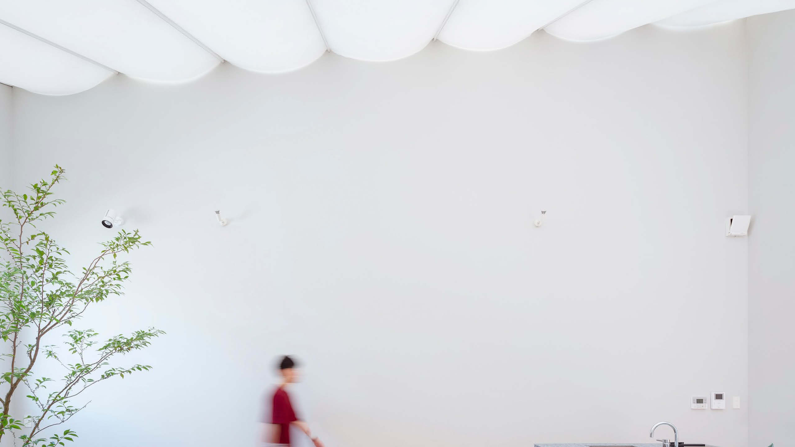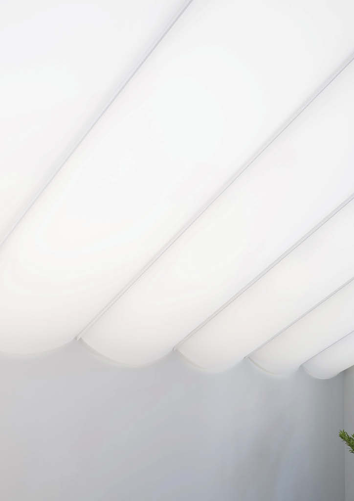 Although the sky is not directly visible from the membrane roof, one can sense the fluctuations of the environment through the changes in light. As the sun rises, the space gradually becomes brighter, and in the evening, the space slowly becomes redder by the warm light. The brightness also varies between sunny and cloudy days. The roof acts like a layer of skin that transmits the changes from the exterior to the interior and transforms one’s senses.