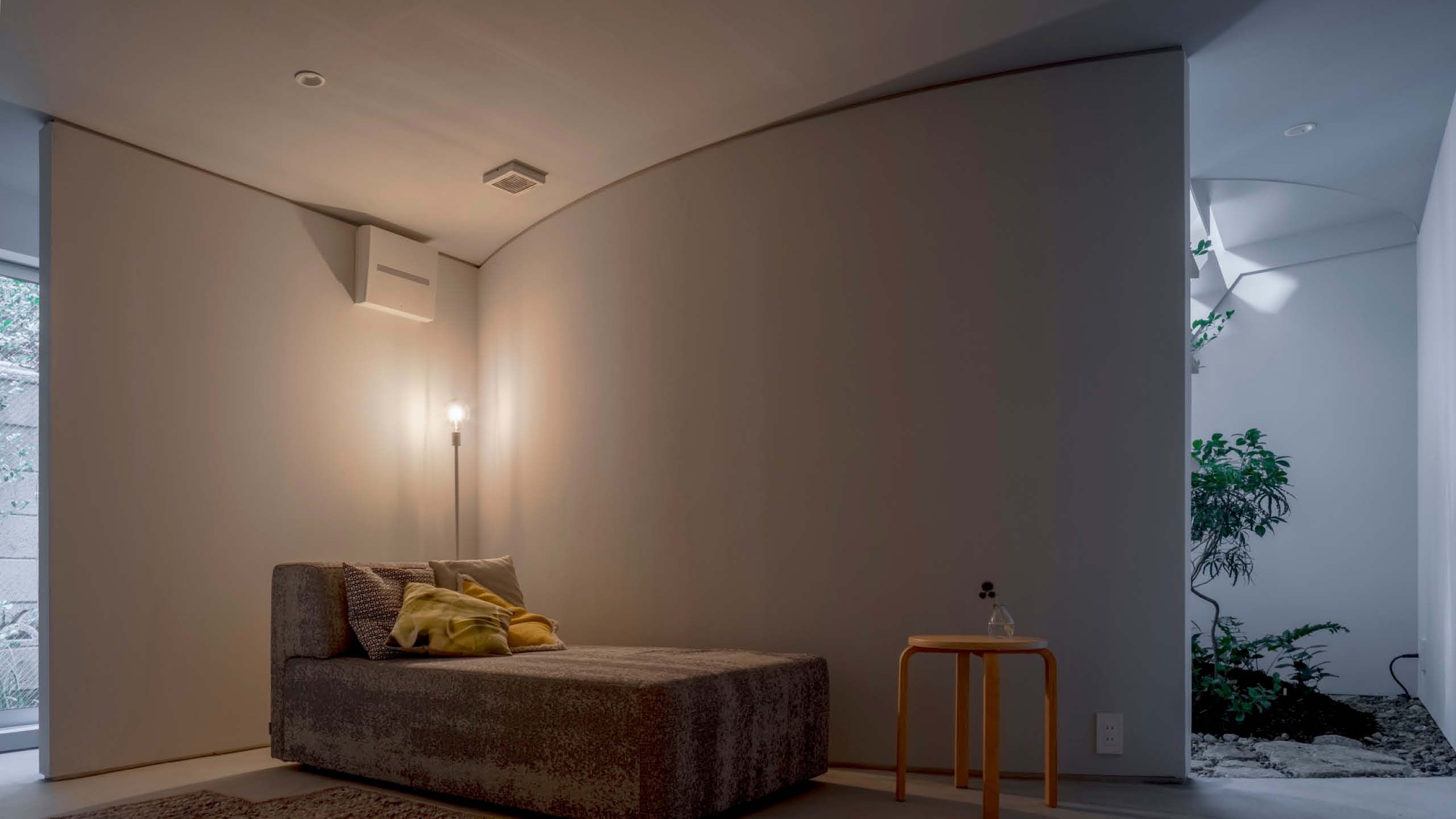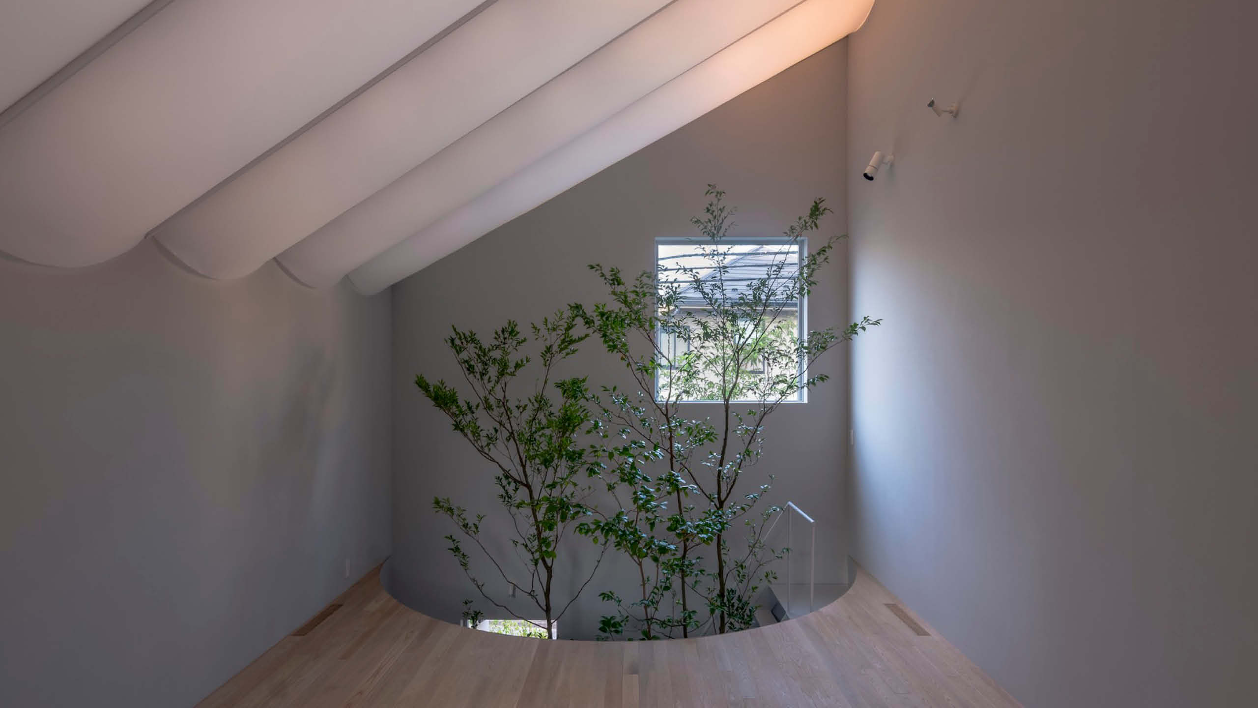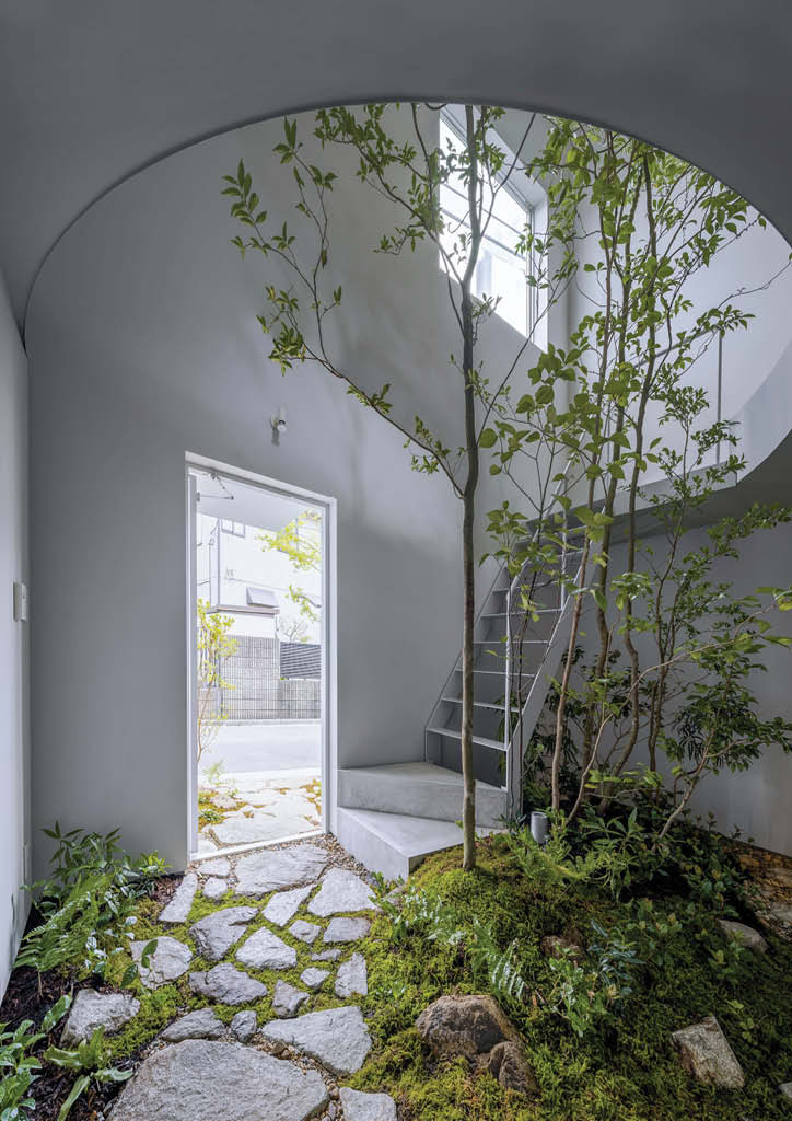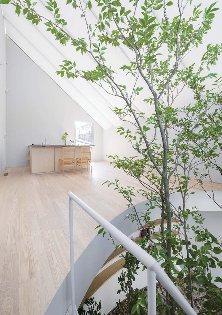 While the second floor is a brightly lit public space, the ground floor contains private spaces such as the bedroom and the bathroom with reduced natural daylight. Like being inside a dimly lit cave, it is a calm space to relax and sleep. To maximize the building footprint within the site boundary, an indoor garden with a tree is placed in the skylit atrium in lieu of an exterior garden. By bringing the garden inside, the owner can live in direct contact with nature, rather than solely observing nature through the window.