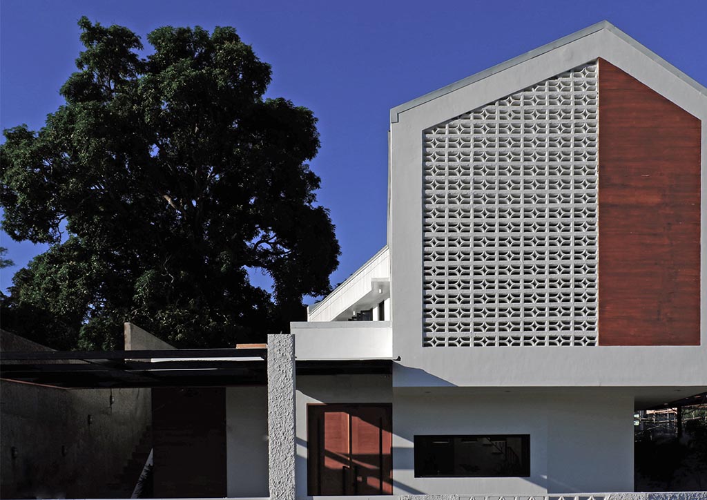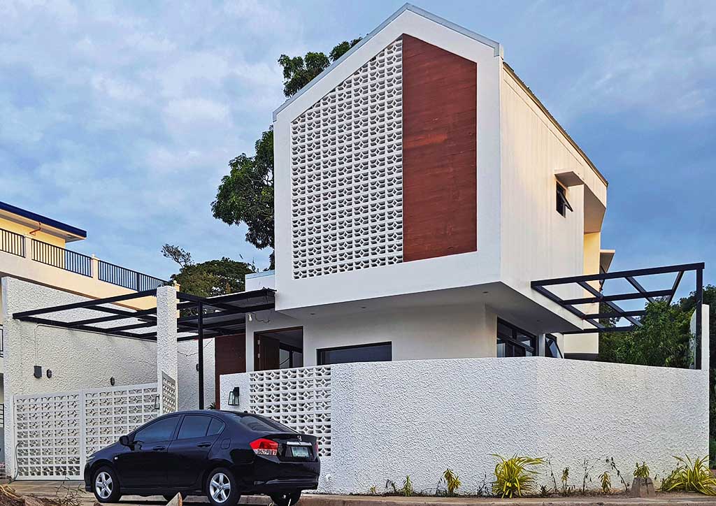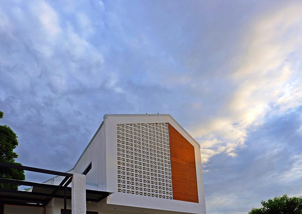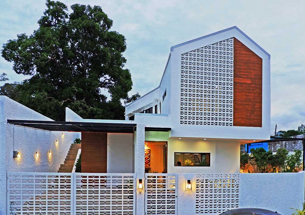 From the outside, onlookers are greeted with the bright and fresh aesthetics of the façade. It exhibits a combination of white painted elements, such as the textured walls, the decorative concrete blocks, and the metal gate that follows the details of the said concrete blocks. These blocks with small openings do not only allow natural air to penetrate but also create an interesting play of light and shadows towards the interiors of the house. Back to the exteriors, the cleanliness of the white elements emphasizes more the wood finishes on both sides, making them the front accents. Also noticeable is the subtle unevenness of the gable roof slopes that caters to the different angles of the sun’s rays during different times of the day.