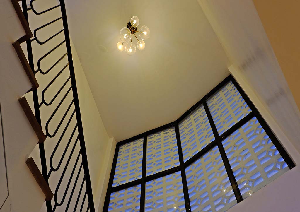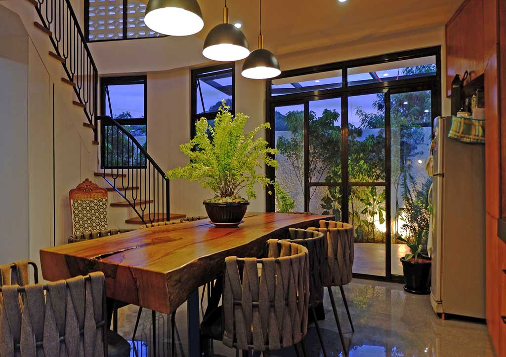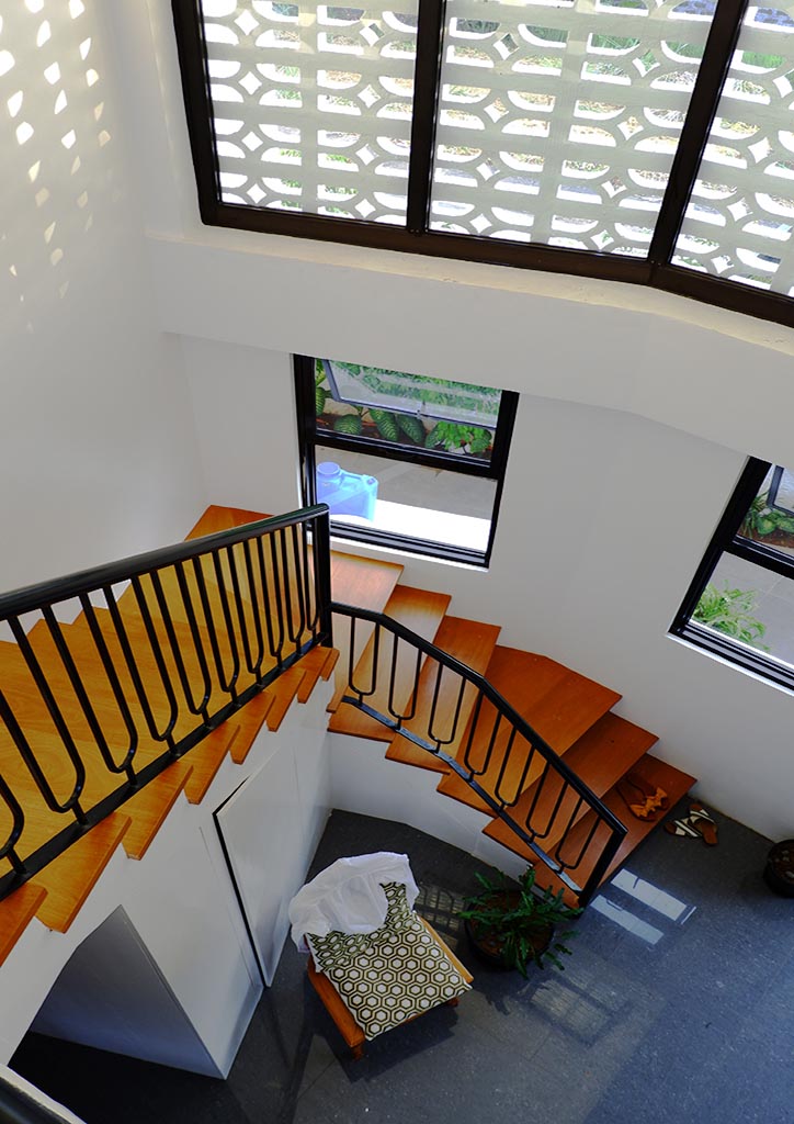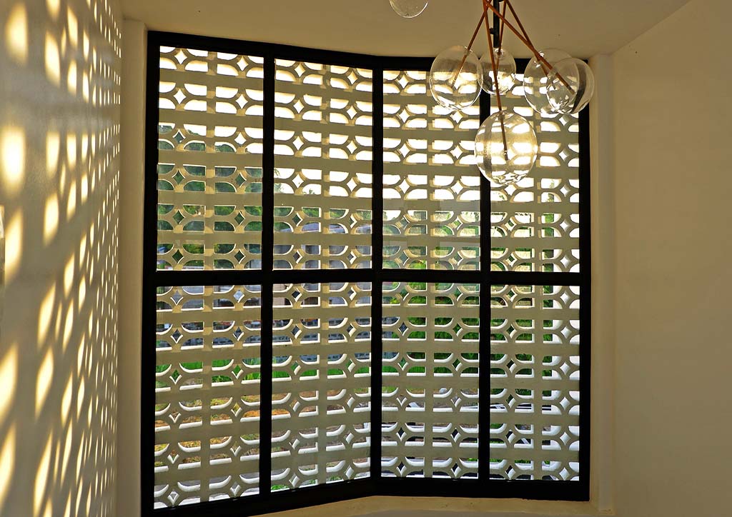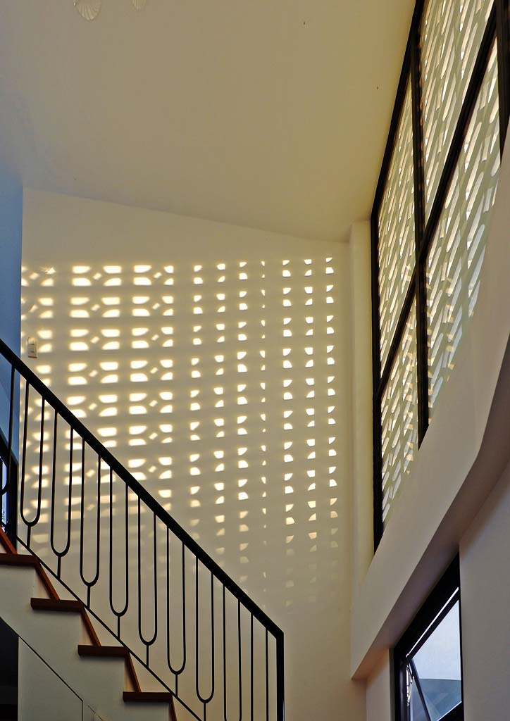 From the outside, onlookers are greeted with the bright and fresh aesthetics of the façade. It exhibits a combination of white painted elements, such as the textured walls, the decorative concrete blocks, and the metal gate that follows the details of the said concrete blocks. These blocks with small openings do not only allow natural air to penetrate but also create an interesting play of light and shadows towards the interiors of the house. Back to the exteriors, the cleanliness of the white elements emphasizes more the wood finishes on both sides, making them the front accents. Also noticeable is the subtle unevenness of the gable roof slopes that caters to the different angles of the sun’s rays during different times of the day.