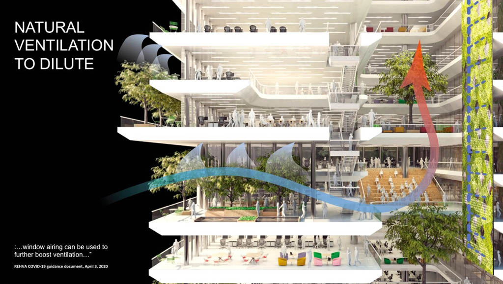 Many businesses, however, will still require employees to physically report for work. This leads to the discussion of architectural proposals on post-pandemic or even pandemic-safe design. Some (SOM, 2020) propose both active and passive measures to adopt within existing structures and to integrate into future developments. What the pandemic did is accelerate the adoption of solutions to the “sick building” syndrome. The US LEED system, Singapore’s Green Mark, and Building Code already have these solutions codified and are enjoying newfound attention because of safety and health concerns.