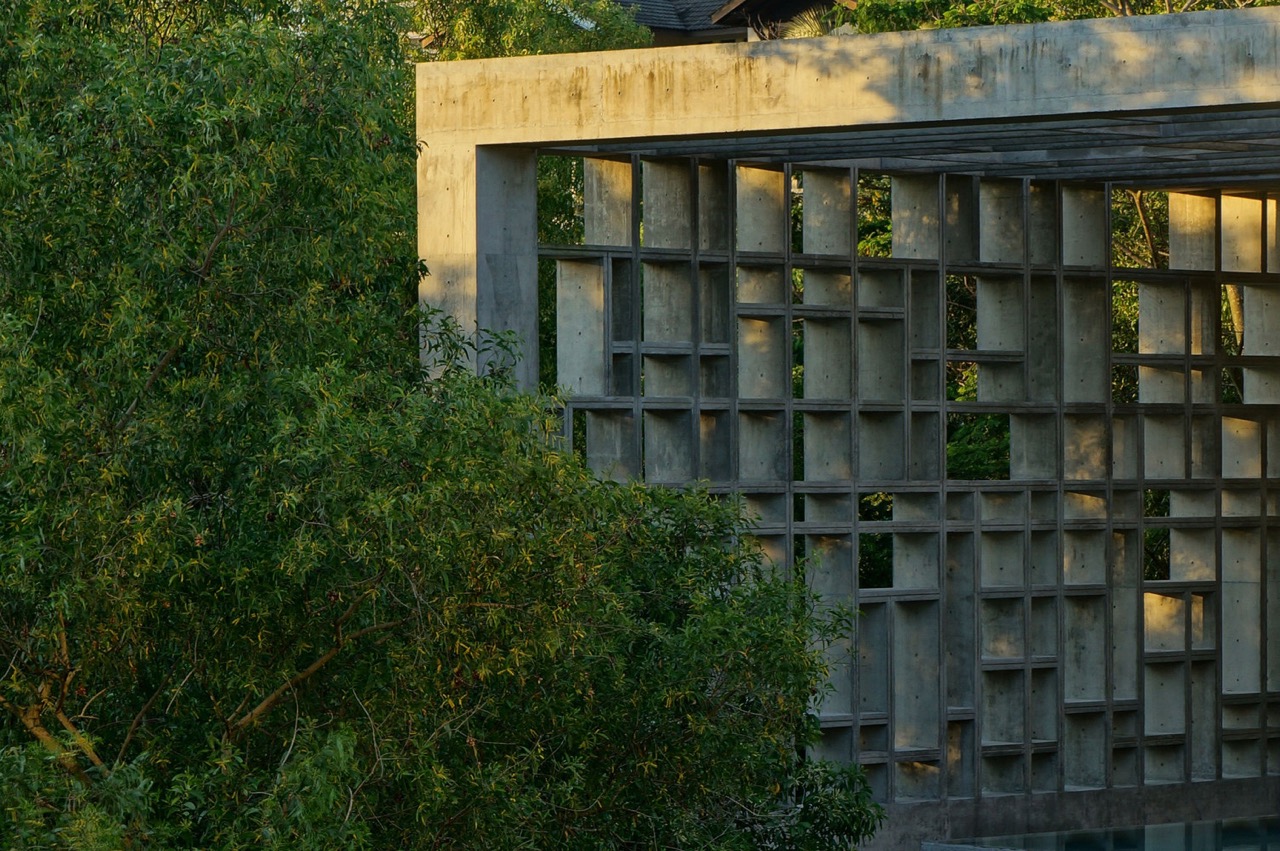 The project sits upon a sloped site that stands on level with the surrounding tree canopies. As such, the design frames the mature Albizia trees as one enters from the moment of their arrival. The home sits lightly along the jungle with its perforated concrete shell that reduces its solidity in favor of a permeable character.