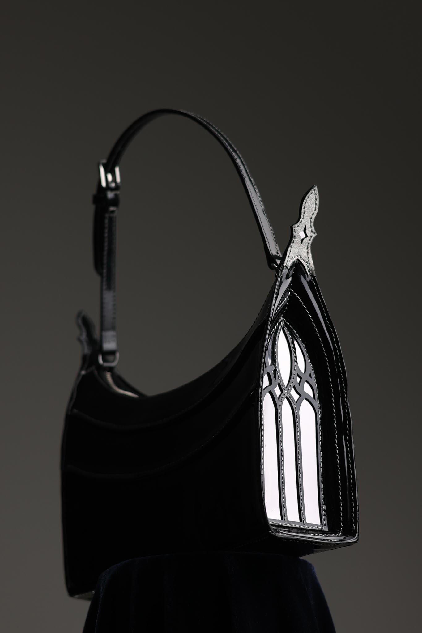 The Archway bag in patent black leather, chrome PVC panels, and metallic threads.