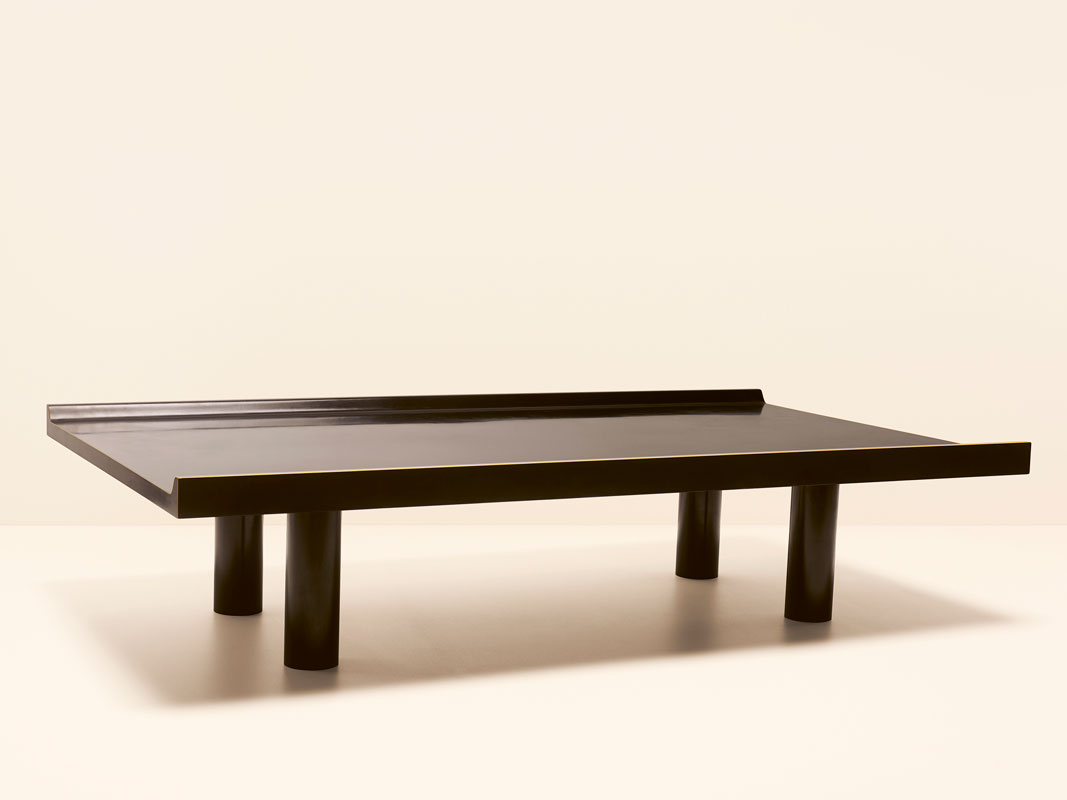 Another collaboration this year for Hermès Home is the Aes table by Barber & Osgerby. The lipped coffee table, evocative of a metal girder, is cast in black bronze in a single-use mold. Edward Barber and Jay Osgerby reduced the piece to its purest line and finished it with a waxed surface that “seems to absorb all the light and throw it back with greater brilliance.”