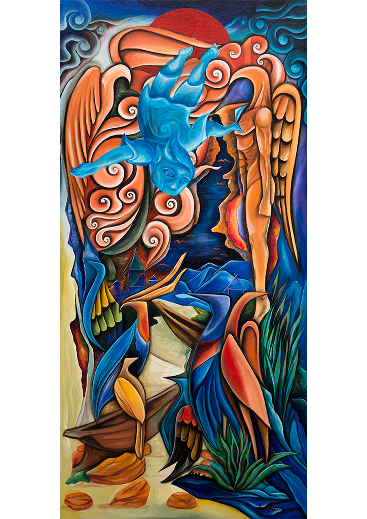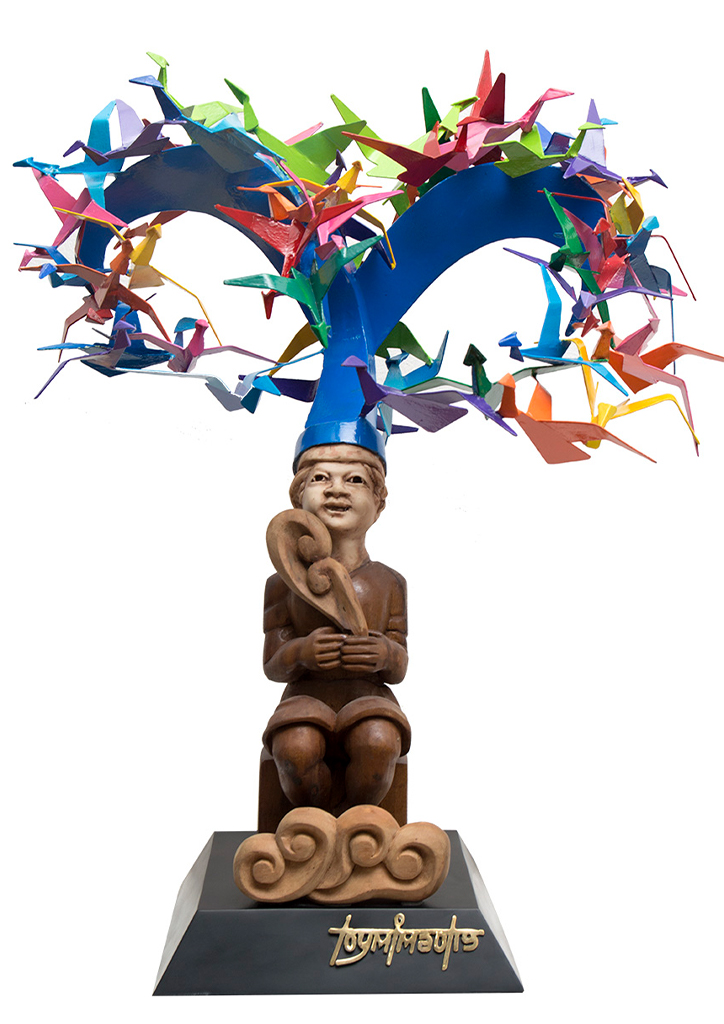 The majority of Toym’s work falls into one or another series of related paintings and sculptures, sharing his father’s common themes and symbols as observed in colorful migratory birds, the patterns and colors of nature, and marine life. The overarching theme of “In His Veins” is the legacy that fathers handed down to their sons. It also regards the sphere of influence that parents pass on to their children, important core values and ethics handed down from generation to generation.