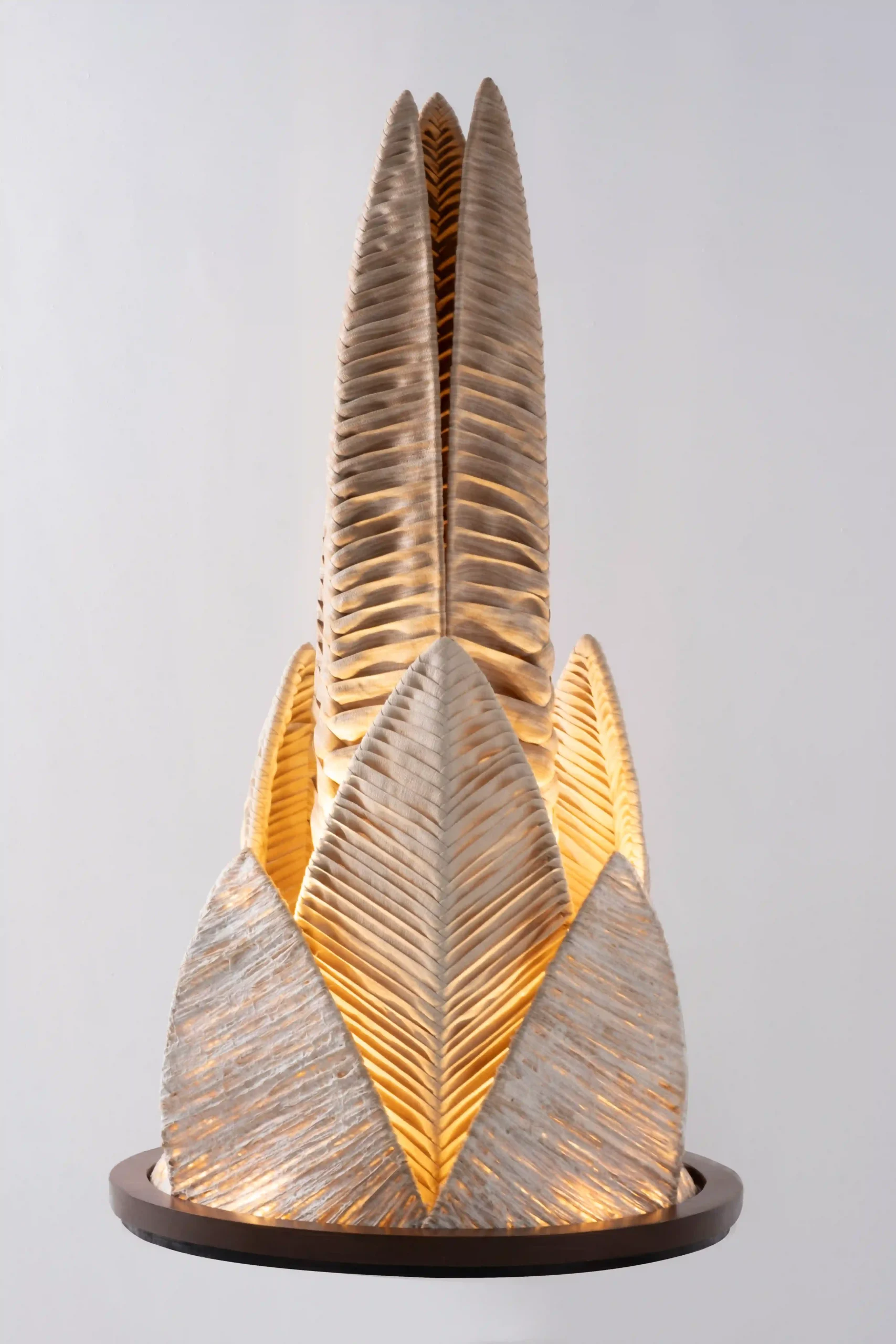 Experimenting with handwoven raffia polyester textiles from Cebu, Olivia d’Aboville, in collaboration with Industria Edition, showcases “Raffia Flowers.” She pleated these textiles into large, imaginative flower-like conic shapes, which Industria Edition then complemented with their distinctive metalwork. D’Aboville, a French-Filipino artist, consistently explores the interplay between organic and synthetic elements in her work, frequently utilizing natural Philippine fibers or recycled materials.