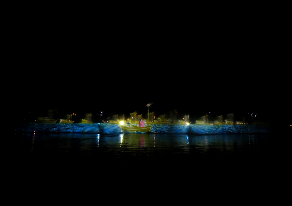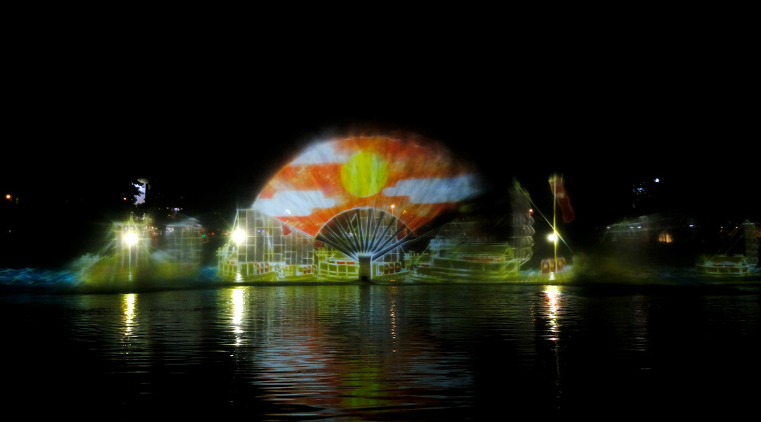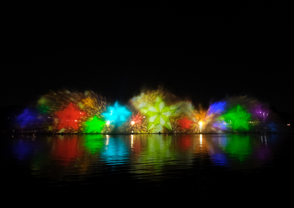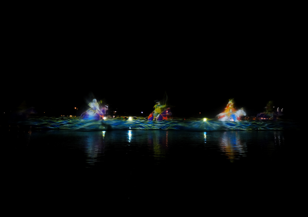 teamLab presents bursts of colors and exploding images in a 30-minute interactive water show comprised of four artworks: Born from the Water, a Loving and Beautiful World, Water Scrolls: Genpei Yashima Battle, teamLab Interactive Fishing Party: Spin your Fishing Reel – Water Screen, and Reversible Rotation in Water. The first and third works are interactive shows where audiences get to contribute to the flow and aesthetic of the digital art exhibition while the other two are dimensional plays that narrate and mirror Japanese history and tradition.