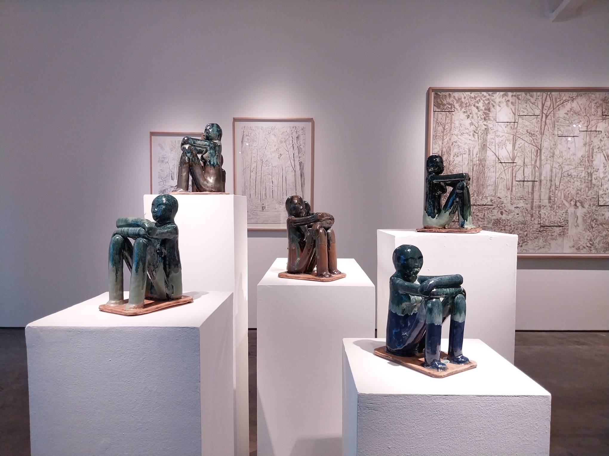 That desire to depict the mystical divinity of the world around us extends beyond nature. The glazed stoneware sculptures showcase a person sitting down, their knees on level with their chest as they put their arms over it. It looks akin to indigenous statue designs, which Paz said she was inspired by.