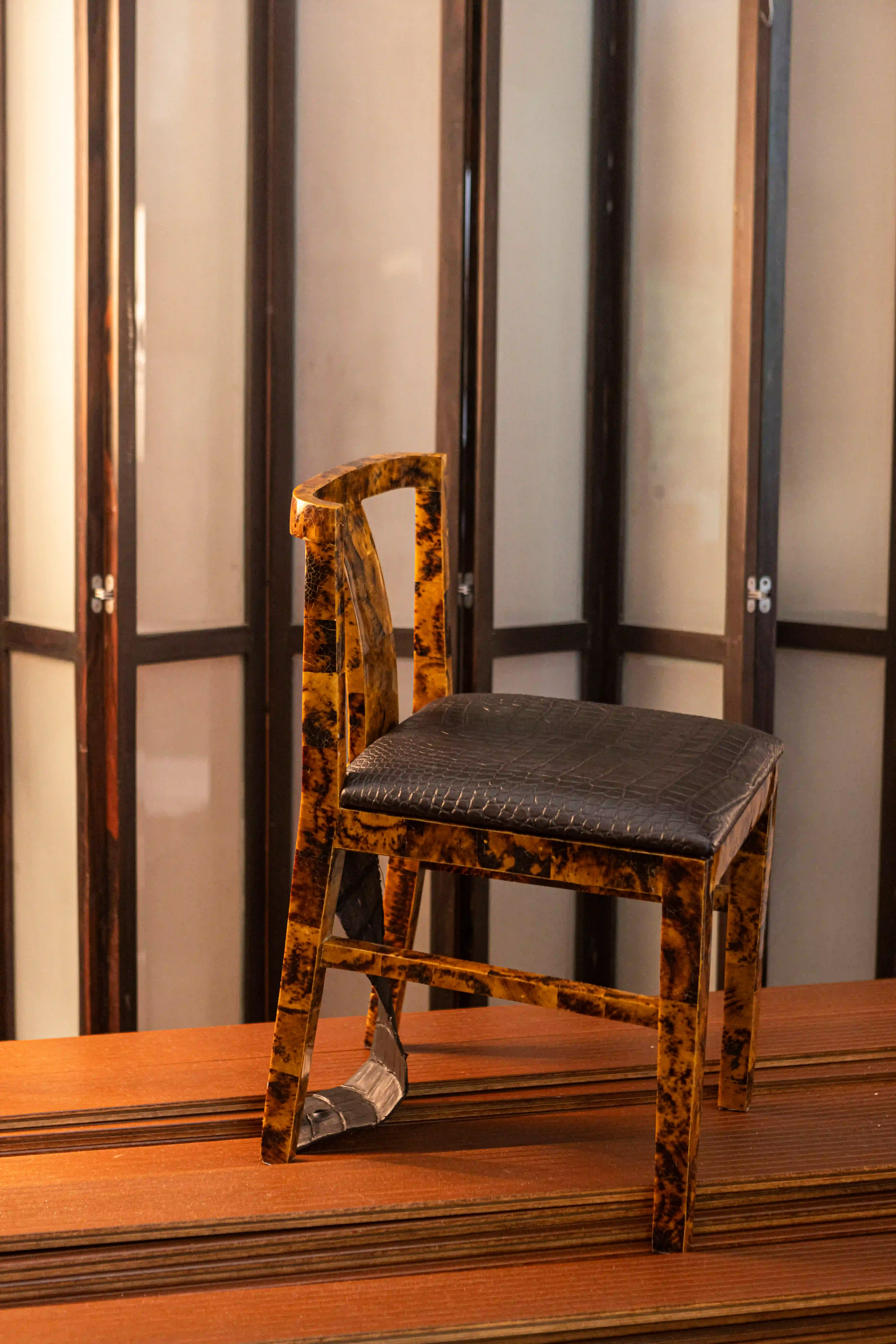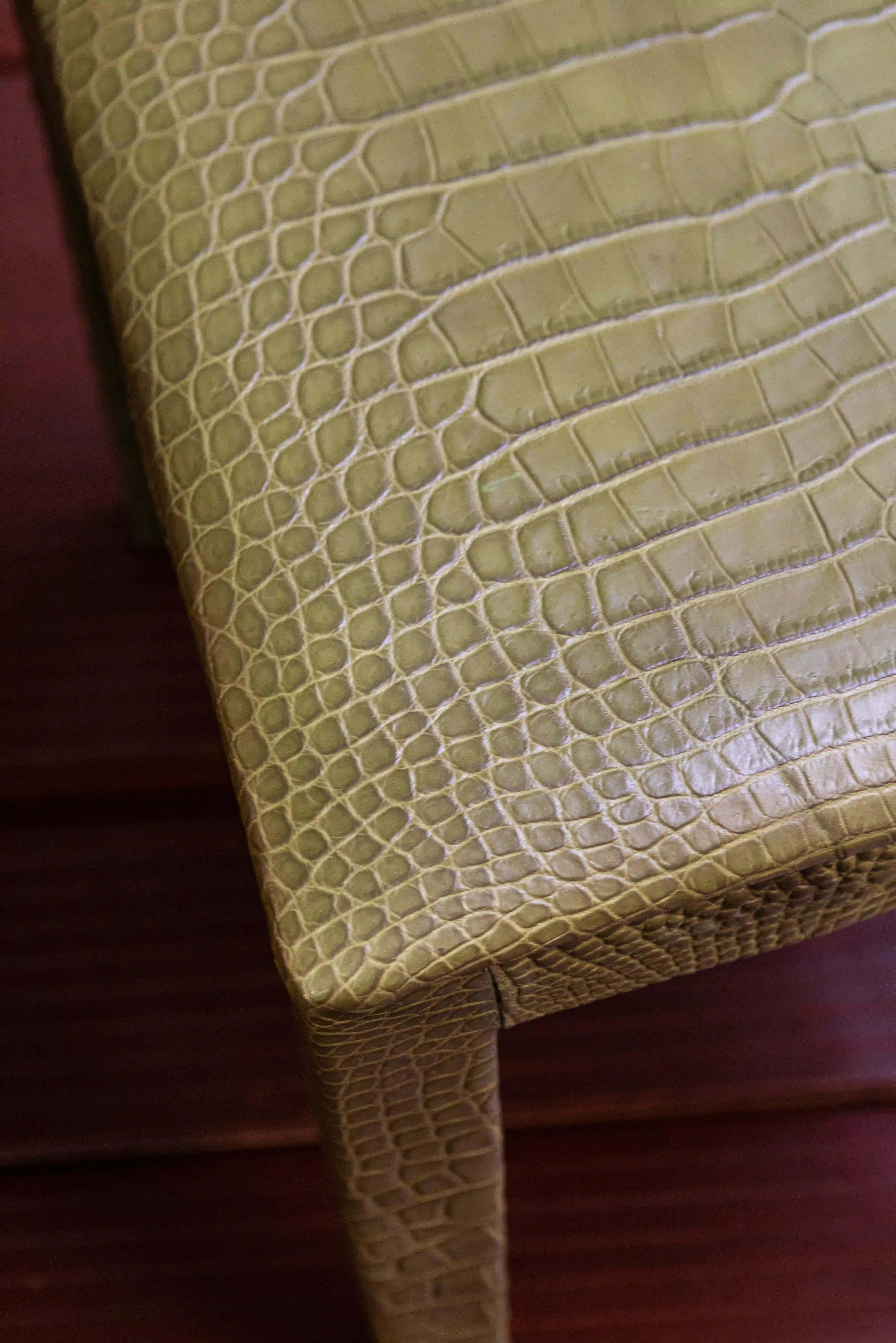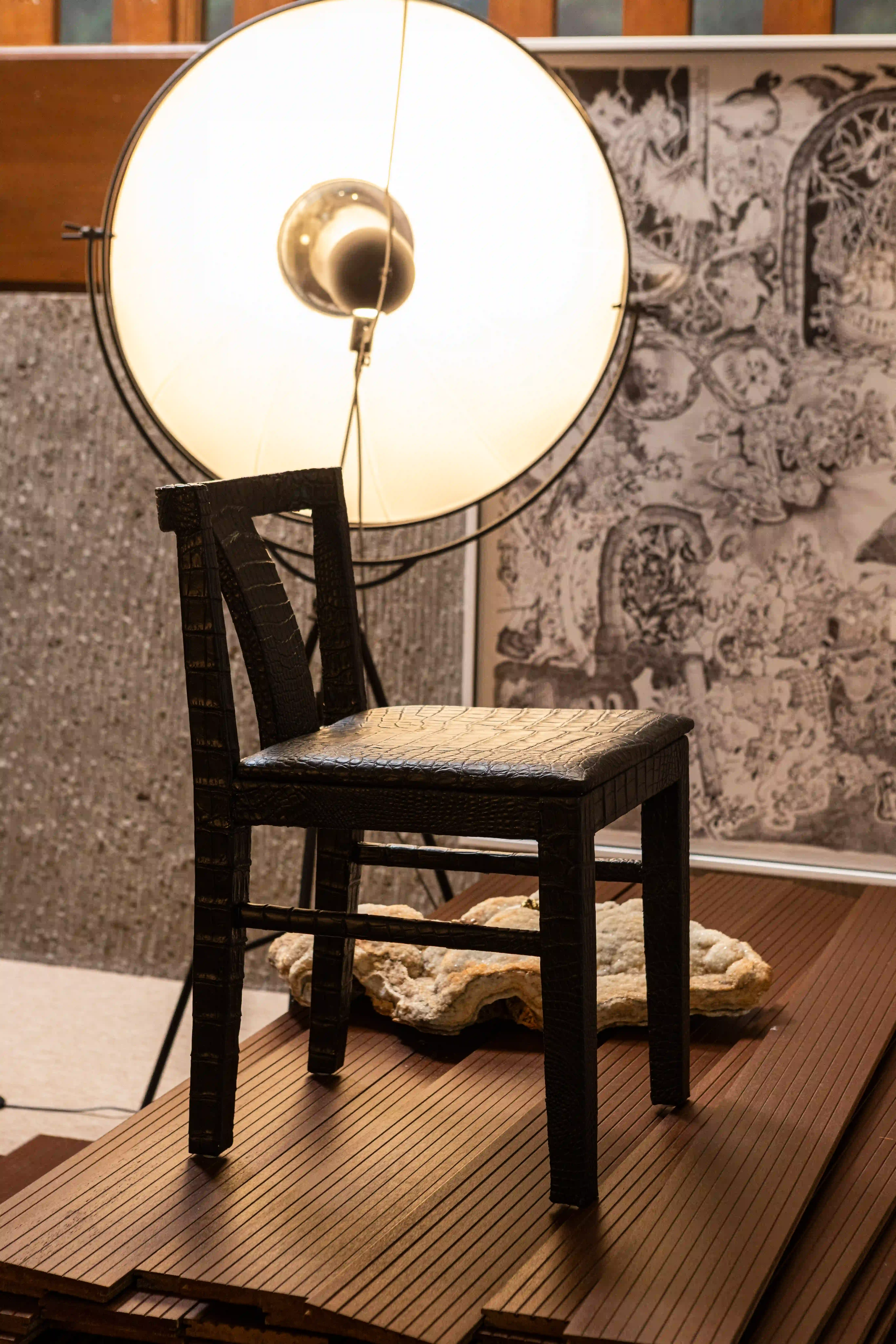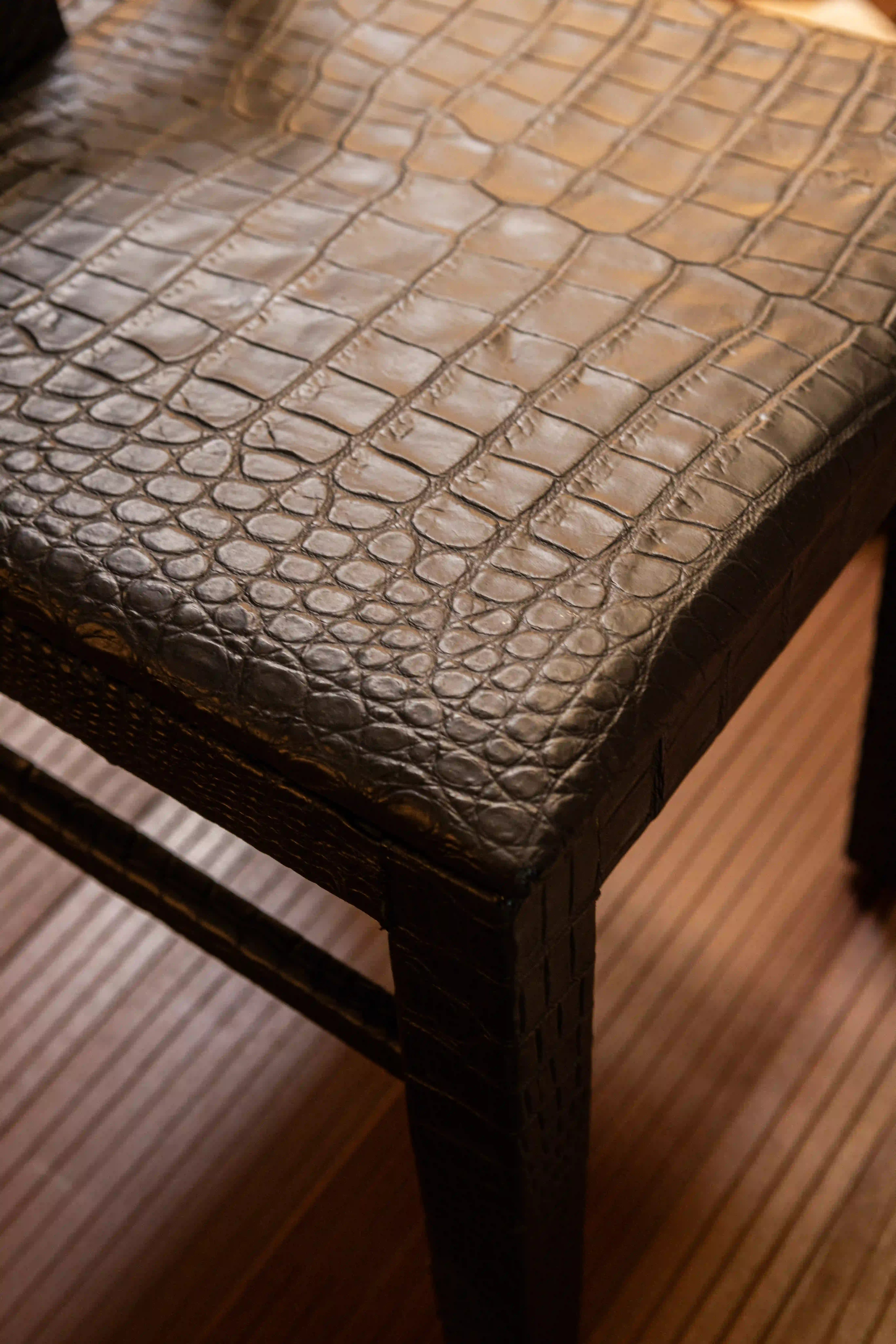 The four-legged, symmetrical chair has a classic form with a gentle and ergonomic curve for a backres. A pair are upholstered fully with alligator skin – one in apple green and another in light grey. Another one bears what seems to be lacquered tortoise shell or burl wood with a black alligator skin seat with a its tail playfully attached.