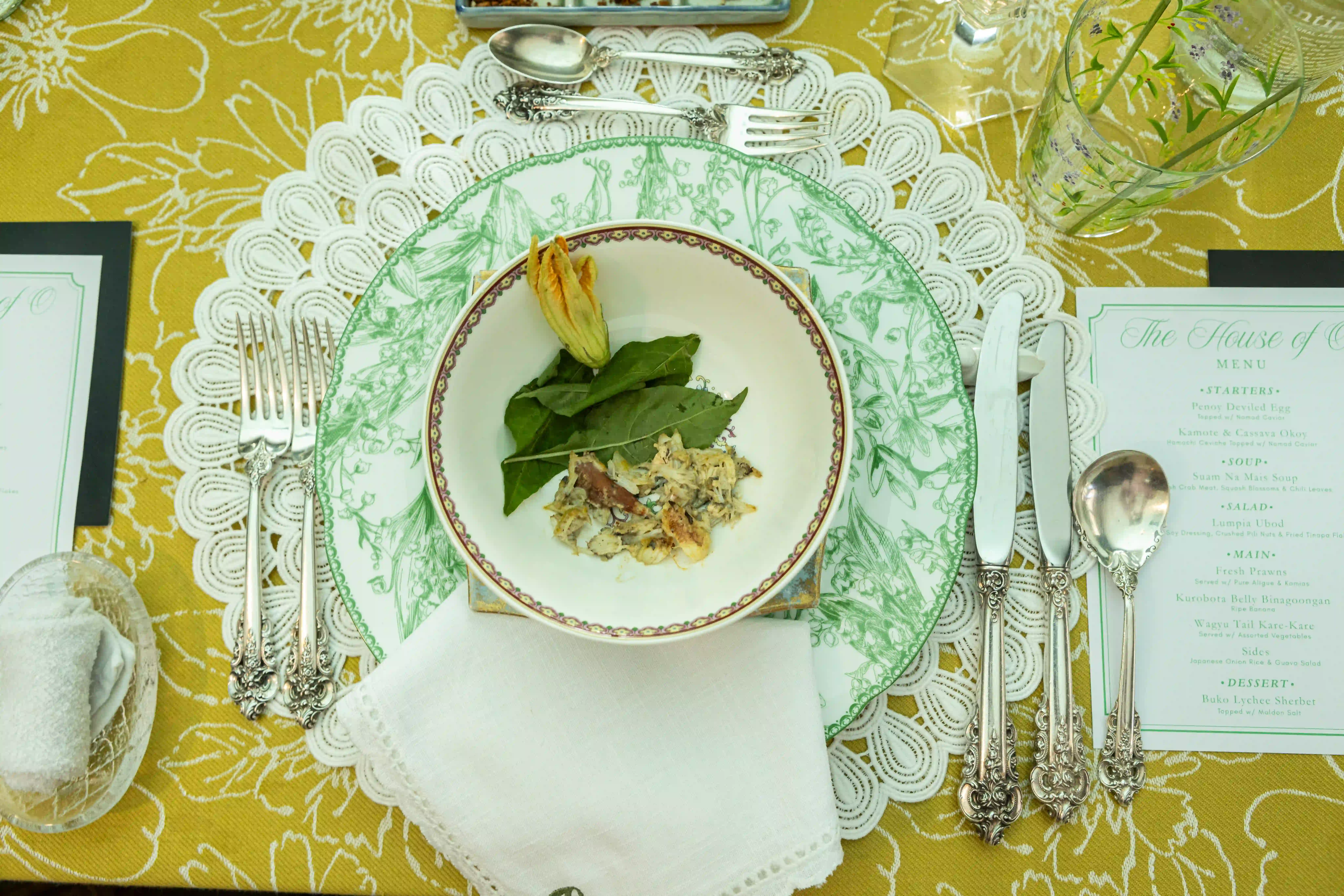 Prefaced as “A Fresh Retelling of Kapampangan Cuisine”, the lunch started with penoy deviled eggs topped with Nomad caviar. Bottles of Antipodes water were poured into glassware with flowers hand-painted by artisans in La Union. A whole fresh prawn is grilled and served with an indulgent blanket of pure aligue and slices of kamias for a tart acid to cut the richness.