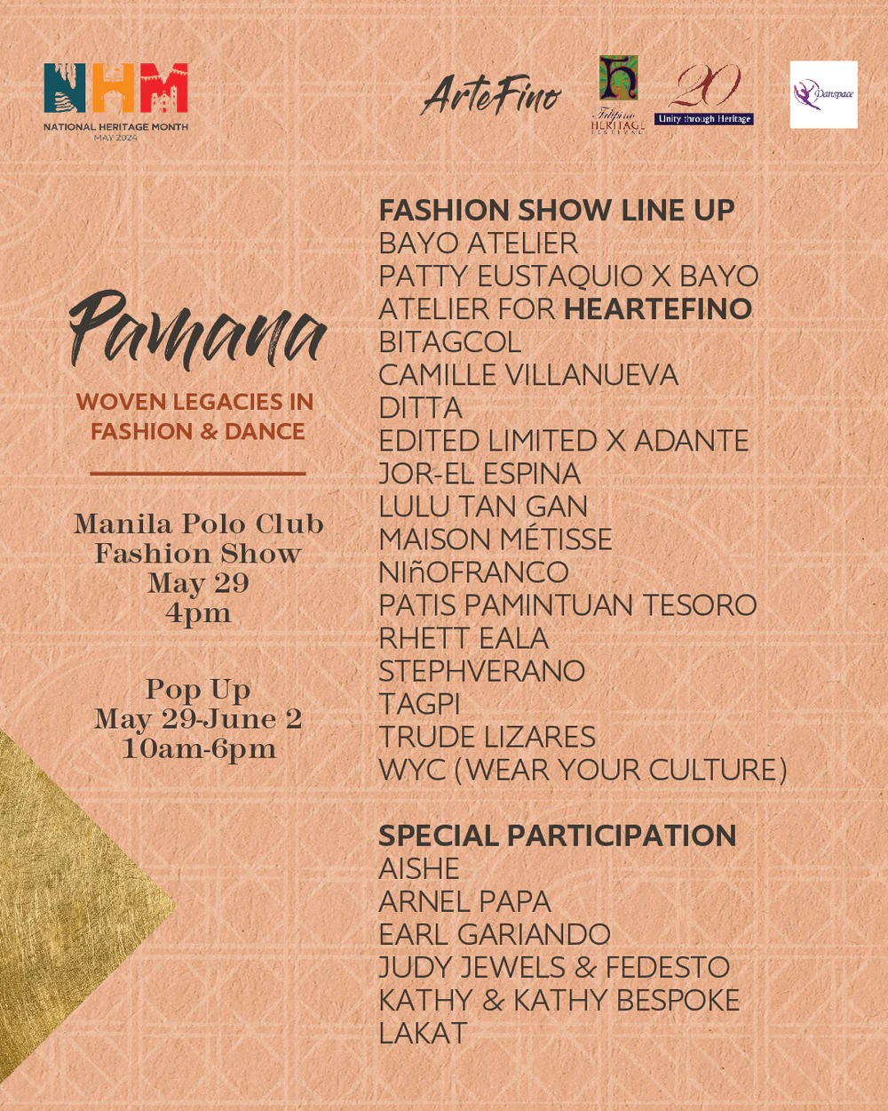 In view of the National Heritage Month, ArteFino, in collaboration with Filipino Heritage Festival Inc. (FHFI), will hold a cultural and fashion show entitled, “PAMANA: Woven Legacies in Fashion and Dance” on May 29th at the Manila Polo Club.