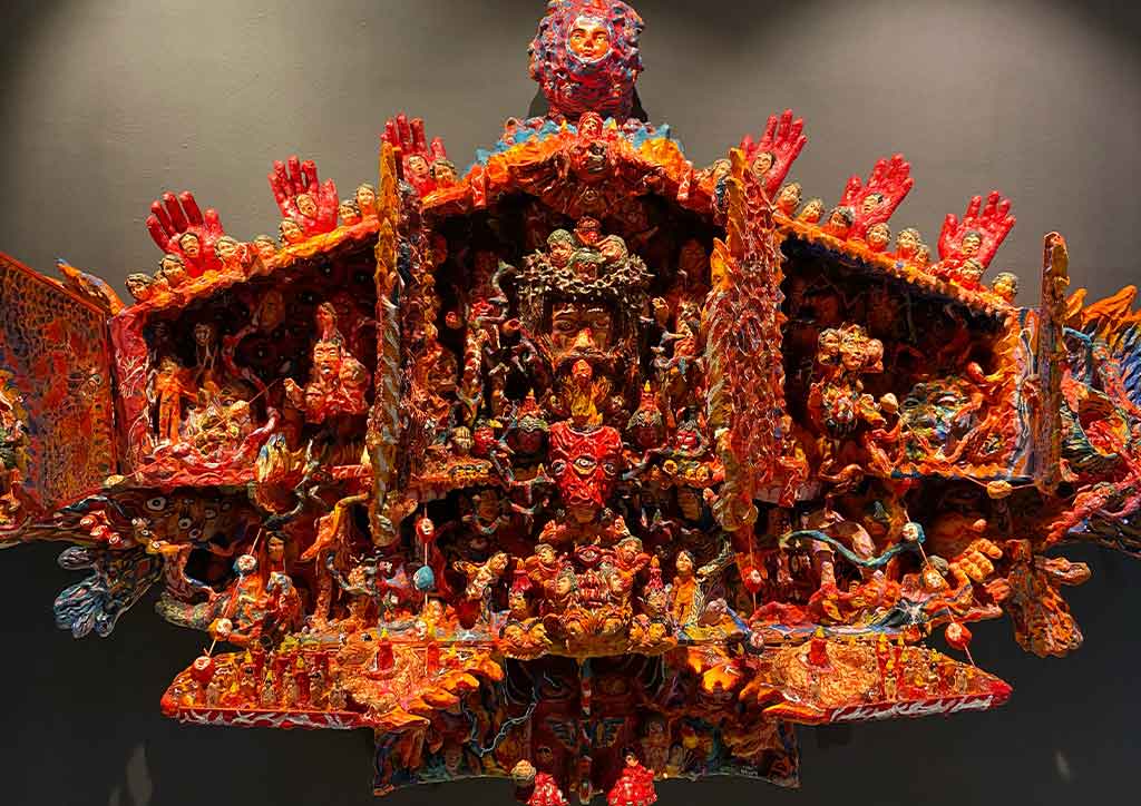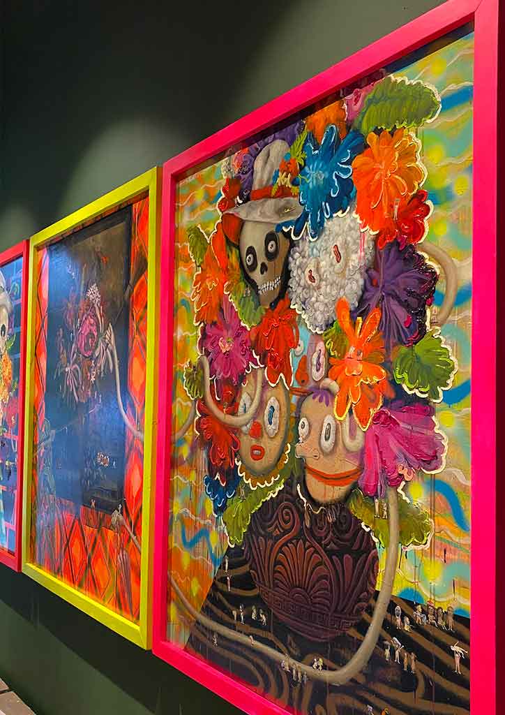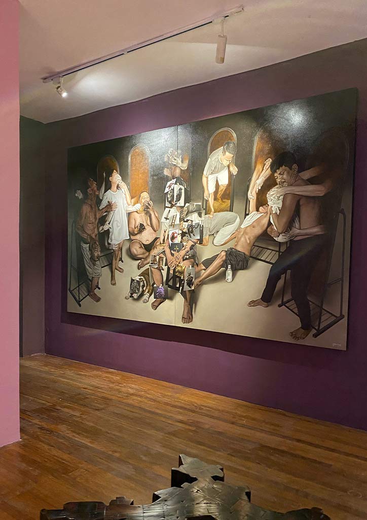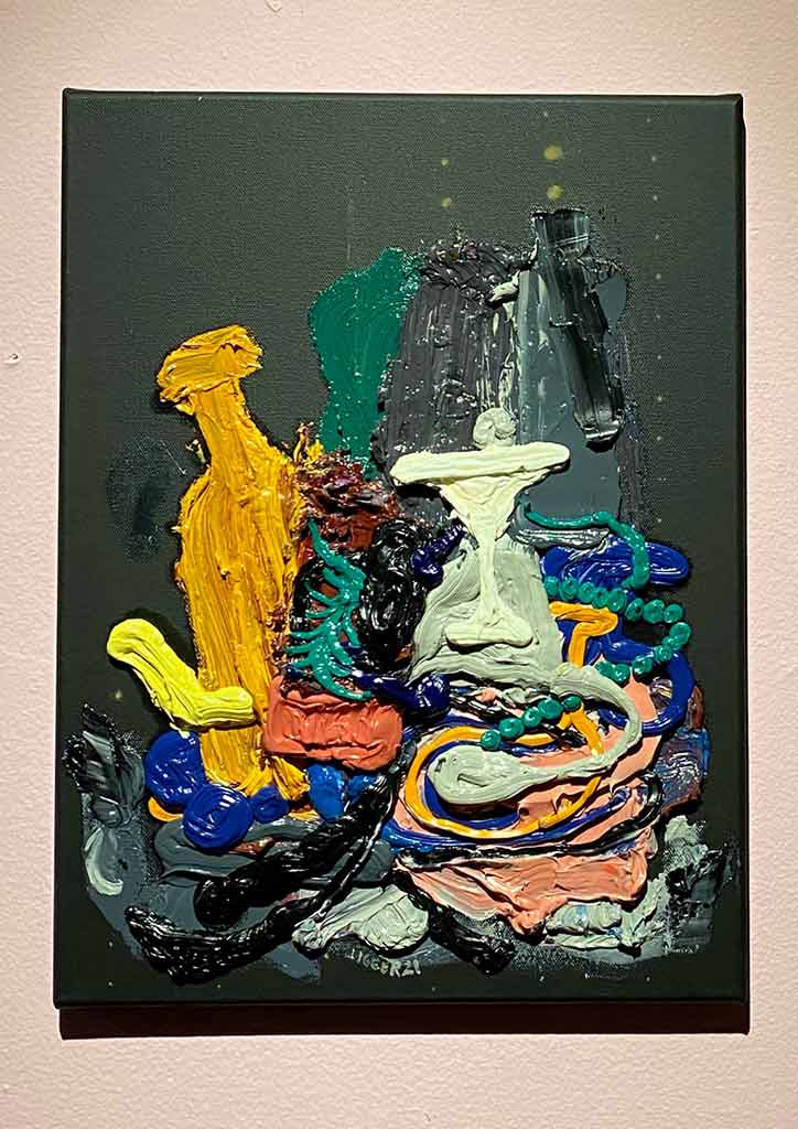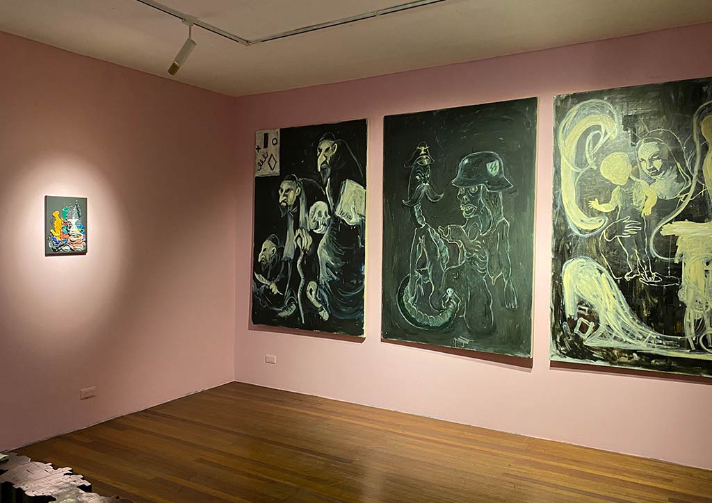 Entering the gallery, Doktor Karayom’s “Katok sa Kahoy”, welcomes you. It shows excellent work of acrylic paint on wood, wood clay, and resin. Parallel to this stunning work is an oil, acrylic, and aerosol on canvas triptych by Bjorn Calleja. “Flowers Fighting Over its Own Image” comprises three large canvases in bright neon frames.
