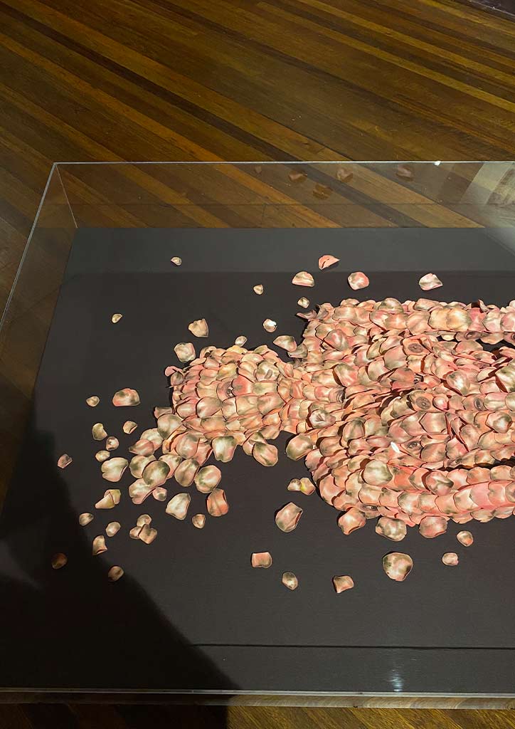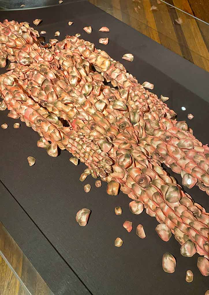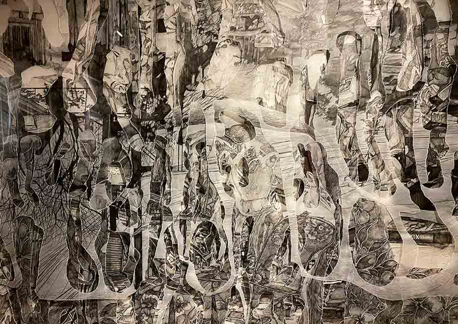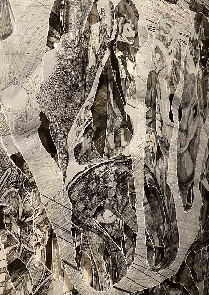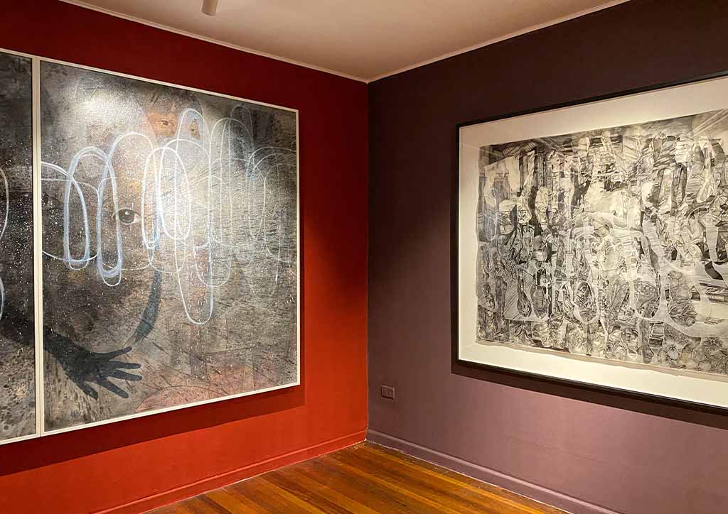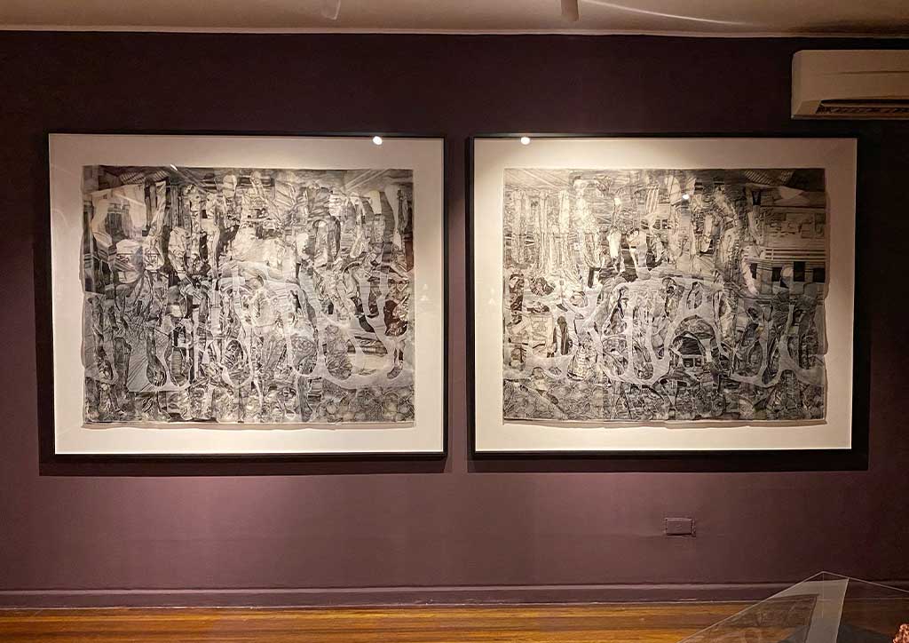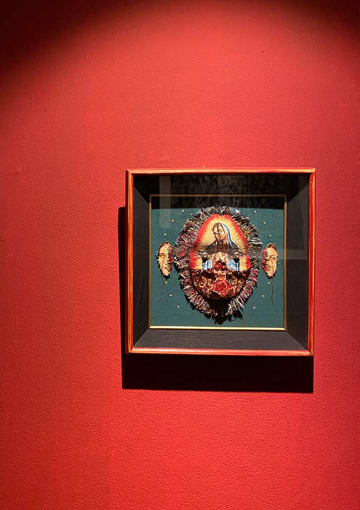 Going into the Red Room, you are led to works by four artists. “Quiescence,” by painter and licensed architect, Stephanie Alvarez shows watercolor and graphite on rose petals made of paper, mounted on wood and framed under an acrylic box. “The Birth of Consciousness,” another tapestry assemblage by Jan Sunday, is on one wall. Across this are two works by Lui Gonzales in her usual layers of torn tracing paper layered with thread, pen, and ink called “In Search for a Cure for Melancholia.” Lastly, “The Enemy Is Inside”, a considerable work by 13 Artists Awardee for 2018 Lynyrd Paras, is something you can’t miss.