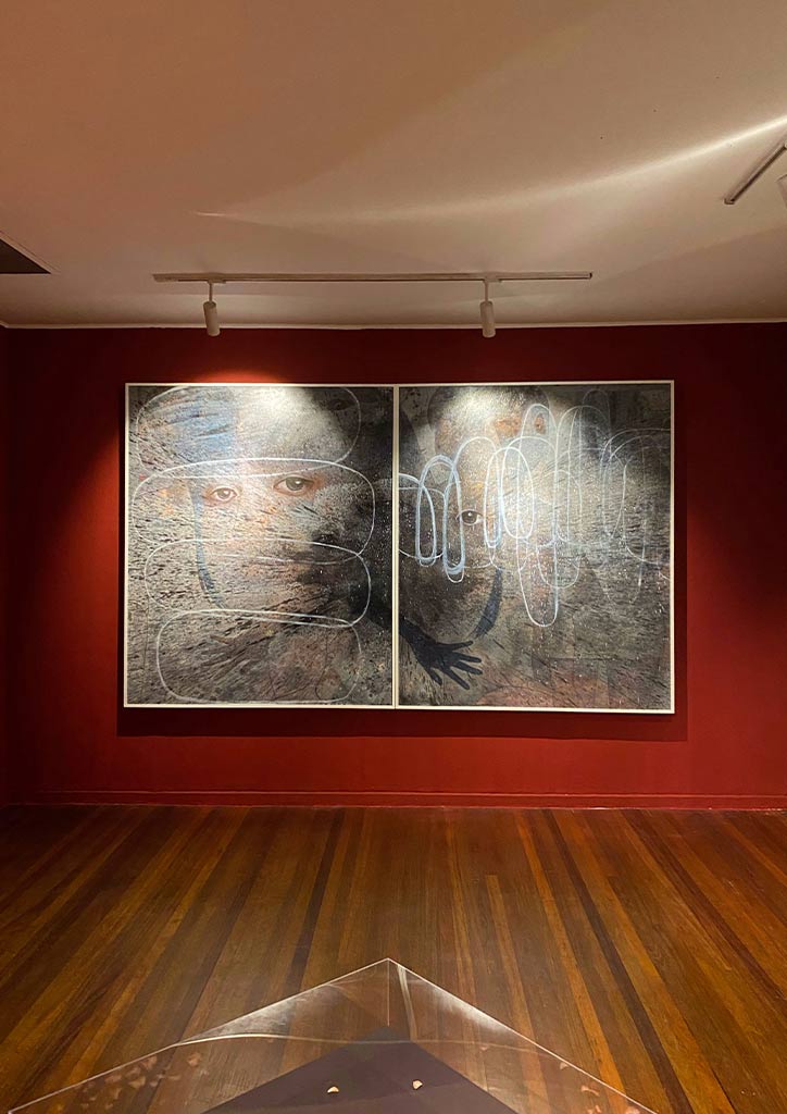 Further into the Artinformal gallery are two massive works of Pawikan Art Collective member Bud Omeng and Ryan Jara, who paints portraits in unique figurations. Each painting is almost 18 feet long. Cebu-based artist Jan Sunday’s “The 12-pointed Star and the Precession”, a tapestry work on canvas, anchors the two pieces.