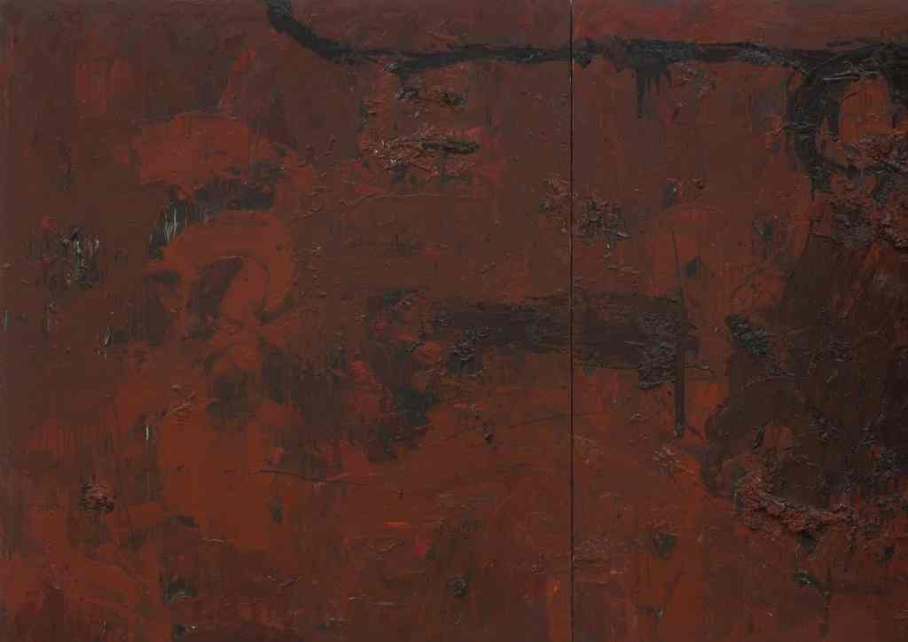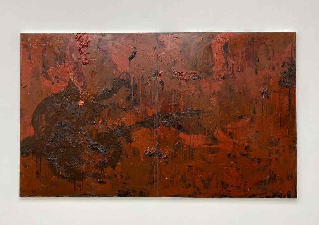 Writer Josephine Roque says, “The successive coats of underpainting, dripped, splattered and poured paint allows the viewer to reconstruct and follow Pacquing’s loose gestural marks which begin in one canvas and continue to its complementary partner through its mix of dark crimson, cadmium red and black along with its surface sheen makes it harder to look at. The black in some of the canvas works seems to melt into the red, or strokes sit on top of it like calcified crusts. On closer inspection, one perhaps wonders if this is what stepping out of blindness feels like. Red is the first color babies see when they are born. The reds used here are not cold, depressing, or austere, but of throbbing discontent, of caring about what happens next. In one diptych, the color and texture make it look like exposed flesh, while in another, it is the red of ritual and community found on the walls and pillars of palaces and temples. Ceremony and the color red have been used in many cultures to signal the beginning and the end of passages marking a life: birth, weddings, mourning, and even the liturgical calendar.”