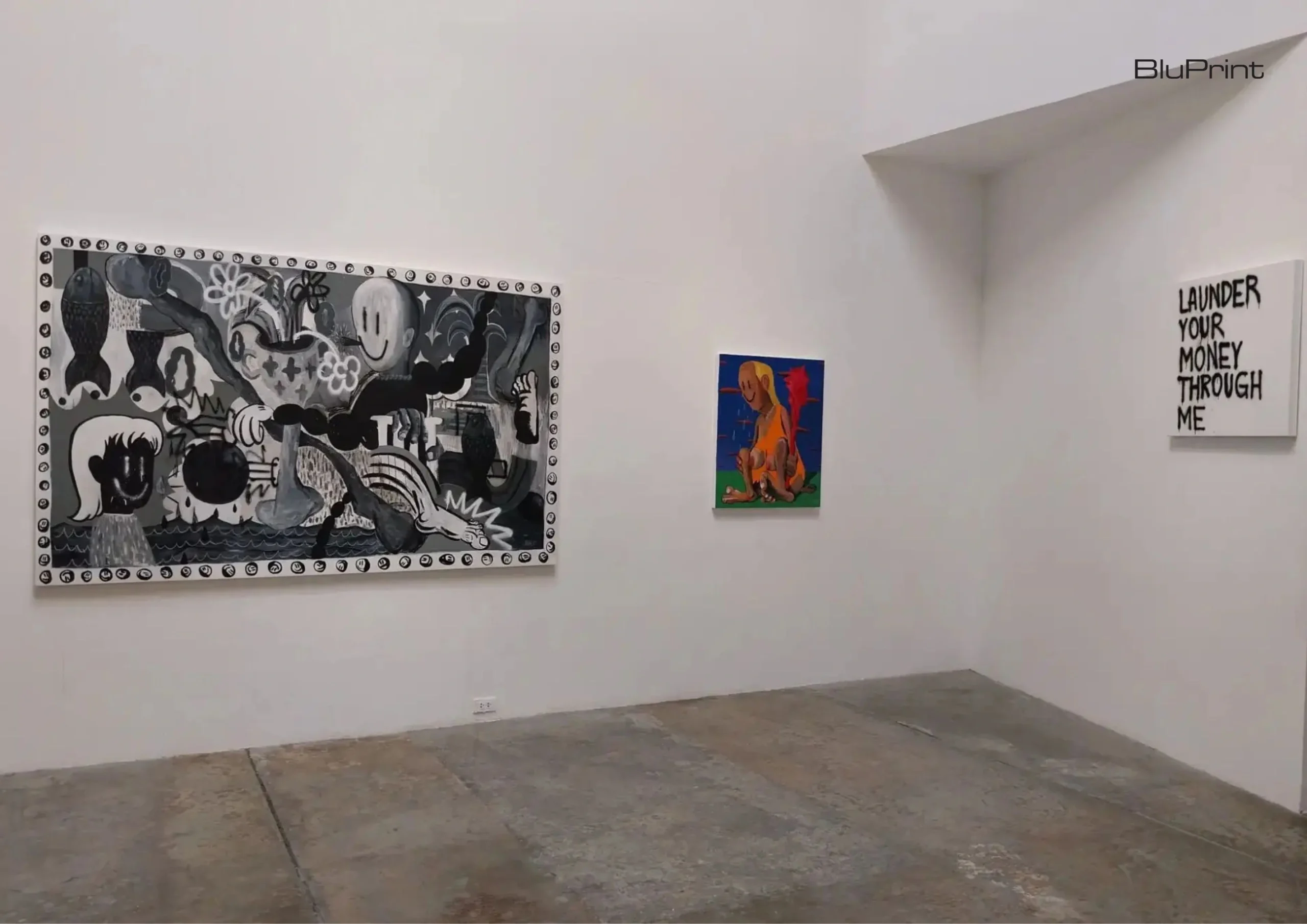 Possibly the most pointed satire in all the paintings is “LYMTM,” an aerosol-on-canvas piece where Zaldivar sprays “Launder Your Money Through Me” in giant black letters on the canvas. It’s the simplest and bluntest work in the exhibit, one that attacks the inaccessibility of artworks for a broader mass audience.