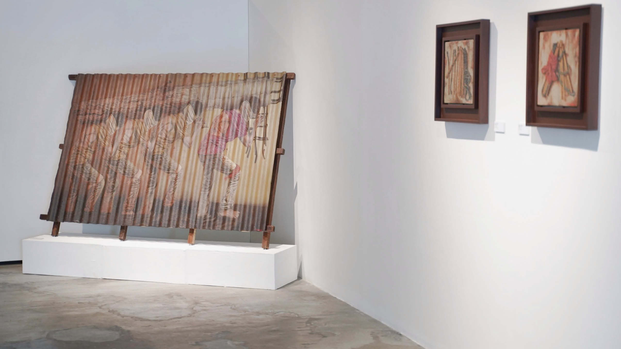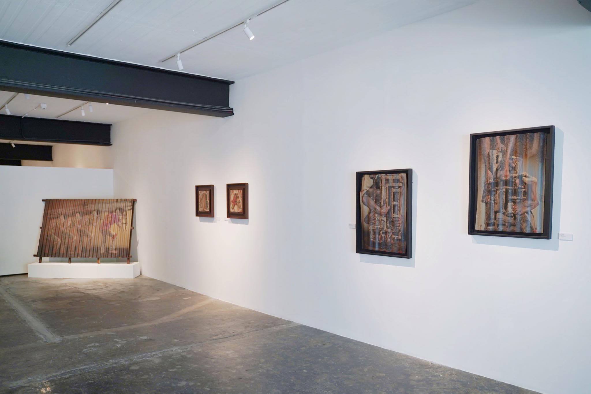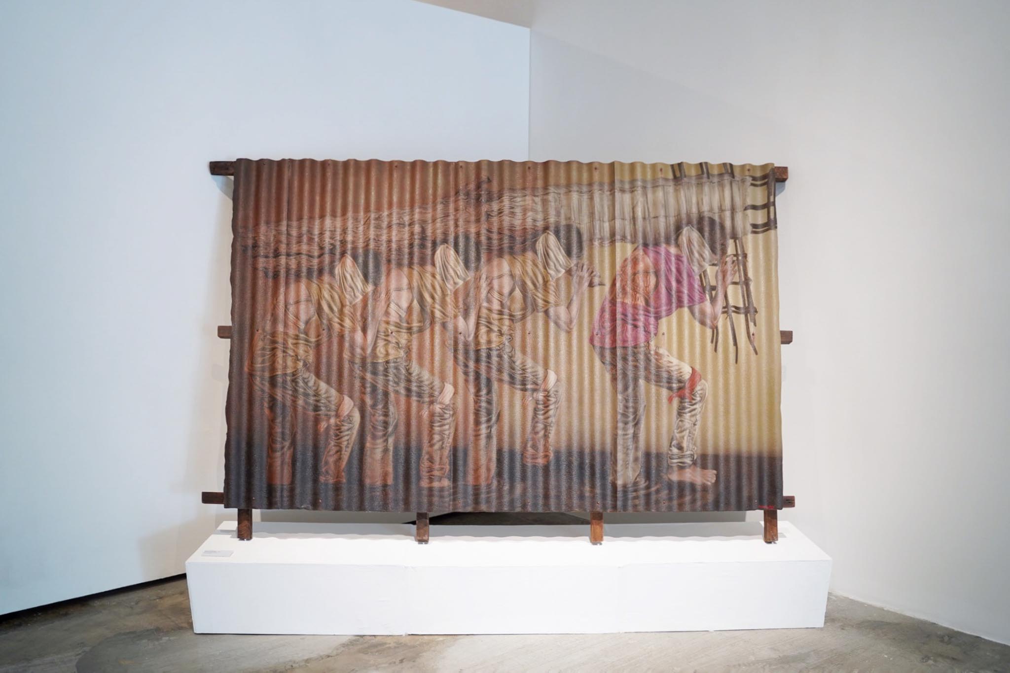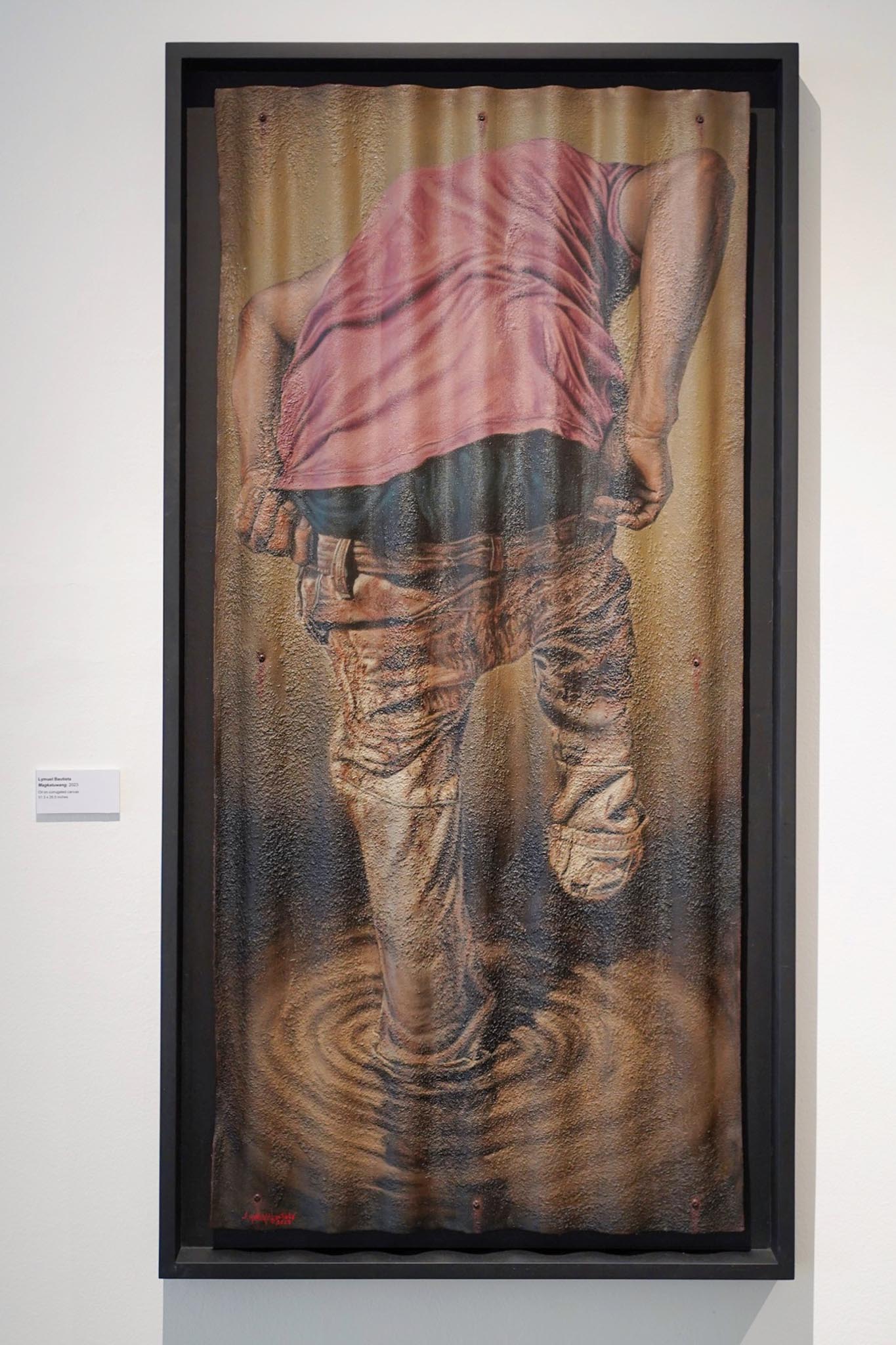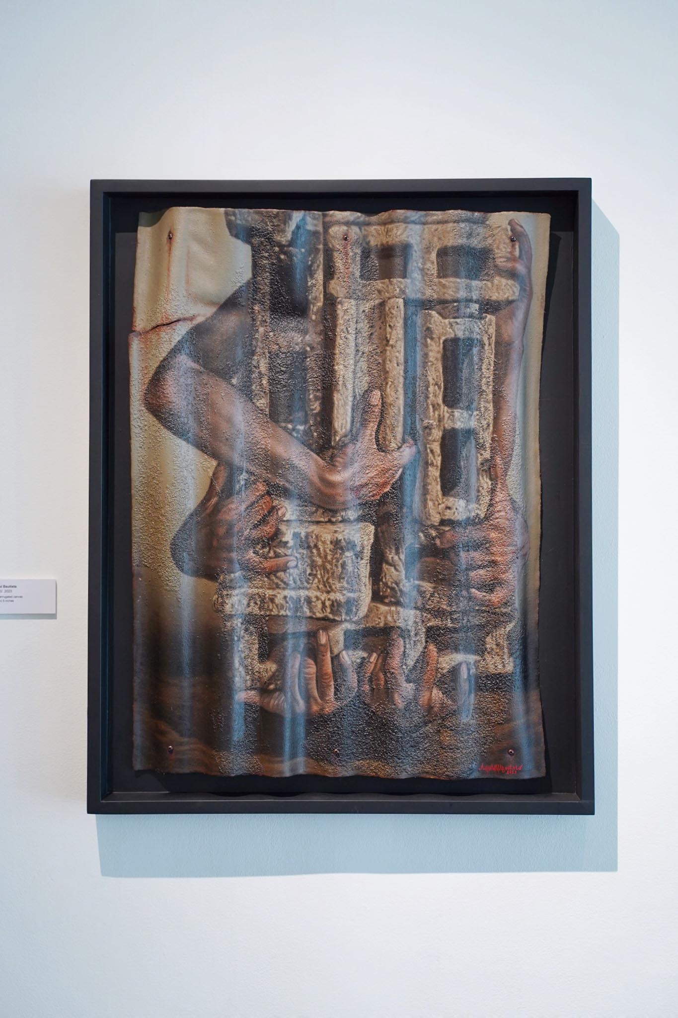In his solo exhibition on view at ART CUBE gallery titled “Debosyon,” the artist presents a narrative employing a distinctive approach to the visual canvas, deftly converting it into a portrayal of rippled metal rooftops. Utilizing rich shades of deep reds and browns reminiscent of weathered iron, Bautista directs attention towards the precarious circumstances experienced by marginalized communities—primarily constituting the nation’s majority—along with the daily challenges they confront.