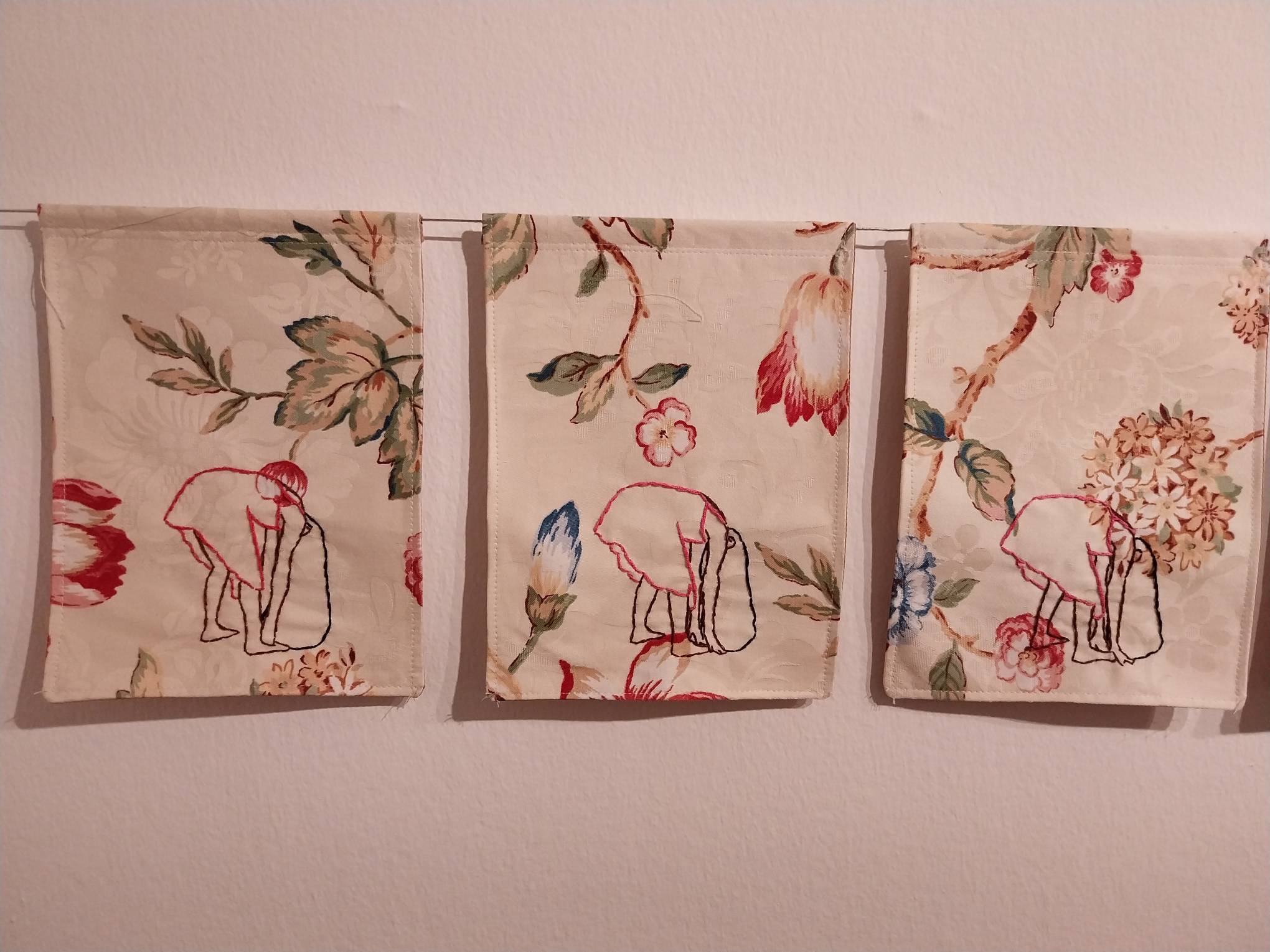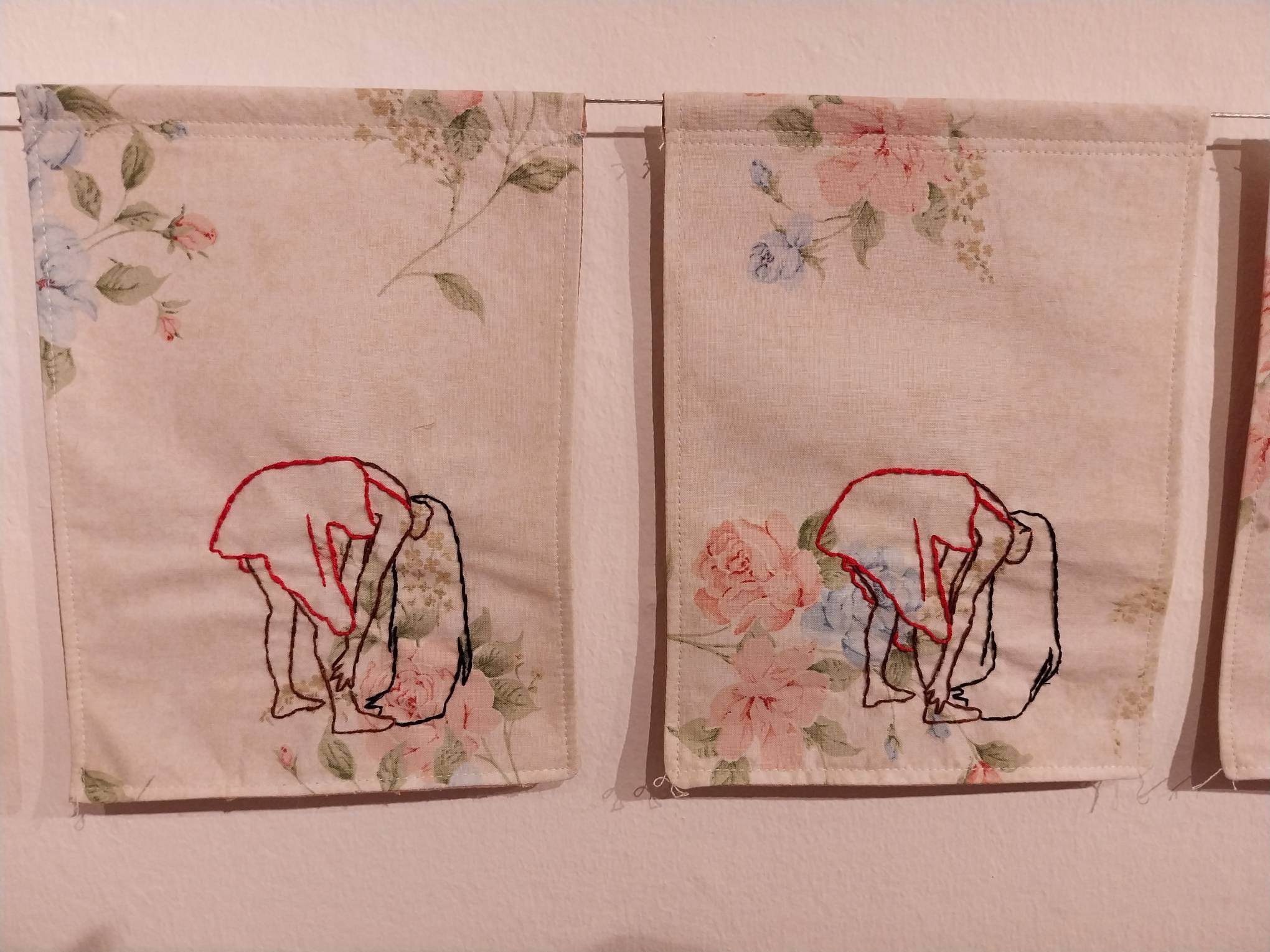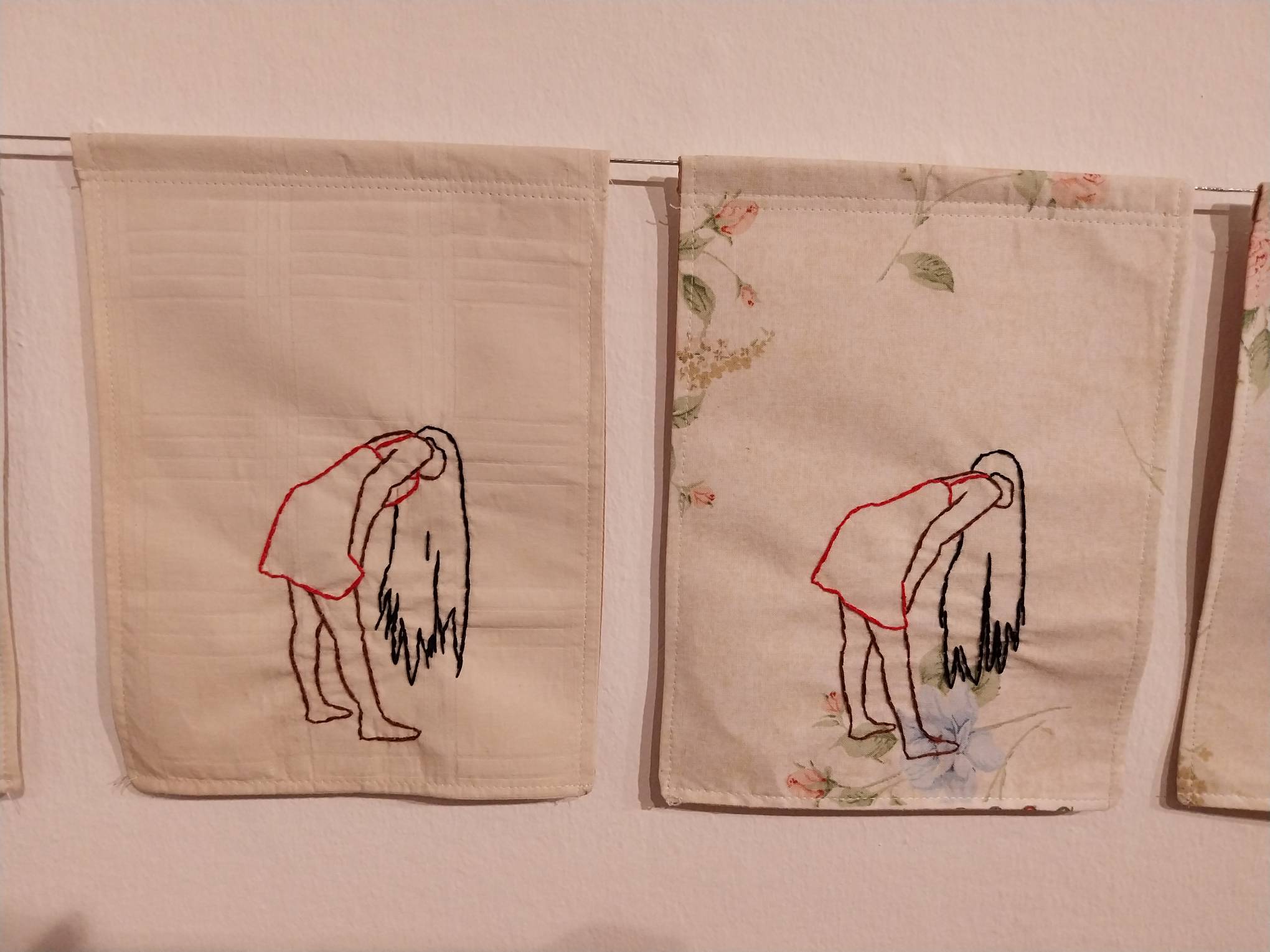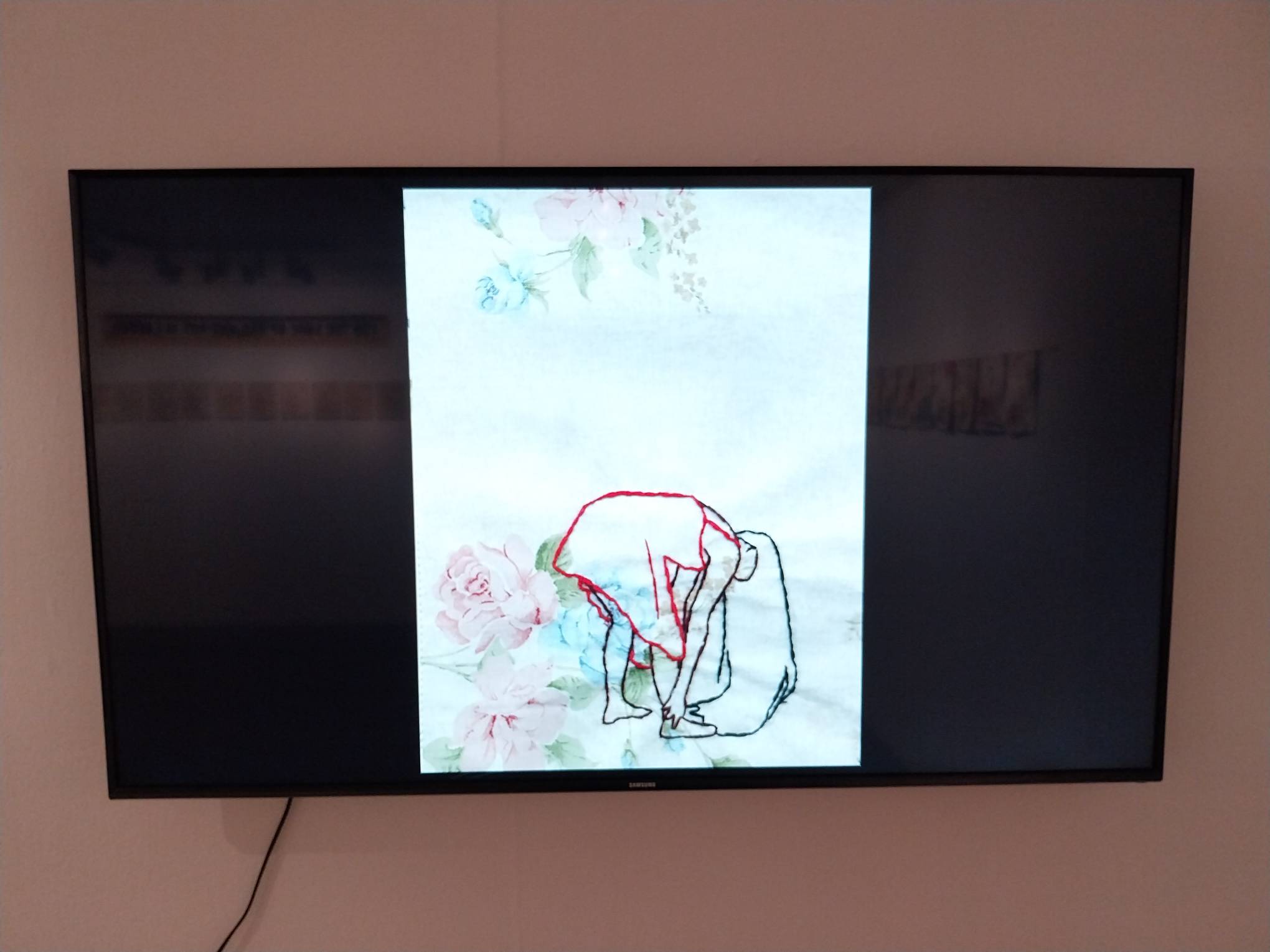 Over 80 pieces of embroidery make up this exhibit. These pieces are featured in a short animated piece made by Tamoria depicting a young woman as she stands up and down amidst an elaborately-changing white and flowery background.