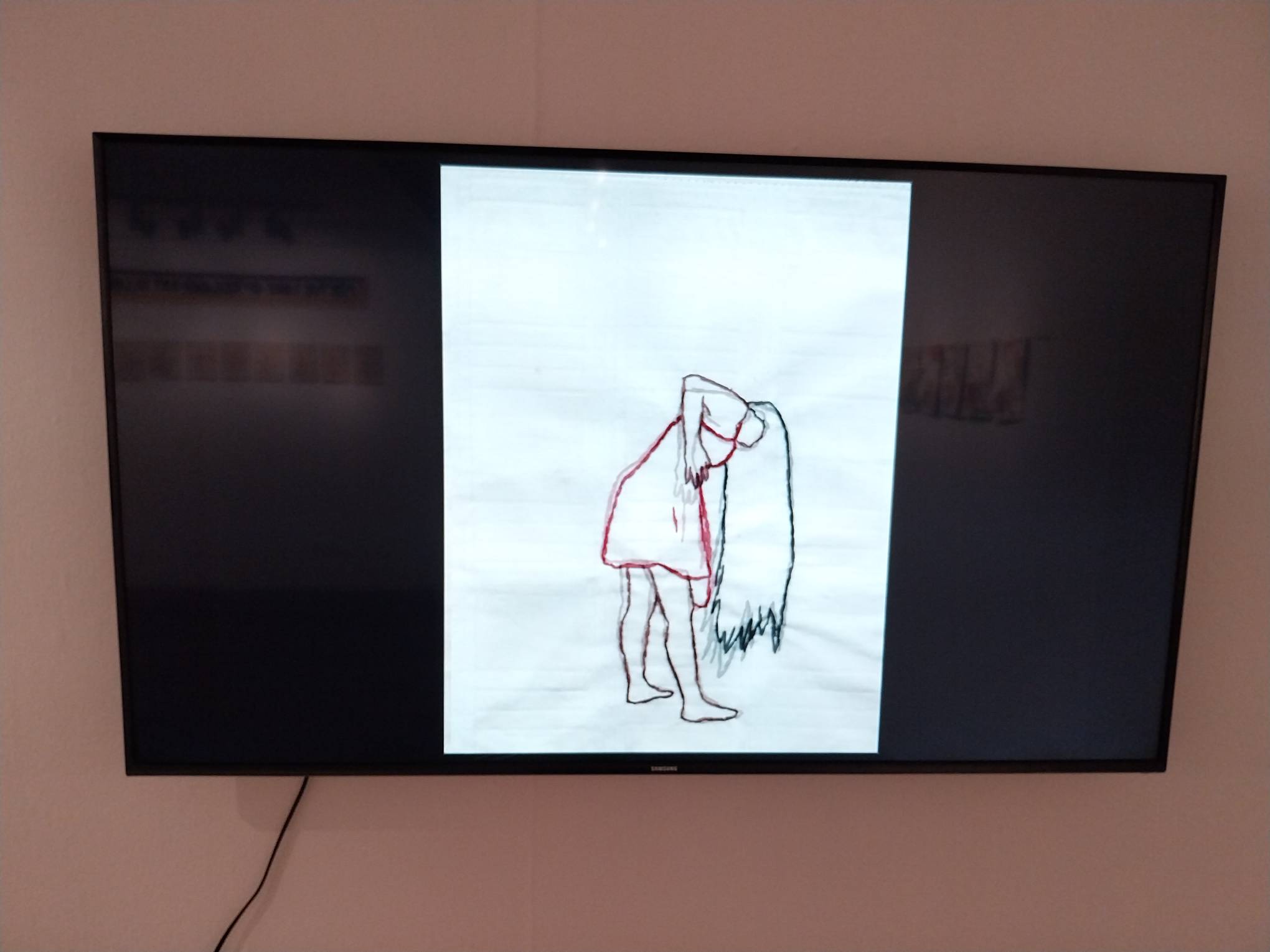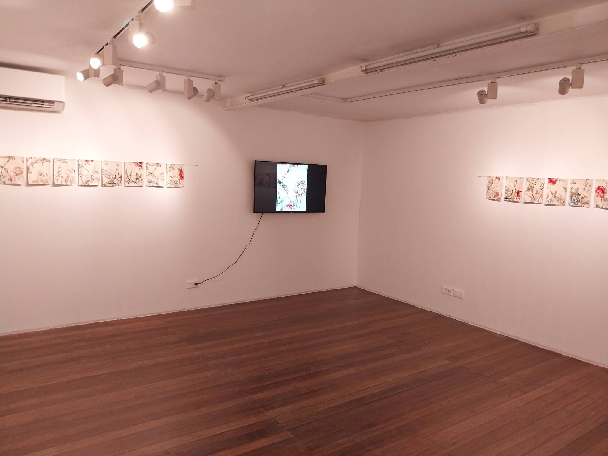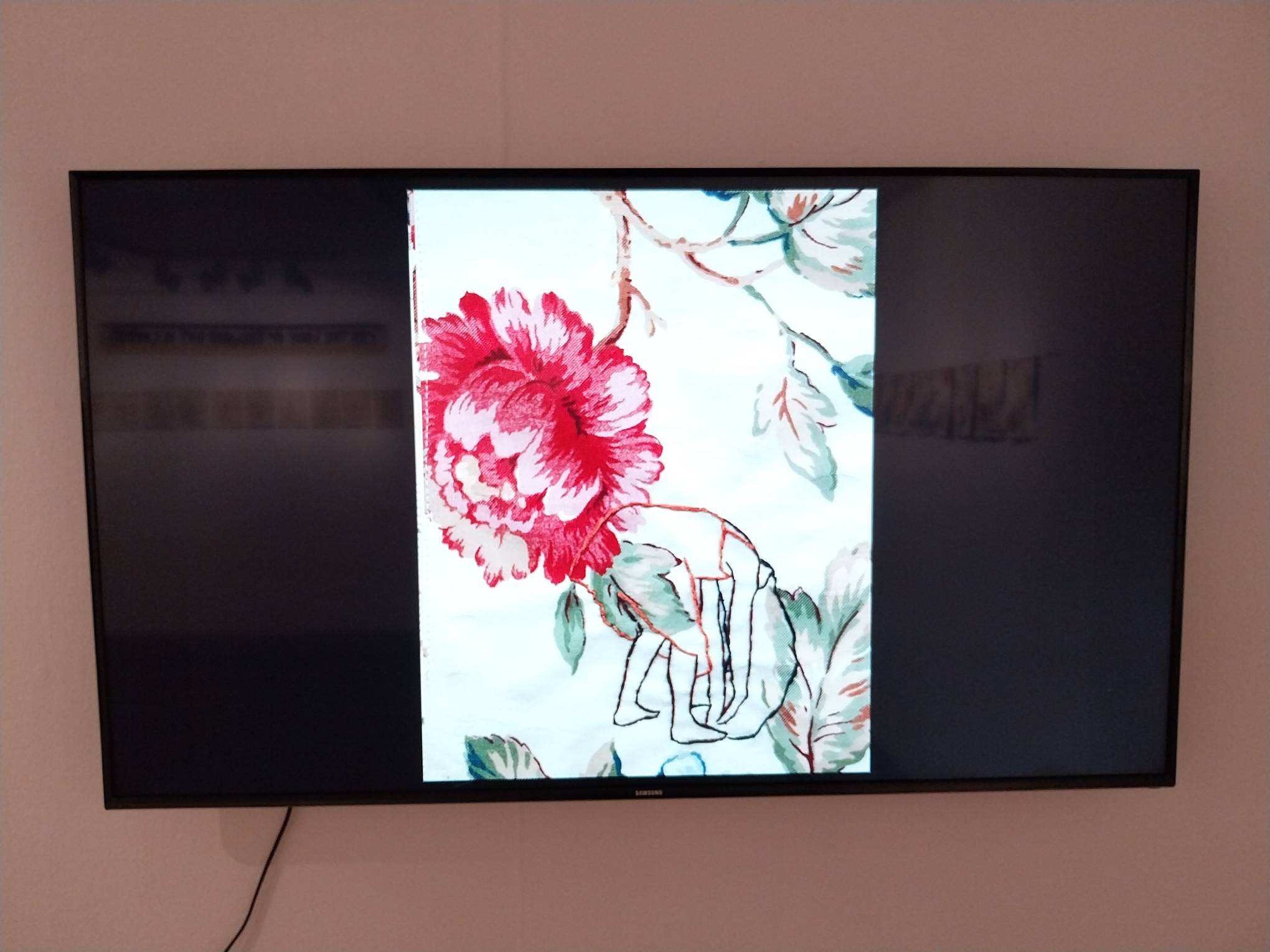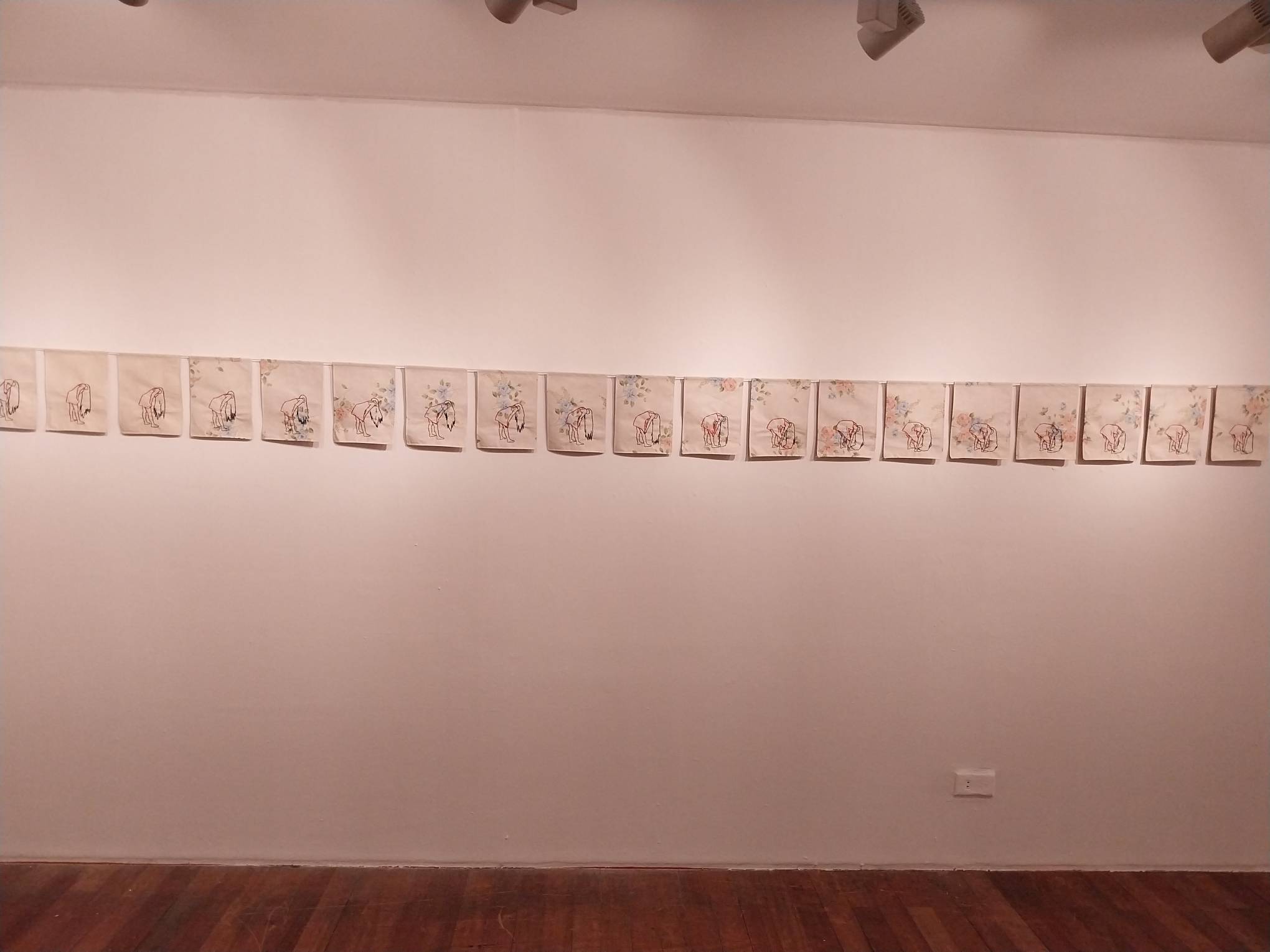 Over 80 pieces of embroidery make up this exhibit. These pieces are featured in a short animated piece made by Tamoria depicting a young woman as she stands up and down amidst an elaborately-changing white and flowery background.