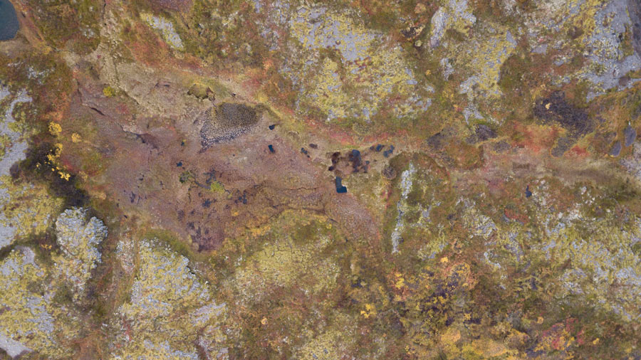Landscapes of the northern hemisphere are presented alongside aerial views of Luzon. Yao generates perplexing photographs that reveal the process of conceptualizing them. The reflective qualities of green, blue, and silver in the wild landscapes and glaciers of Iceland produce illusions of texture. Flowing lines of water bodies and the topography are in conversation with hard-edged blocks of oranges and browns. The drone photo places the viewer in the position of a satellite, an omnipotent vantage point. And the distance, which cannot be achieved without technology’s help, removes one from the ordinary experience of a place.
