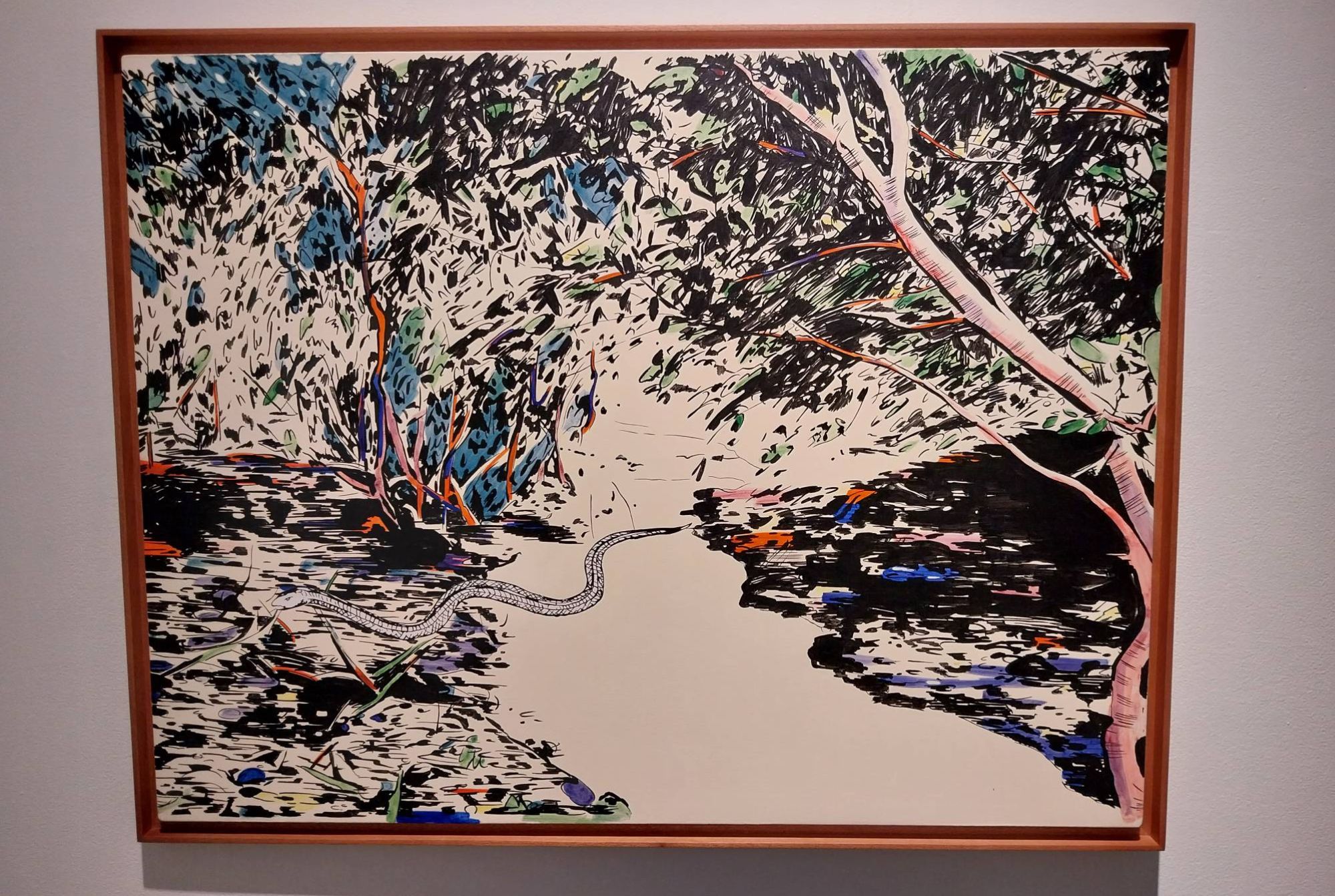 “Land Poetics (Encounters)” is especially wonderful to see. That painting reminds one of Bill Watterson’s more splashy Sunday comics because it feels alive, like the whole forest is swaying along within this stream. The colors pop out in different ways, and the mixing and usage of different shades portray a living history that feels intentional and aligned to the exhibit’s purpose.