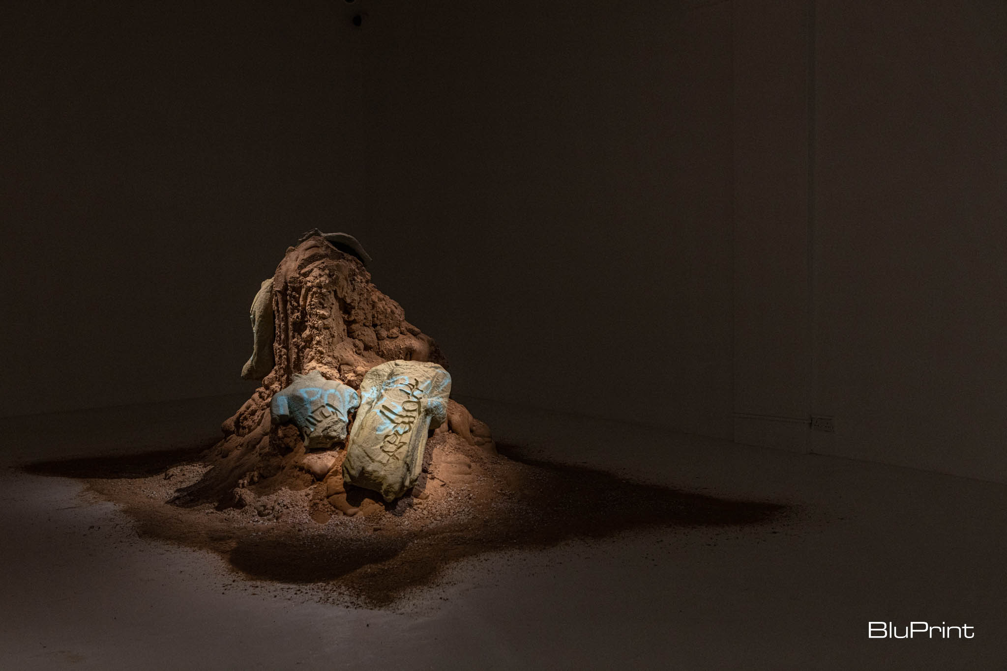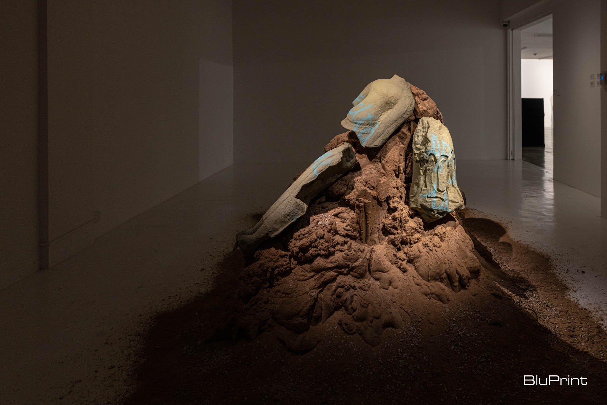 The exhibit transforms one room to look almost like an archeological dig site set under much dimmer lighting. Torsos lie on a mound of dirt with Apollo 14 etched on one of the statues with light blue graffiti sprayed across it. “I’m also like a bit of a paradox. I love very clean curation but at the same time I like a lot of drama! You know, scenography,” he says. “Given that this was the longest body of work that was going to be produced for Déjà vu, I wanted to have a presentation that would really almost concretize the speculation that Natee started with – that the Buddha had gone to the west.”