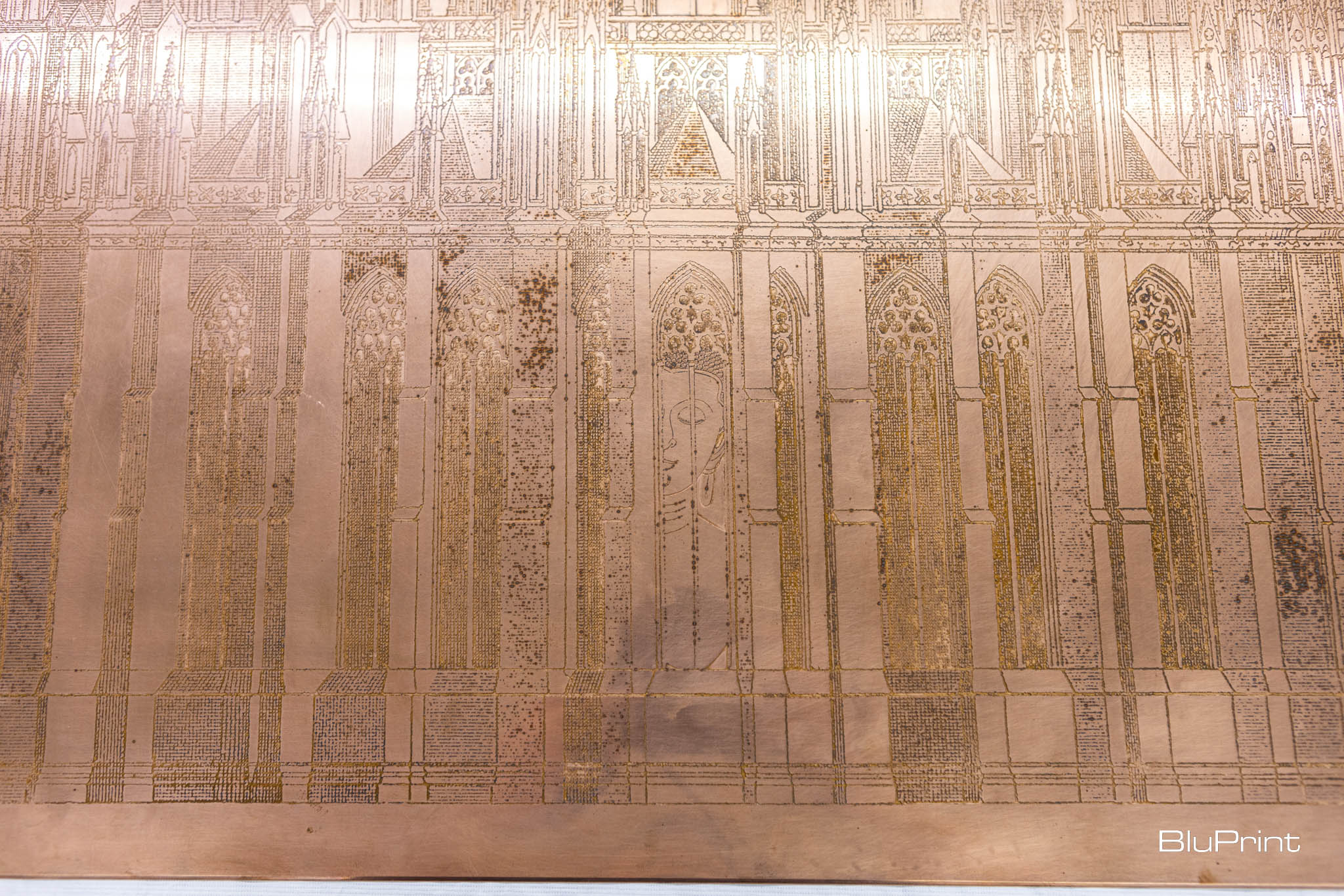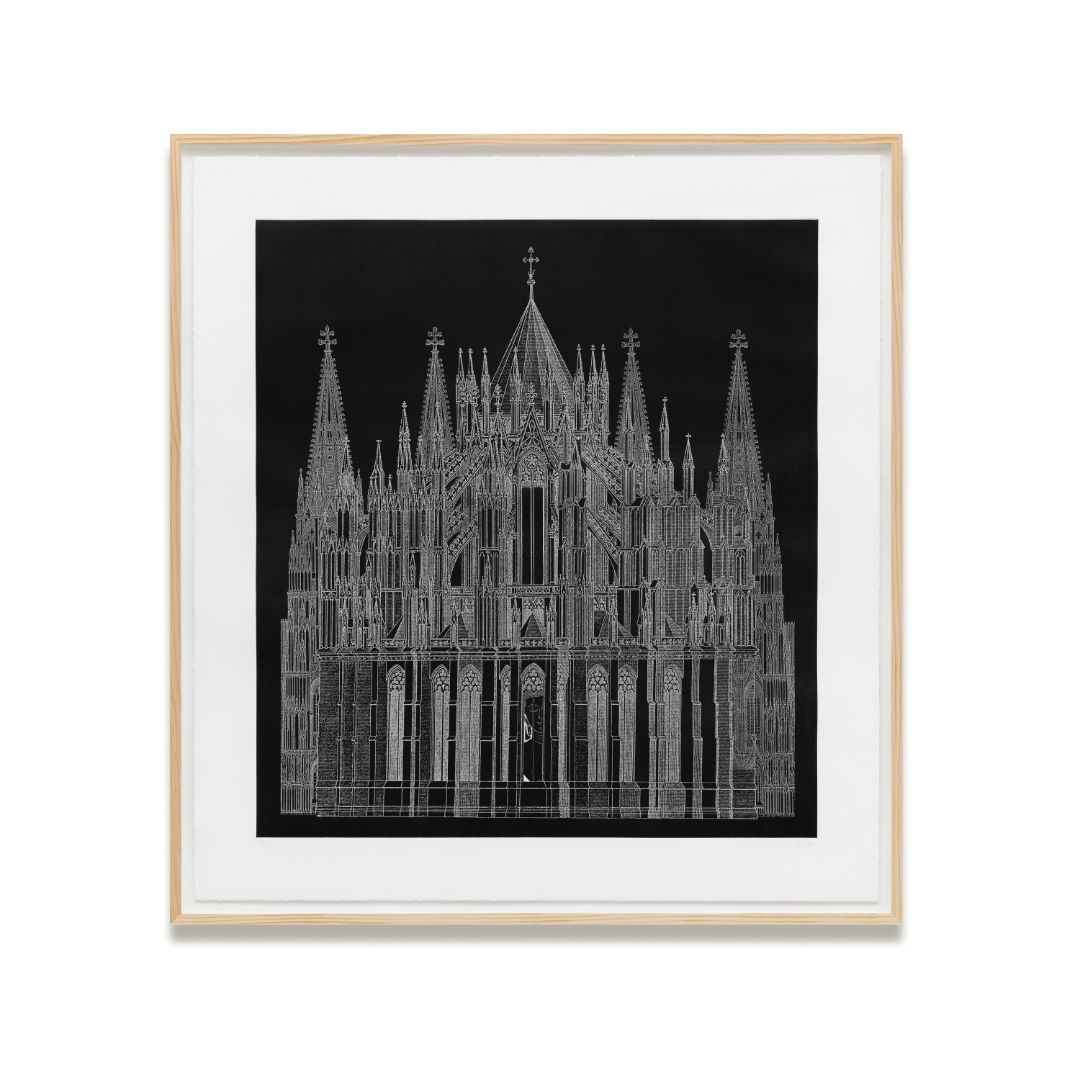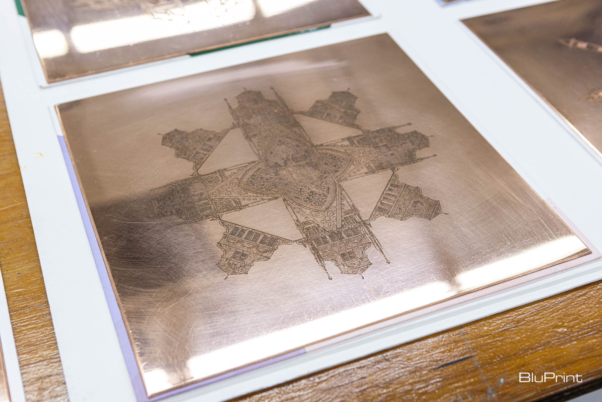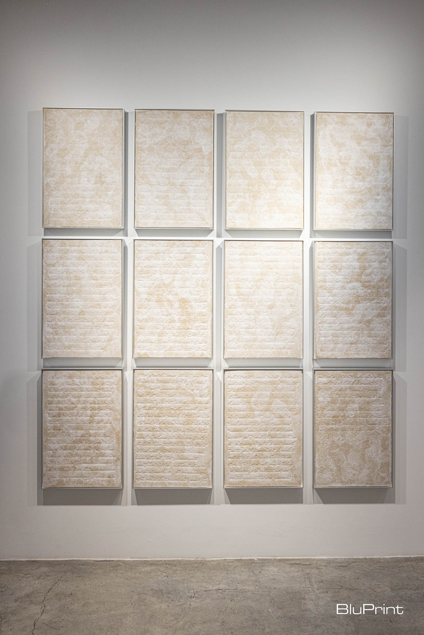Utarit plays with different iterations of paper thanks to STPI’s capabilities. HEAVEN is an etching on paper of a gothic cathedral with the face of Buddha on the front door. THE WHEEL relies on the intricate textures of the paper to subtly reveal the wheel of Dharma. THE VERSE is compressed paper made to look like tablets of stone with gold writing debossed on to them.