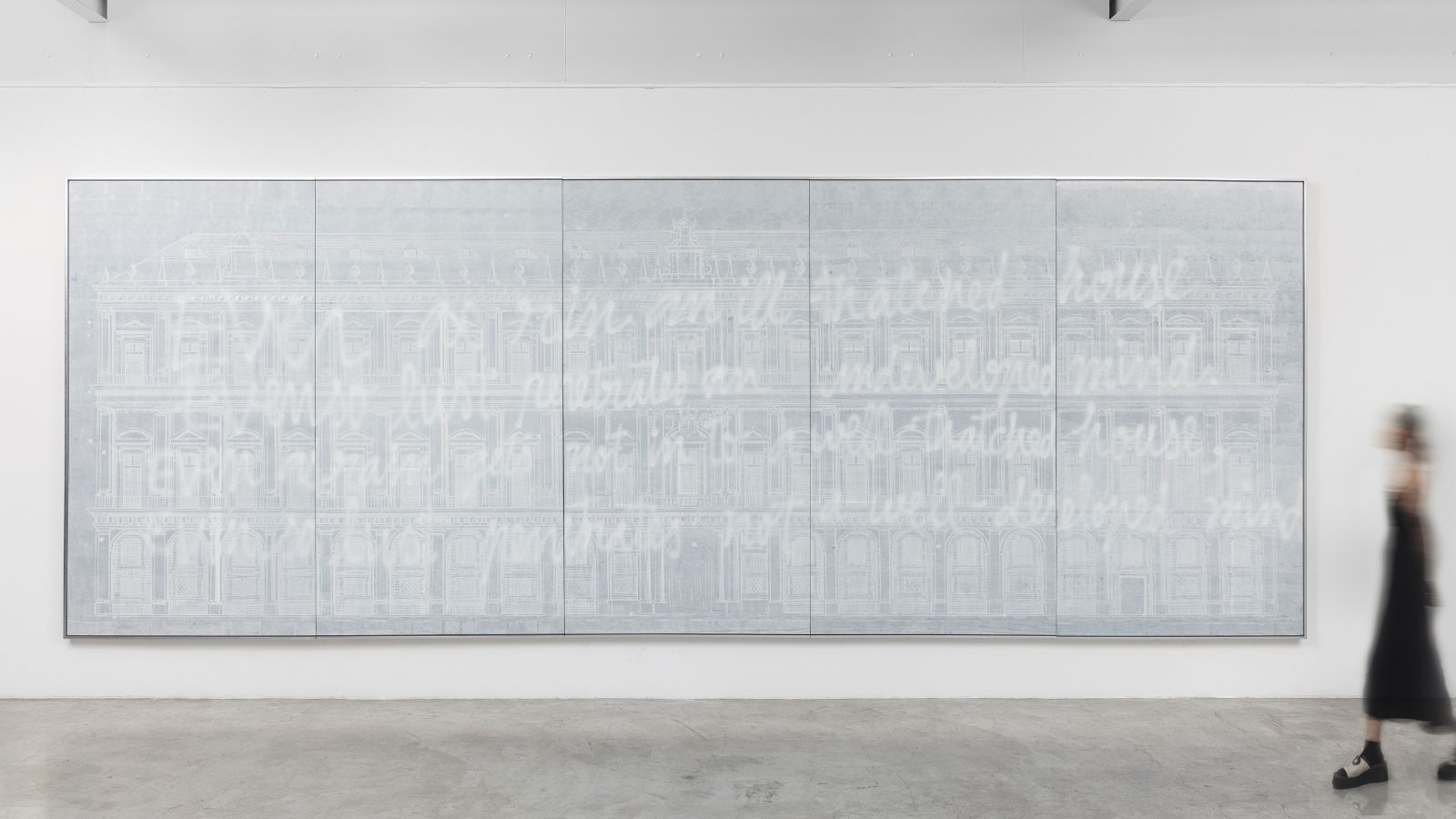 Natee Utarit’s largest work is a 5 panel screenprint and flocking artwork. It spans six meters long, presented in two versions: BUDDHA PALAZZO (a.m.) (2024) and BUDDHA PALAZZO (p.m.) (2024). The artwork features a structure resembling the Royal Palazzo in Naples. Created using a technique called flocking, small fibers resembling the texture of felt adhere to a surface with adhesive.