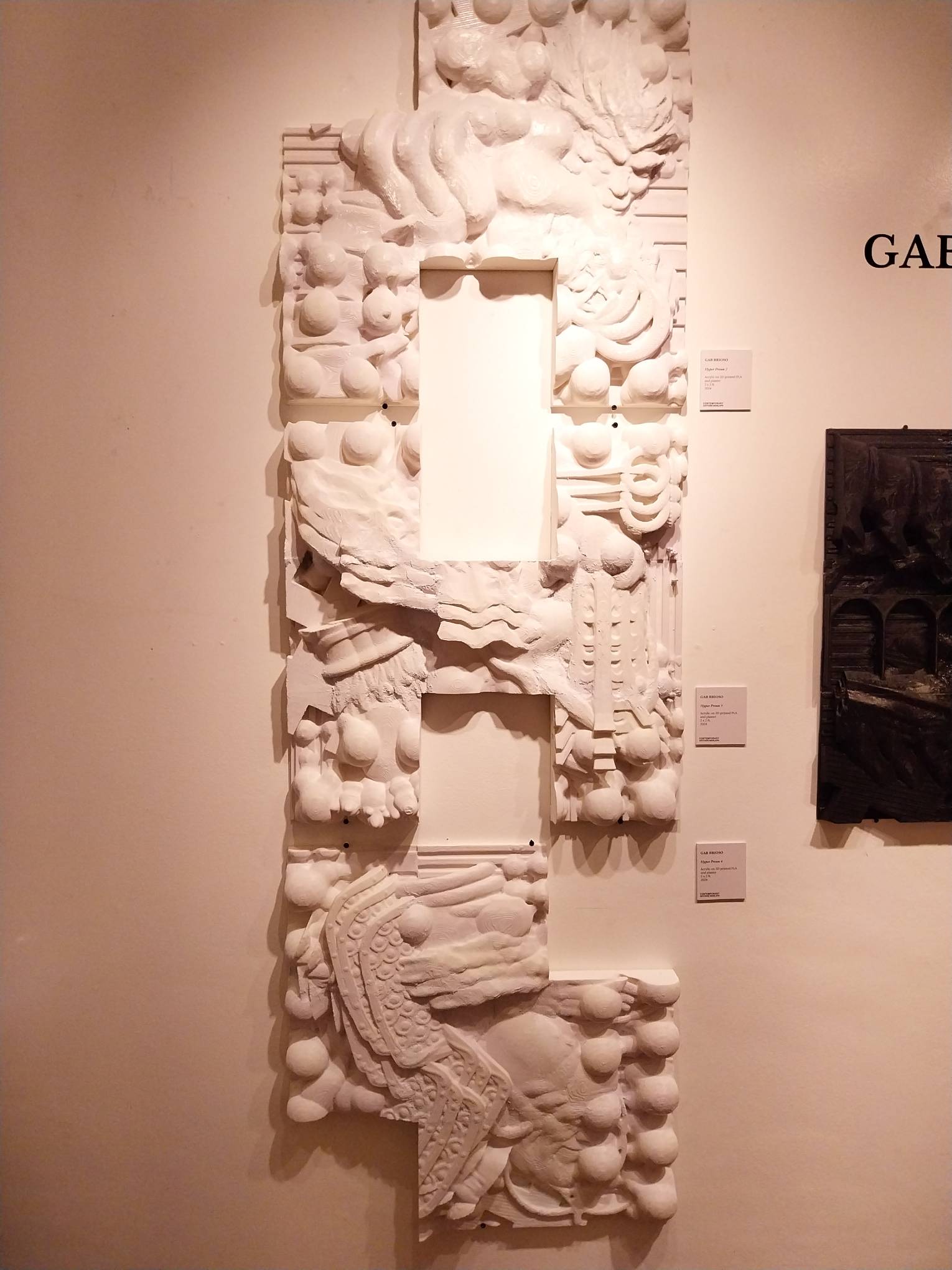 It feels estranged to “definitive meaning” in critiquing our society as it leans towards ambiguity instead. The works feel similar to H.R. Giger, both in the tactile sense of architecture, and largely because it feels like Prioso attempts a similar impression of hieroglyphics that Giger did, seemingly compressing a whole history together.