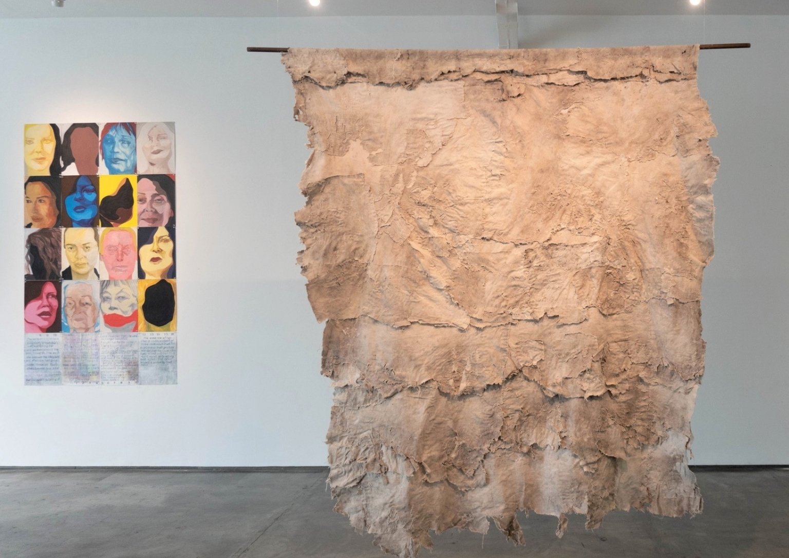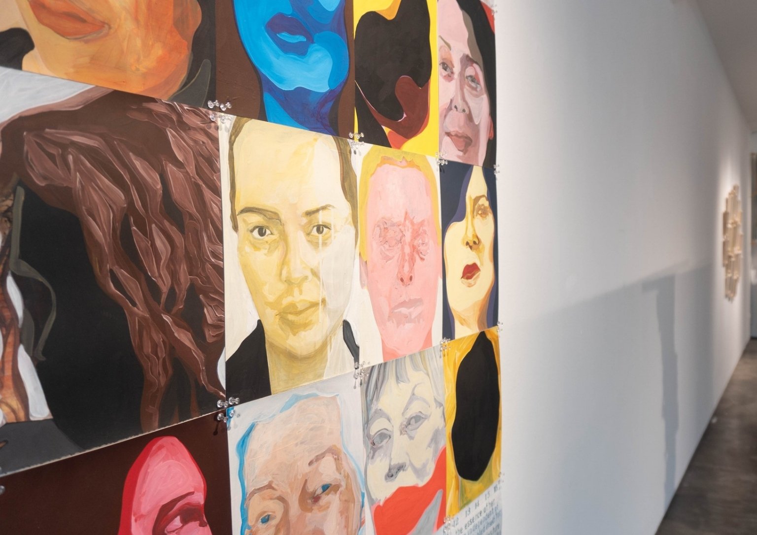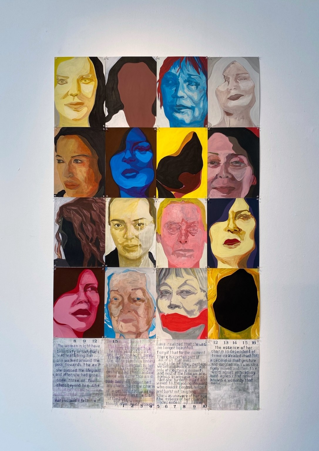 Mixed Media artist Maya Munoz is known for works that tend to be symbolic and expressive. She presented a work consisting of a set of four text-based works made in 2021. She patched together with the series of 16 new portraits from 2022. While the texts are airbrushed using stencils, used on the portraits were combined latex paint from the hardware store with pure pigments from a local silkscreen printing company to manipulate colors and create more opacity. Built together into a grid, like a patchwork quilt, the artist plays with the idea of “stitching” not as a literal sewing process but as a putting together of recycled works made over different periods.