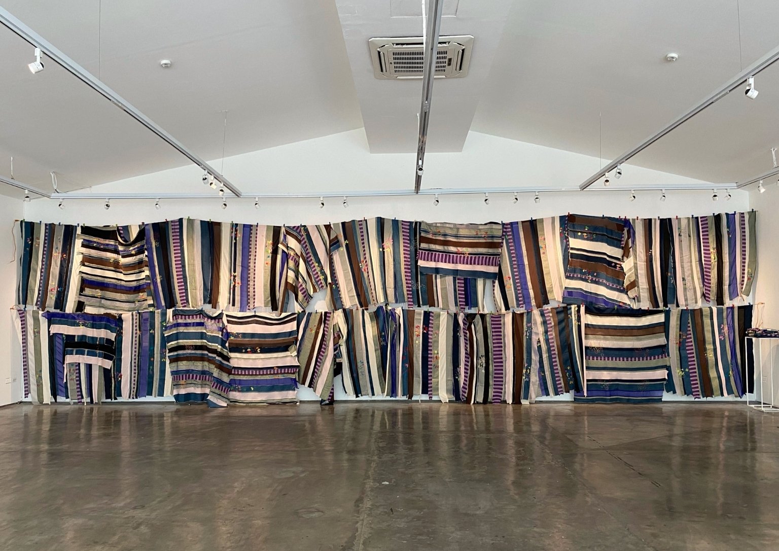 A massive installation by designer Carl Jan Cruz takes center stage at Gallery Two. He recently presented at the group exhibition “The Endless Garment” in Museum X, Beijing. This marvelous installation comprises 21 quilts reminiscent of local blankets, made of fabrics developed with his team, in strips of varying weights, partially embellished with embroidery. He comments that Boro is certainly a sincere and practical craft as it shows similarities in the Philippines. Further, it will always be relevant, as it mirrors our cultural attitude toward handling, caring, and preserving.