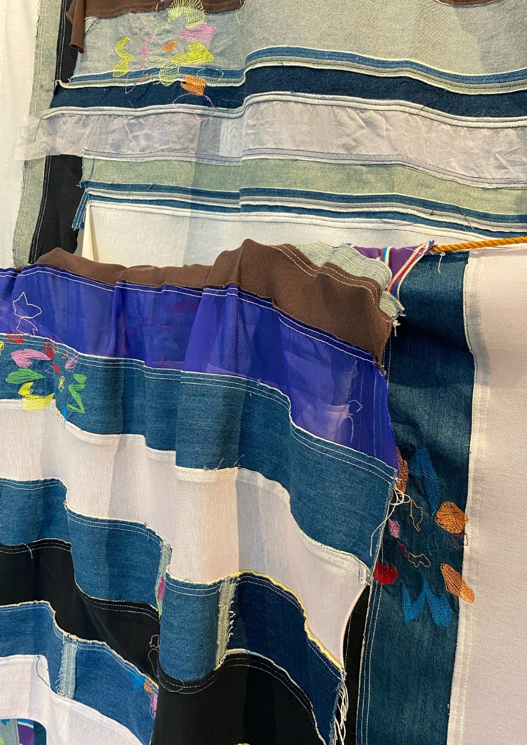Winnie Go, whose past works suggest an affinity for the beauty of nature with a curiousness towards origins and the concept of growth, stitched together found vintage textiles. These are with sashiko thread, incorporating them with repurposed celluloid, ceramic, or Bakelite vintage buttons in rare and precious shapes. Indigo-dyed with freehand stitching are some of the materials that she learned through her master in Japan. Other fabrics are cast-off pieces of denim. Then other woven fabrics are from different parts of the world, cut and resewn a few times. Also delicately put together so that each work reveals its own story.