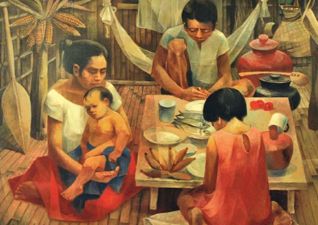 Among these genres were the stock images that populated the social space of the Filipino masses during the mid-20th century: the male cockfighter with his prized fighting cock in his arms; the female street vendor with her bilao; mothers carrying their children; women sewing at home or just lounging around; still life arrangements of platefuls of seafood; landscapes full of trees; families gathered over a frugal meal; and the iconic barung-barong shanties that arose out of the devastation of World War II to fill every nook and cranny of Manila.