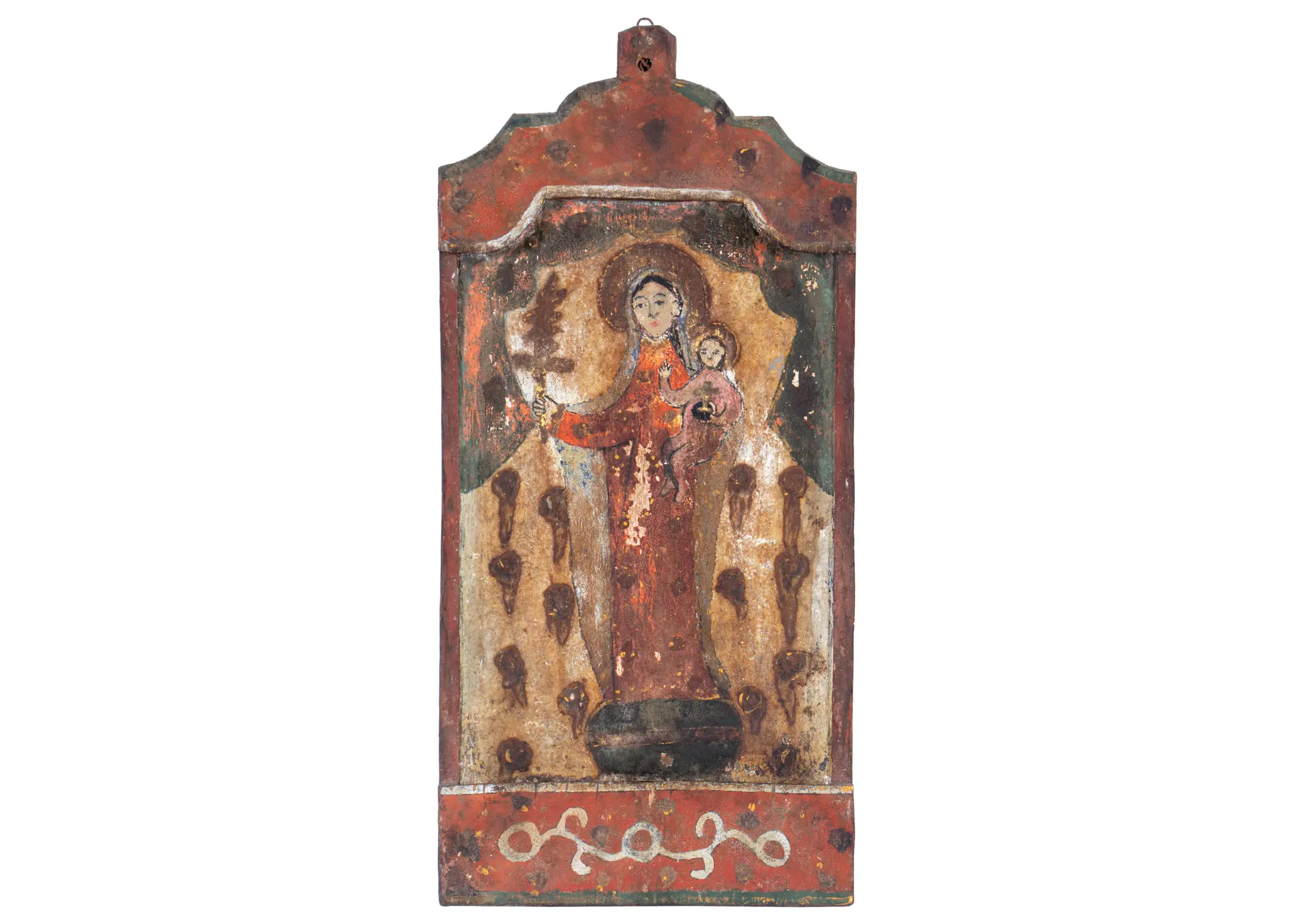In addition, religious artifacts from the 19th century reflect the nation’s colonial past: a San Isidro Labrador under a cartouche and foliated pediment icon; an ‘Our Lady of the Most Holy Rosary’ under a jutting lambrequin icon; and a full-sized Baroque Revival urna in a rich vermillion color.