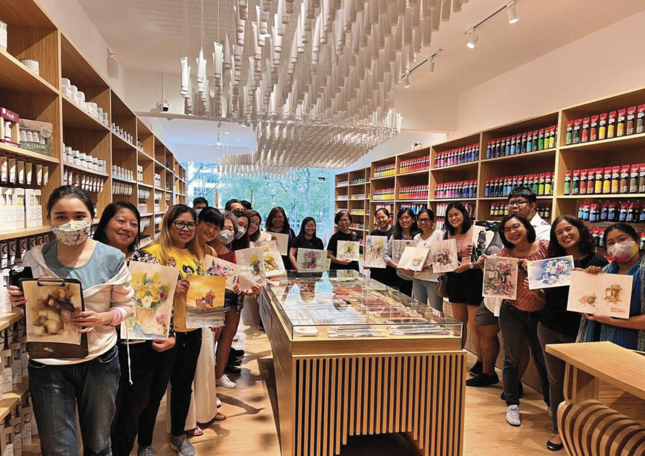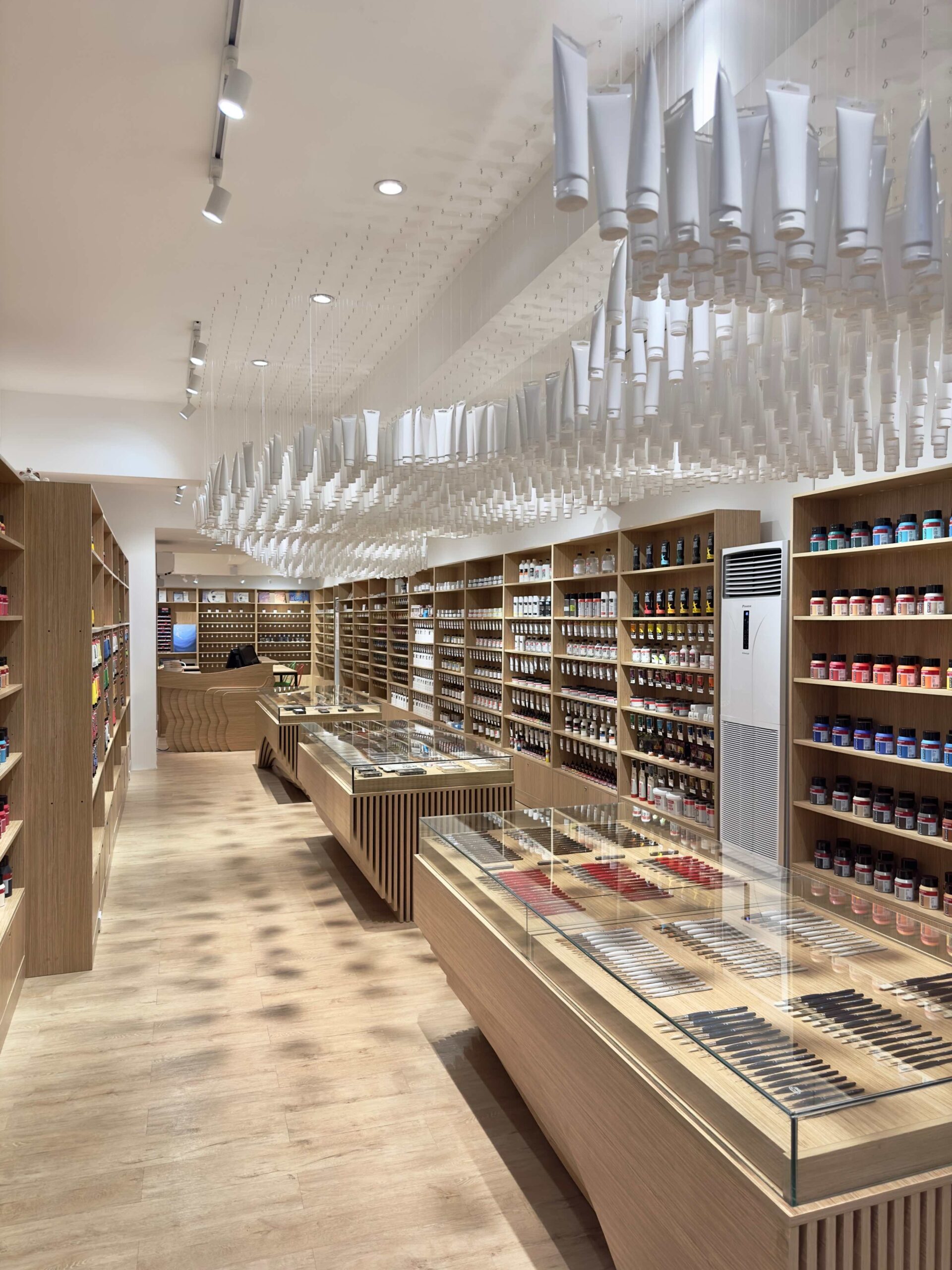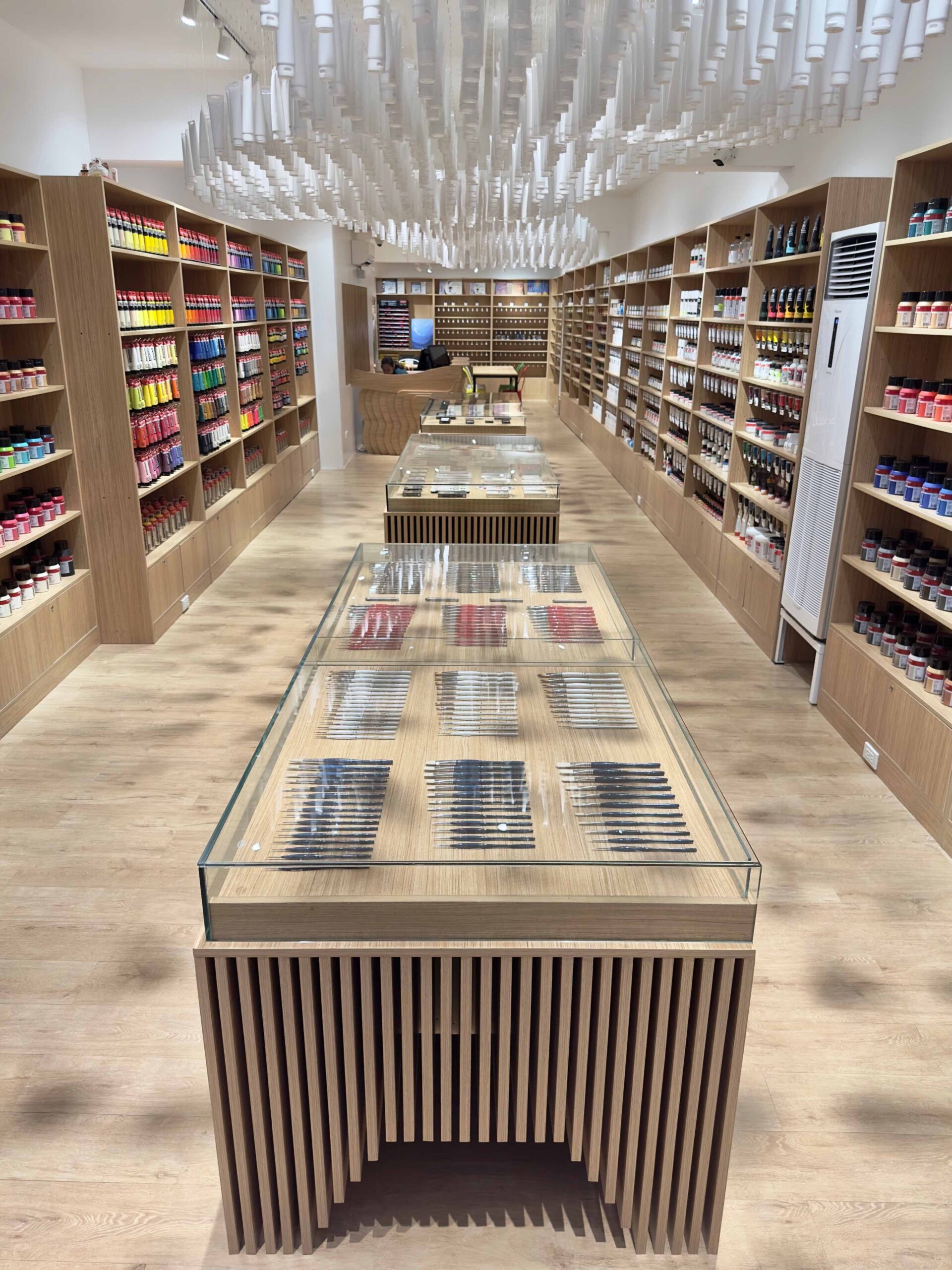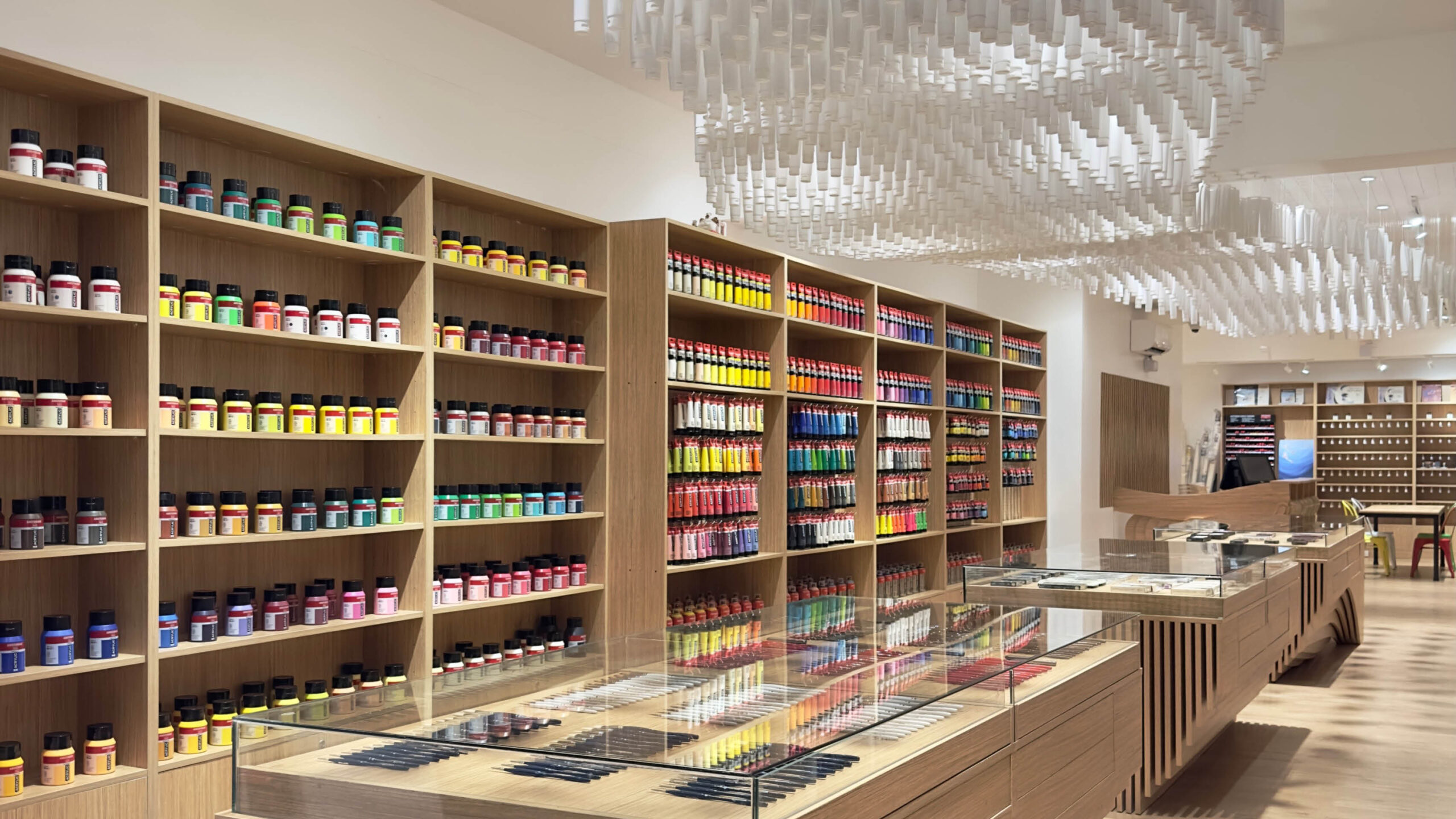 The brightly lit 128-square-meter space was designed to convey just that. Instead of utilizing the usual shelves and racks, custom alcoves were built to showcase a wide range of premium, hard-to-find art supplies. They were built not only for display, but clever storage of high quality  inventory as well. Island display tables at the center feature sculptural details that ring in a sense of flow and movement. .