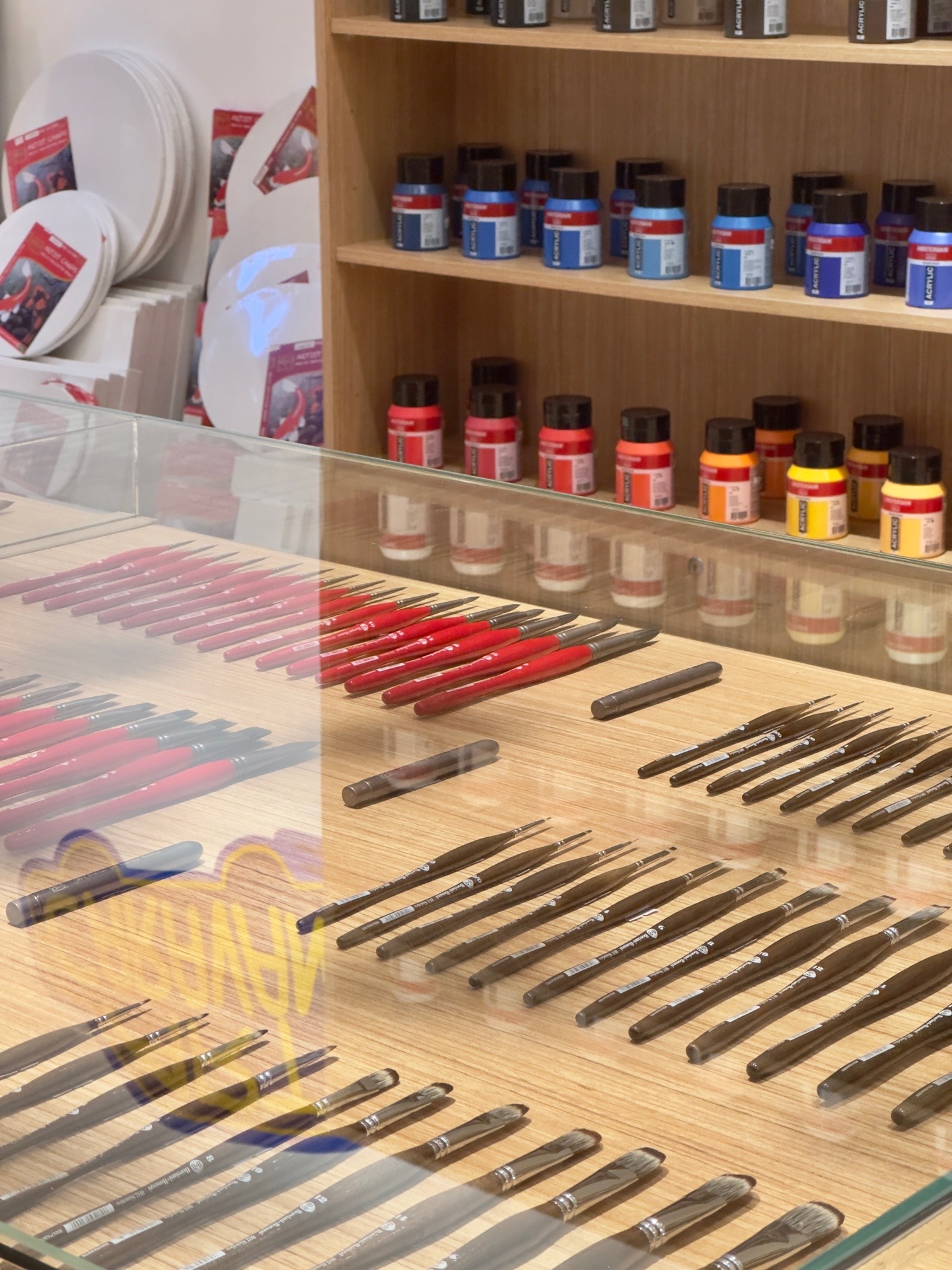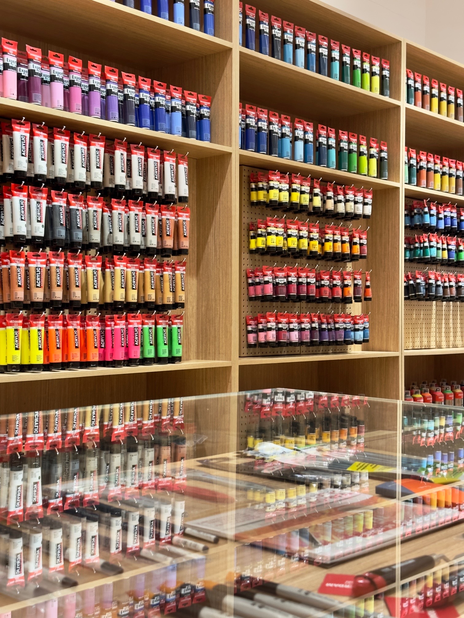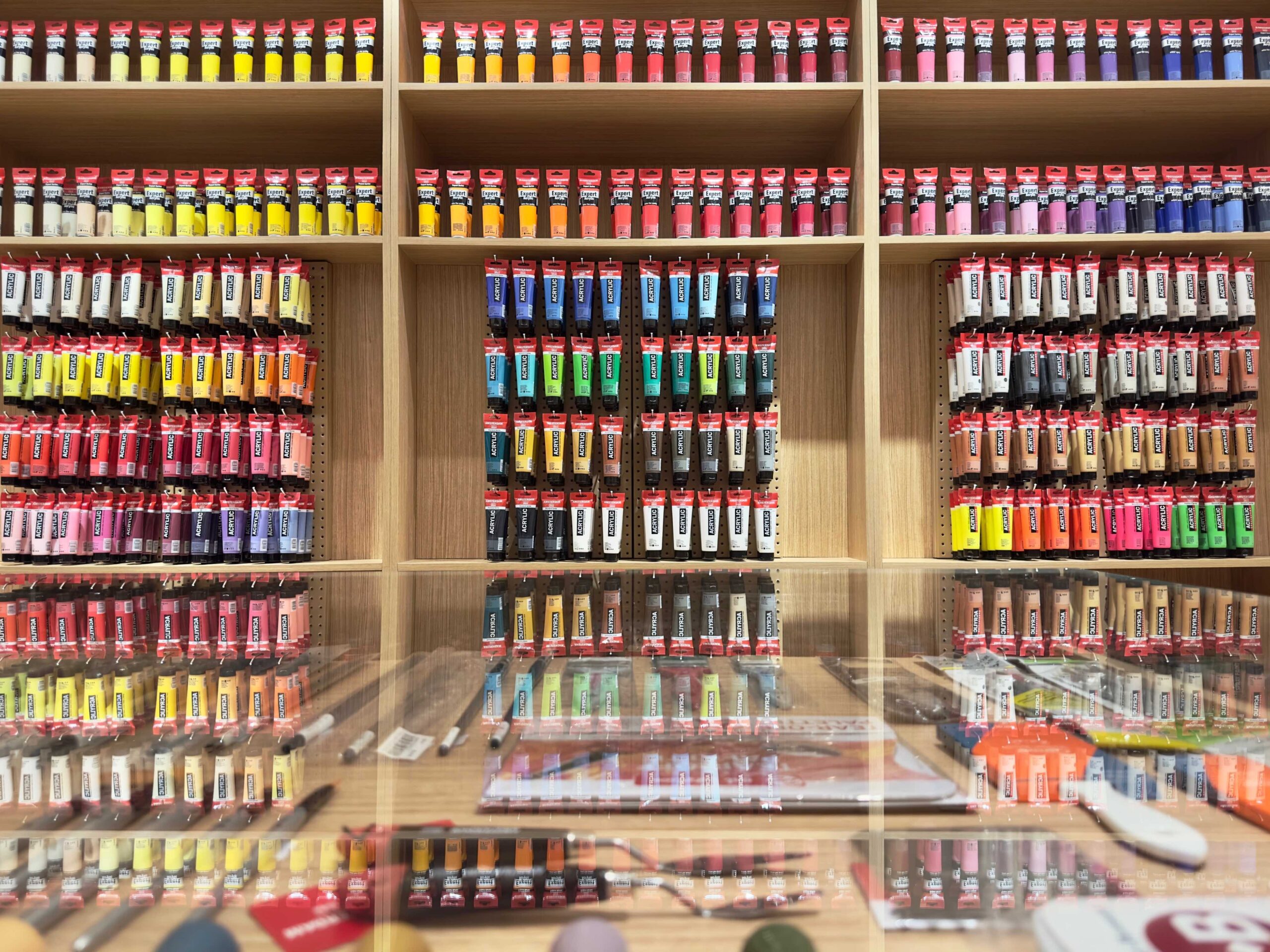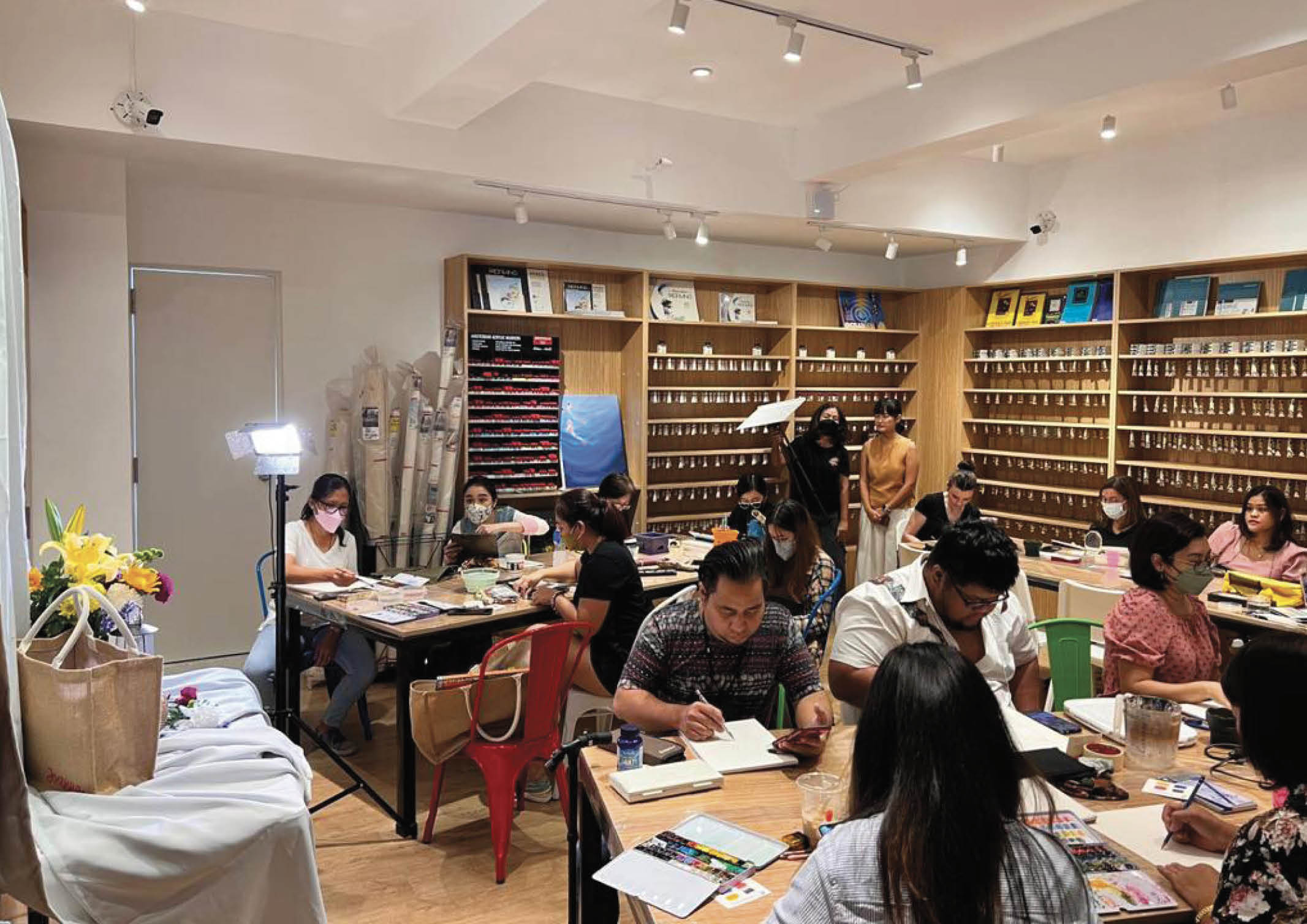The brightly lit 128-square-meter space was designed to convey just that. Instead of utilizing the usual shelves and racks, custom alcoves were built to showcase a wide range of premium, hard-to-find art supplies. They were built not only for display, but clever storage of high quality  inventory as well. Island display tables at the center feature sculptural details that ring in a sense of flow and movement. .